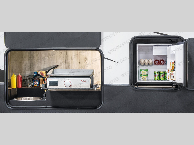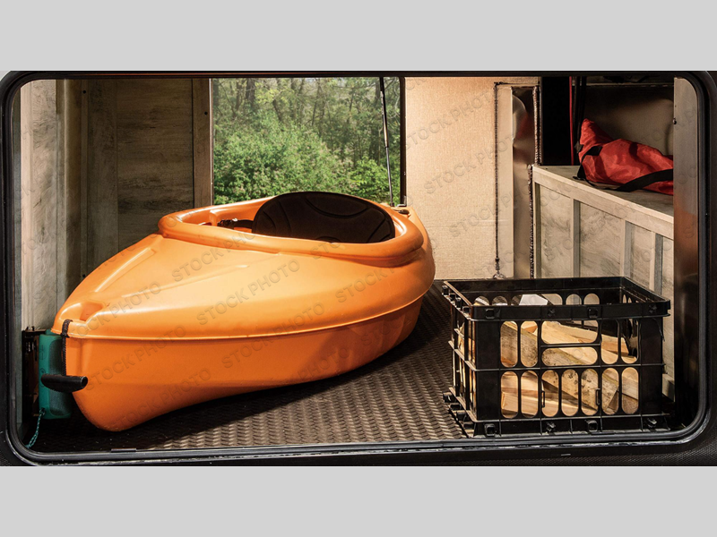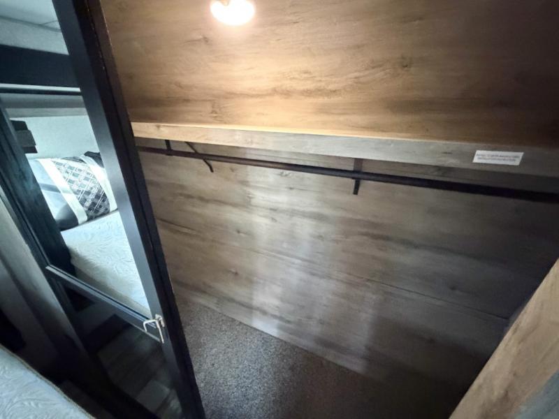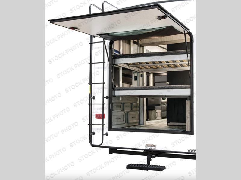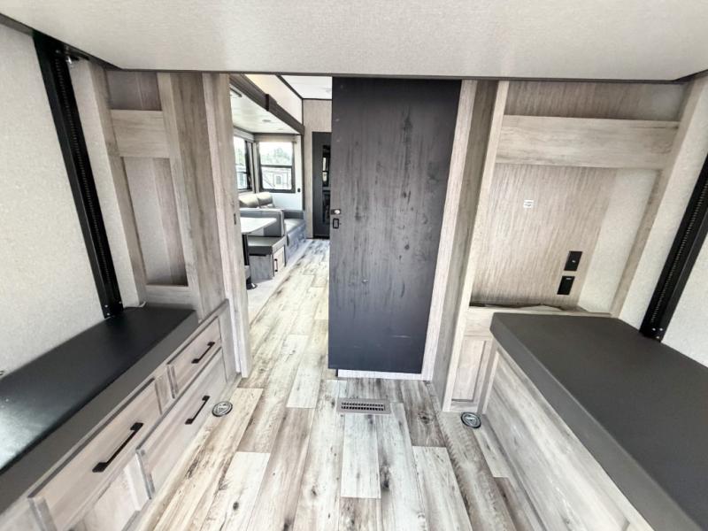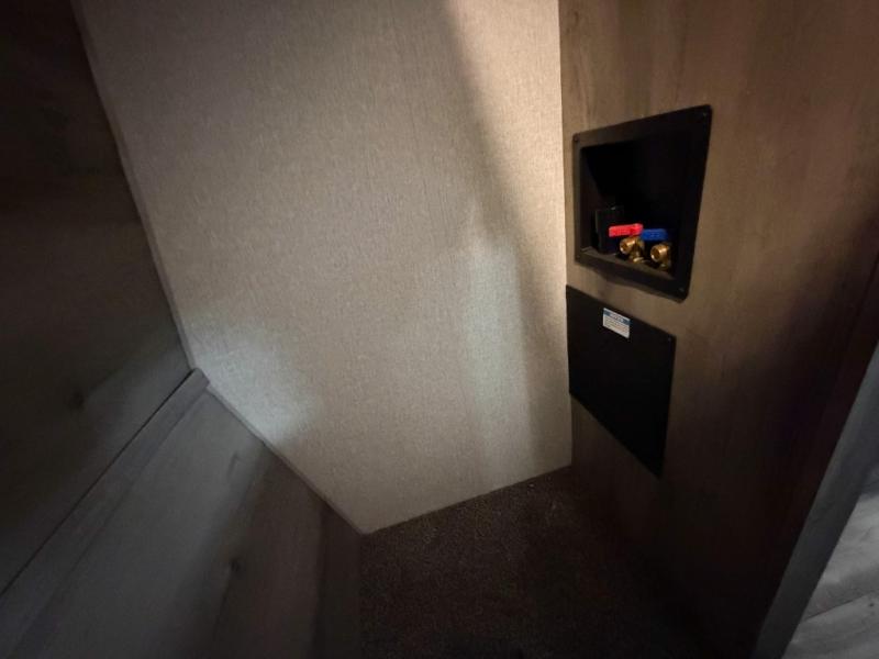 You will have everything you need and then some for a comfortable camping trip with this fifth wheel! There is a rear door that leads into a private area with two 56" x 80" power beds and a storage/entertainment center. As you step into the kitchen you will notice a large residential stainless steel sink for easy clean up, solid surface countertops with sink cover, and a kitchen window to look out at your beautiful scenery as you prepare dinner on the four burner range with a 24" oven. The U-shaped dinette and hide-a-bed sofa slide opens up the living area, as well as provides comfortable places to sit and sleep. The full bathroom has a 48" x 30" residential shower with a seat and a linen closet to keep your towels close. Inside the front private bedroom is a king bed slide across from a dresser with a built-in hamper and a front wardrobe that is prepped to add an optional washer and dryer!