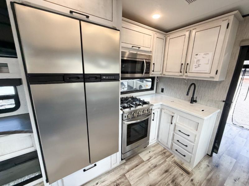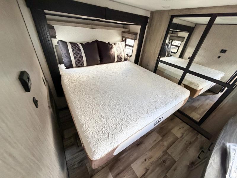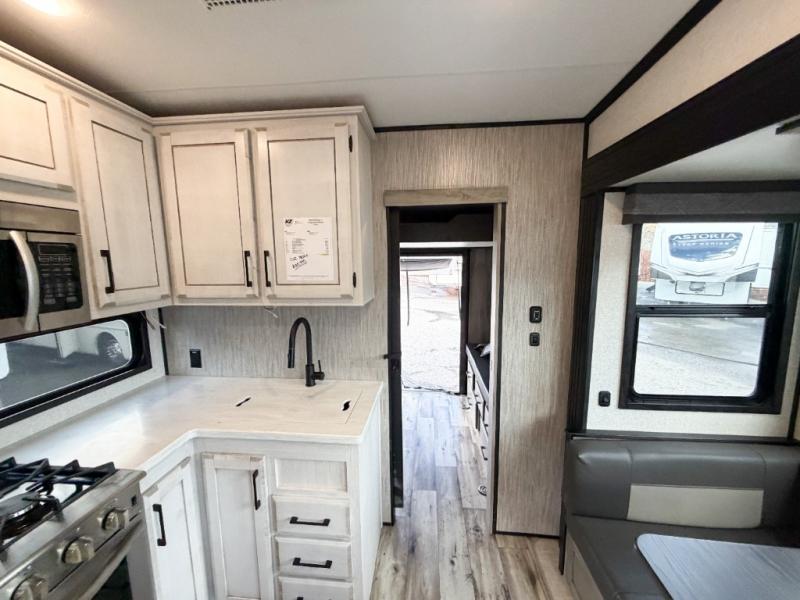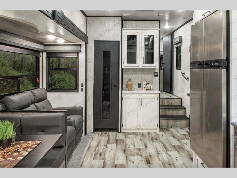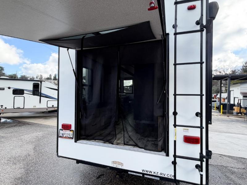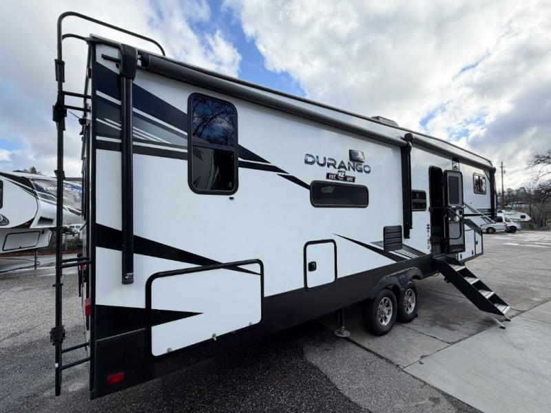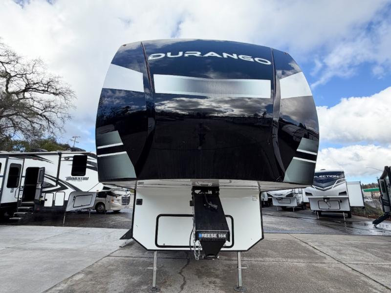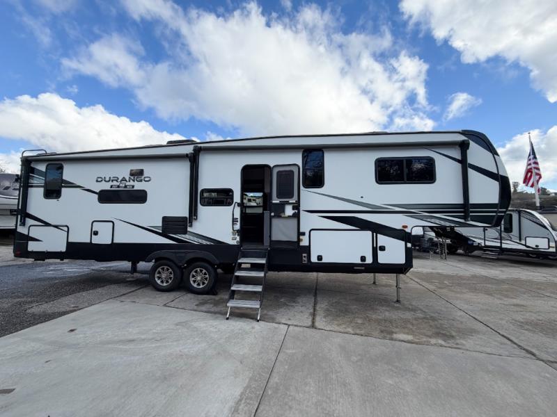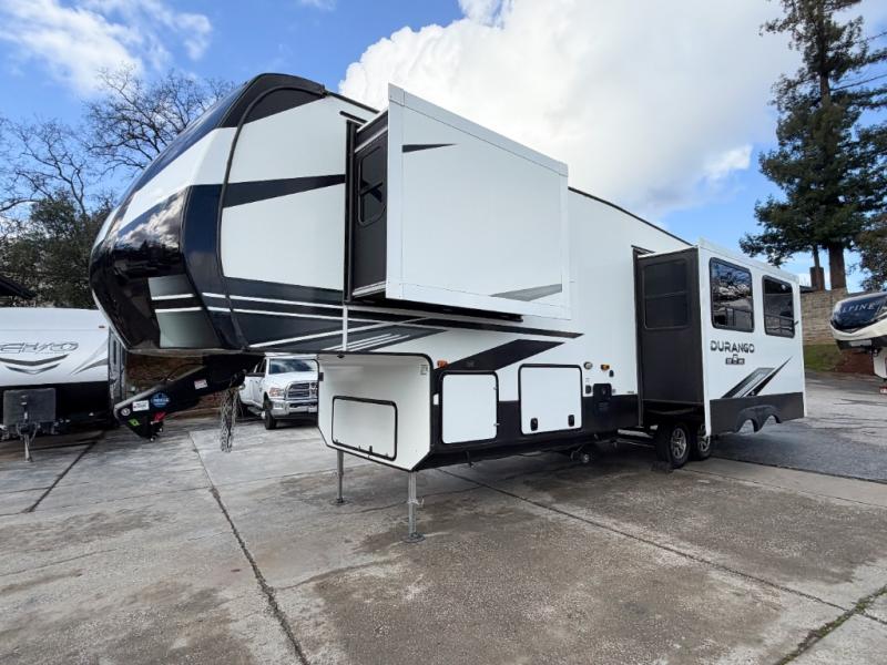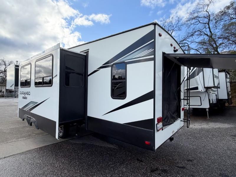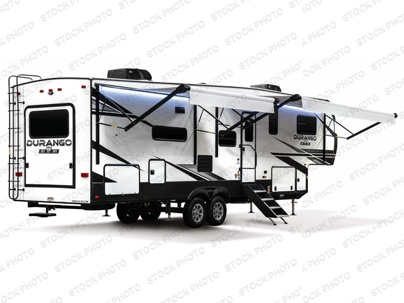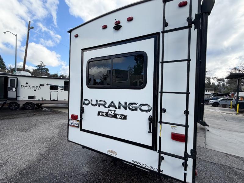 Enjoy full time living, an affordable price, and a wide body construction for more living space with every one of these KZ Durango light high-profile fifth wheels! These luxury units can be used all year round with the all-weather insulation package, the 3" x 14" foam-core in-floor straight-line heating system w/ a 35,000 BTU furnace, and the 15,000 BTU ducted roof A/C which optimizes the airflow by an average of 40% for better performance, cooling time, and reduction of noise. A few other construction features you will appreciate include a one piece, seamless walk-on Tufflex roofing material, Pex® in-floor heated waterlines, a Lamilux® gelcoat fiberglass exterior, and Dexter® axles with self adjusting brakes and height adjusting hangers. You can even head to the woods and go off-grid when you choose the optional off-the-grid solar package. Modern farmhouse cabinetry, a king size bed, and smart TVs will have you feeling like you never left home!