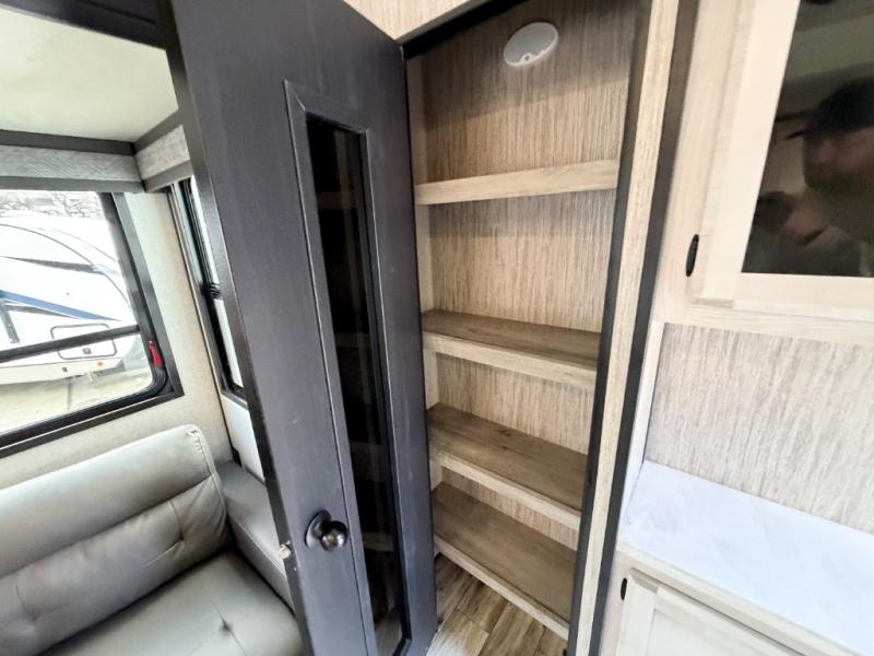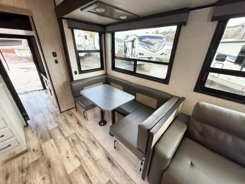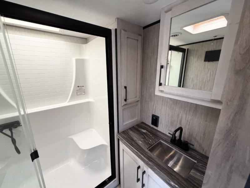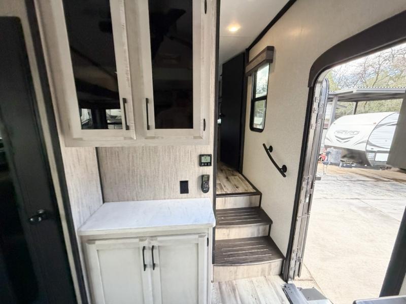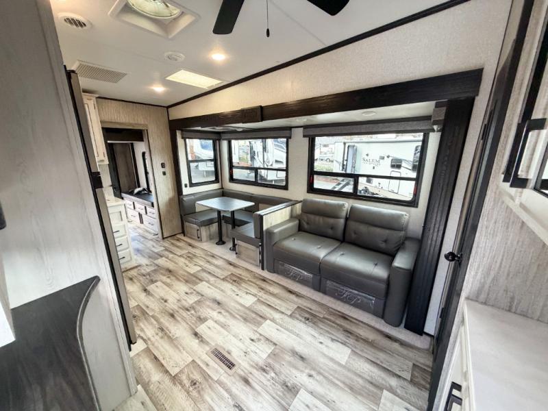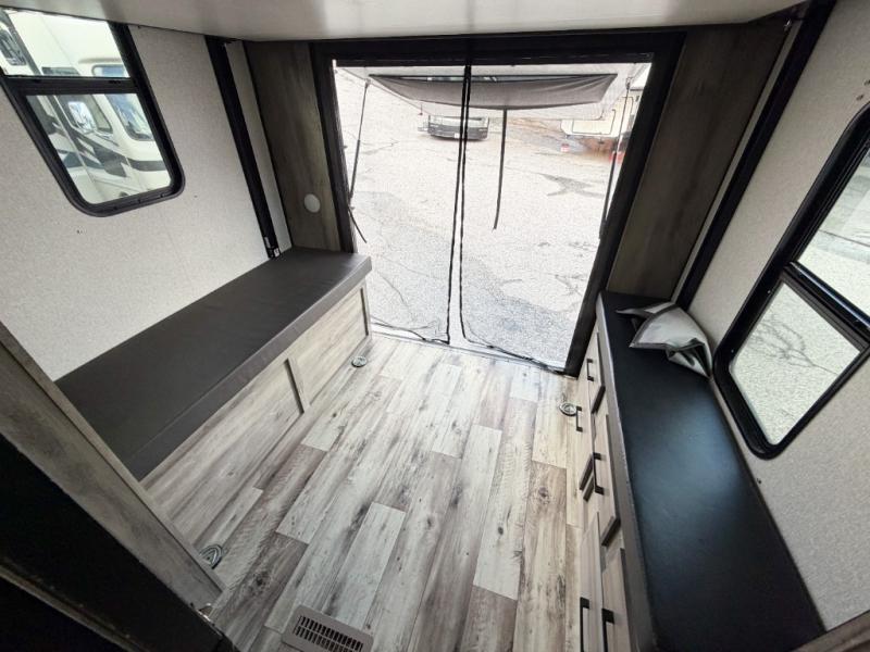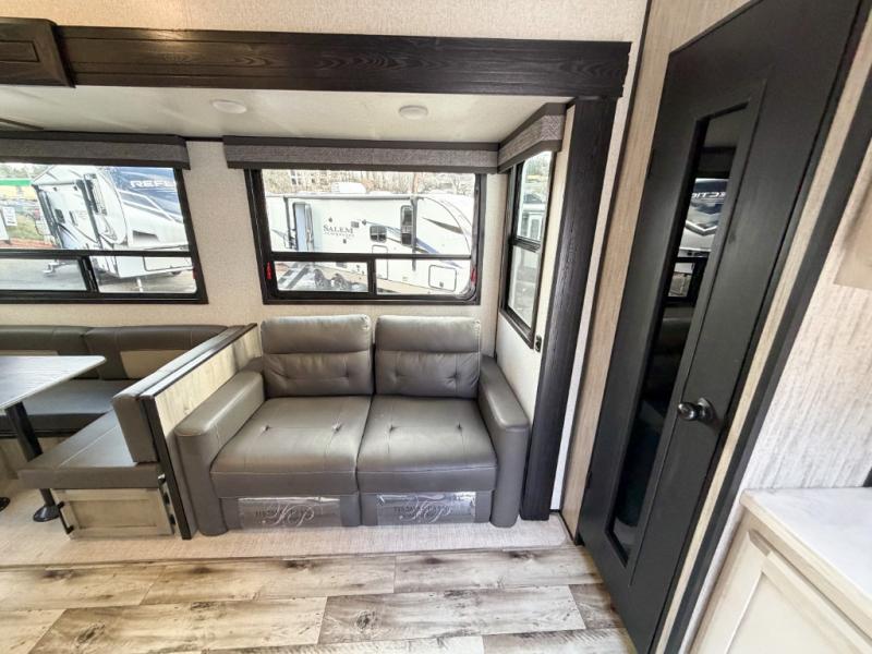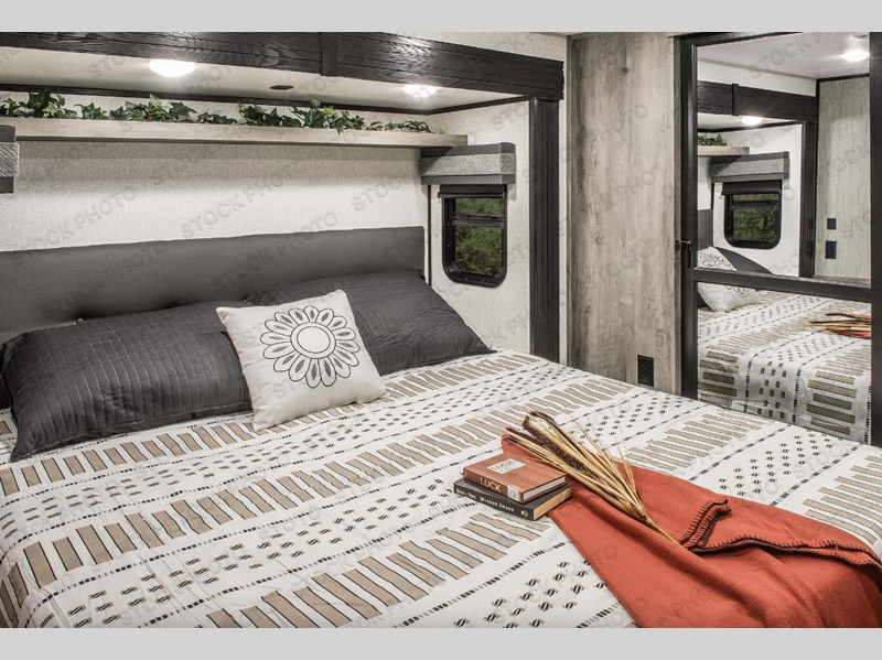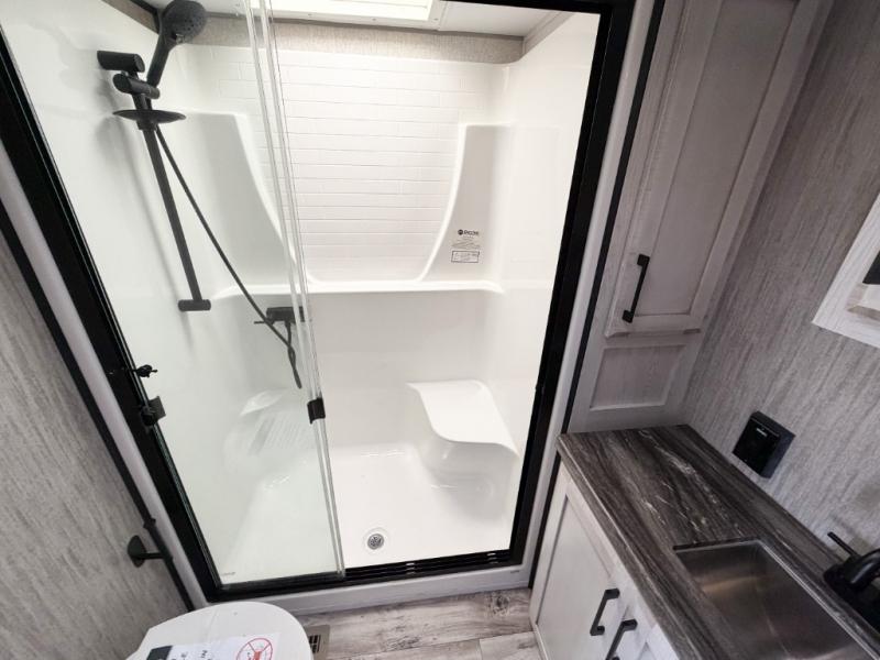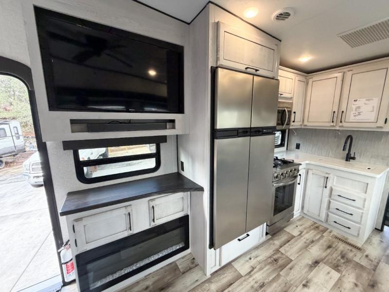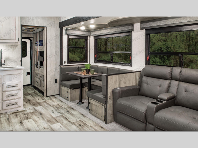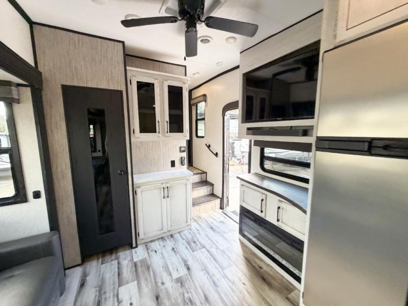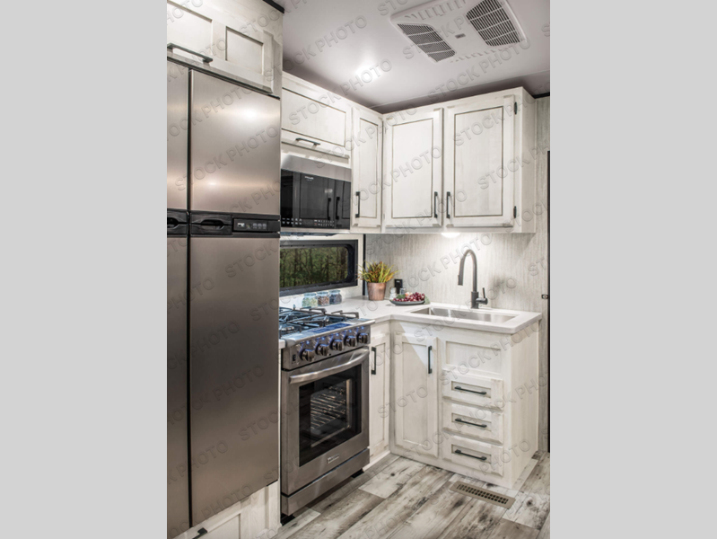 Enjoy full time living, an affordable price, and a wide body construction for more living space with every one of these KZ Durango light high-profile fifth wheels! These luxury units can be used all year round with the all-weather insulation package, the 3" x 14" foam-core in-floor straight-line heating system w/ a 35,000 BTU furnace, and the 15,000 BTU ducted roof A/C which optimizes the airflow by an average of 40% for better performance, cooling time, and reduction of noise. A few other construction features you will appreciate include a one piece, seamless walk-on Tufflex roofing material, Pex® in-floor heated waterlines, a Lamilux® gelcoat fiberglass exterior, and Dexter® axles with self adjusting brakes and height adjusting hangers. You can even head to the woods and go off-grid when you choose the optional off-the-grid solar package. Modern farmhouse cabinetry, a king size bed, and smart TVs will have you feeling like you never left home!