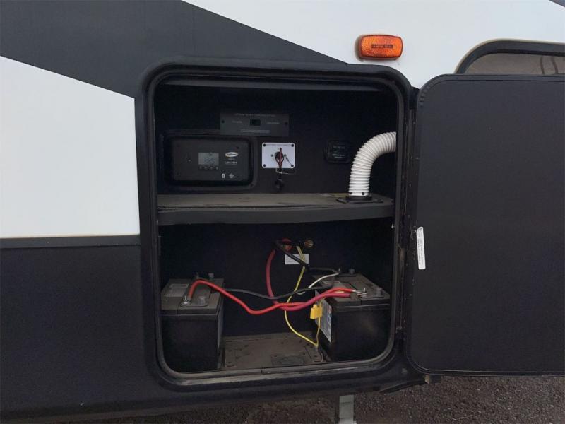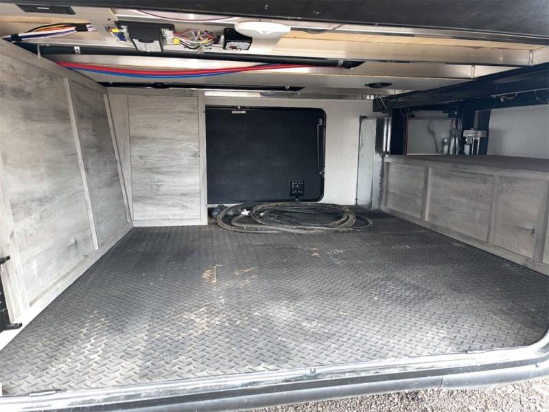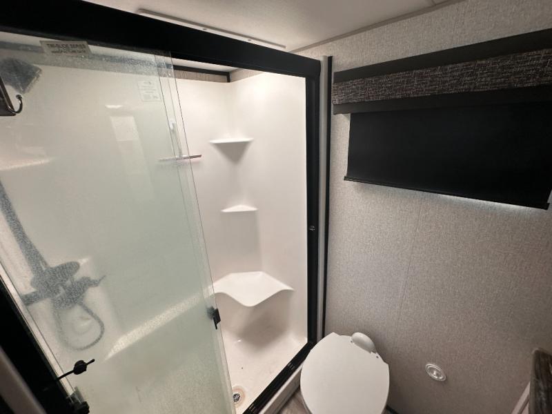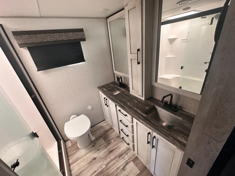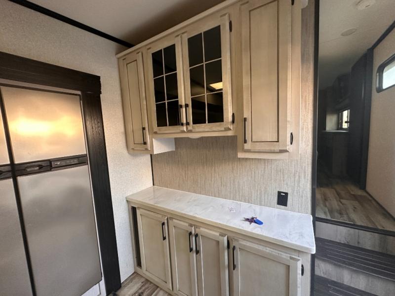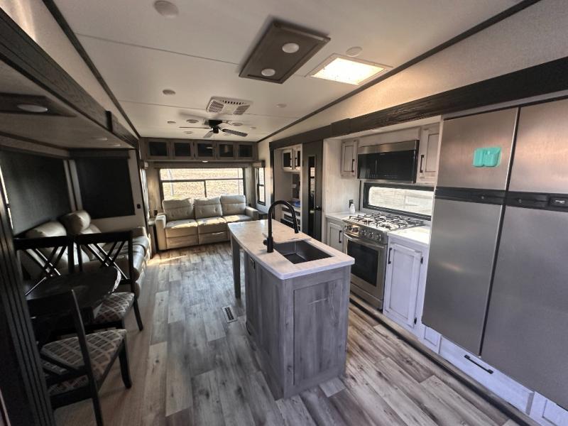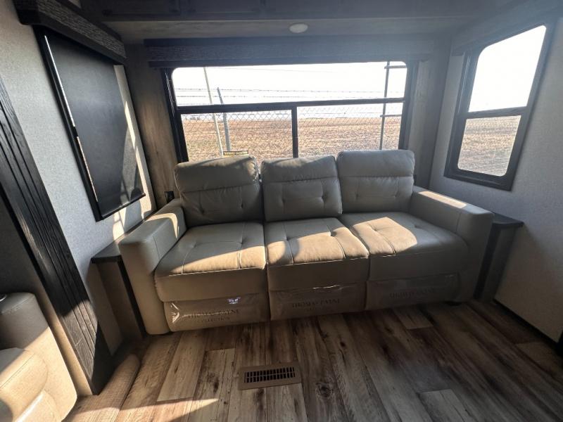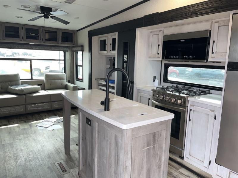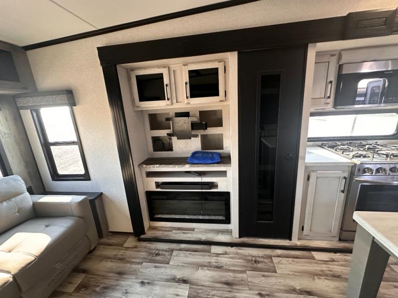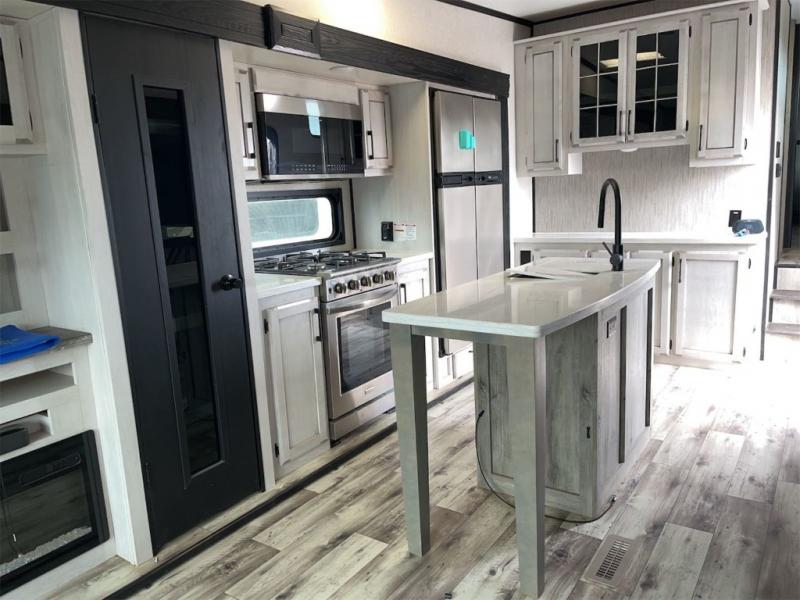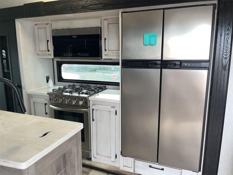 Don't pass up your chance to camp in true luxury with this fifth wheel! There is a kitchen island with two bar stools for others to help prepare dinner which can be either cooked on the four burner range or inside the 24" oven. The hutch can store your dishes and the large pantry can store your favorite snacks/canned goods. After a fun day at the beach, rinse the sand out in the 48" x 30" residential shower with a seat in the full bathroom, plus it has a dual sink vanity for two to get ready at once in the morning. When it's time to relax either lay down on the king bed slide in the front private bedroom or head to the rear living area where you can lay on the hide-a-bed sofa or sit in the theater seating with USB charging across from the entertainment center with a 40" fireplace and 50" smart LED TV to watch a movie!