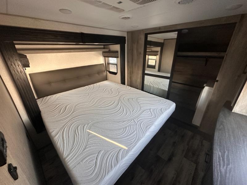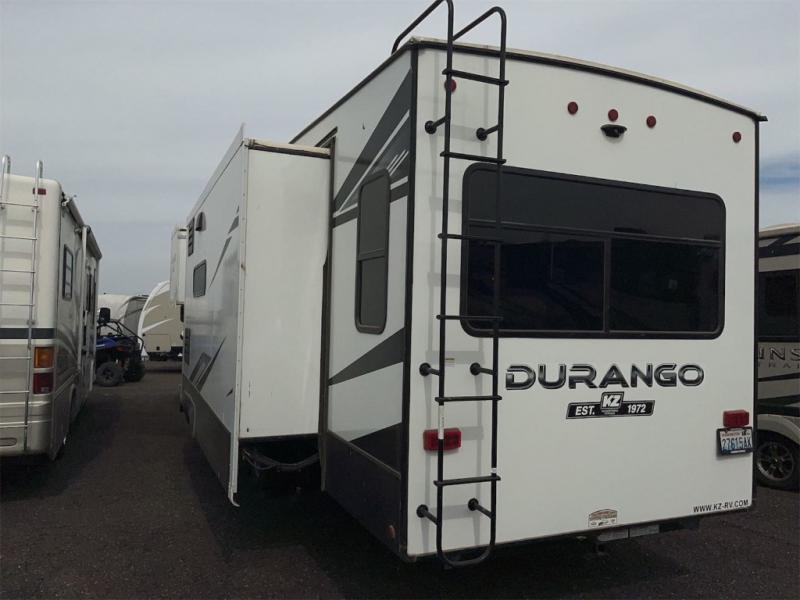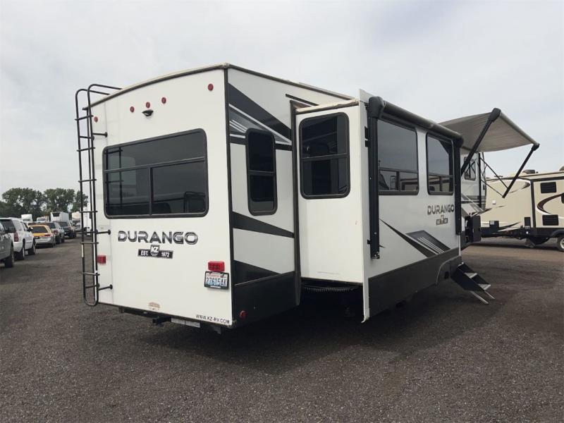 Enjoy full time living, an affordable price, and a wide body construction for more living space with every one of these KZ Durango light high-profile fifth wheels! These luxury units can be used all year round with the all-weather insulation package, the 3" x 14" foam-core in-floor straight-line heating system w/ a 35,000 BTU furnace, and the 15,000 BTU ducted roof A/C which optimizes the airflow by an average of 40% for better performance, cooling time, and reduction of noise. A few other construction features you will appreciate include a one piece, seamless walk-on Tufflex roofing material, Pex® in-floor heated waterlines, a Lamilux® gelcoat fiberglass exterior, and Dexter® axles with self adjusting brakes and height adjusting hangers. You can even head to the woods and go off-grid when you choose the optional off-the-grid solar package. Modern farmhouse cabinetry, a king size bed, and smart TVs will have you feeling like you never left home!