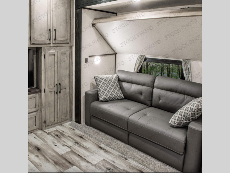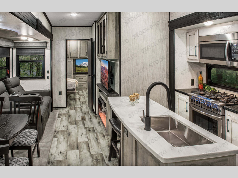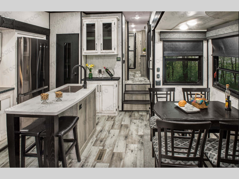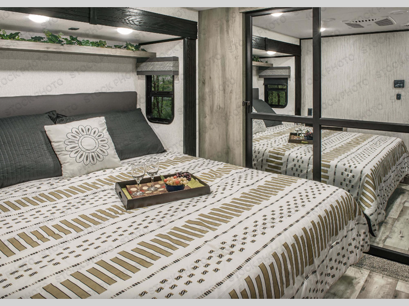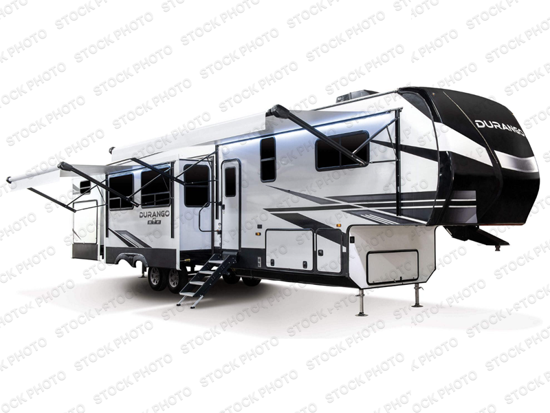 Enjoy full time living, an affordable price, and a wide body construction for more living space with every one of these KZ Durango light high-profile fifth wheels! These luxury units can be used all year round with the all-weather insulation package, the 3" x 14" foam-core in-floor straight-line heating system w/ a 35,000 BTU furnace, and the 15,000 BTU ducted roof A/C which optimizes the airflow by an average of 40% for better performance, cooling time, and reduction of noise. A few other construction features you will appreciate include a one piece, seamless walk-on Tufflex roofing material, Pex® in-floor heated waterlines, a Lamilux® gelcoat fiberglass exterior, and Dexter® axles with self adjusting brakes and height adjusting hangers. You can even head to the woods and go off-grid when you choose the optional off-the-grid solar package. Modern farmhouse cabinetry, a king size bed, and smart TVs will have you feeling like you never left home!