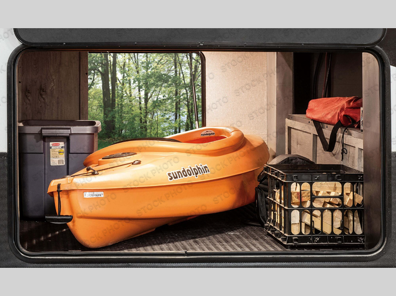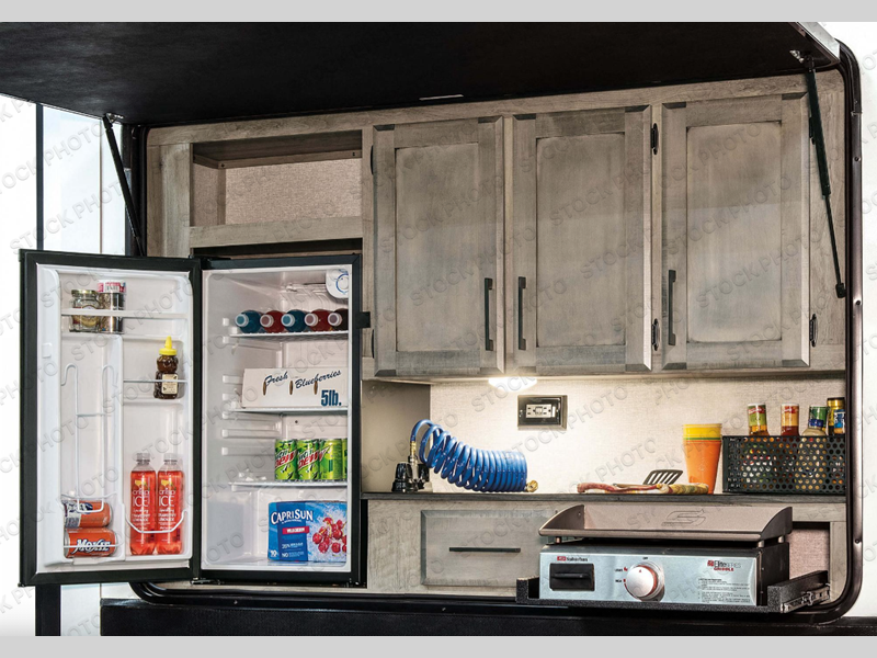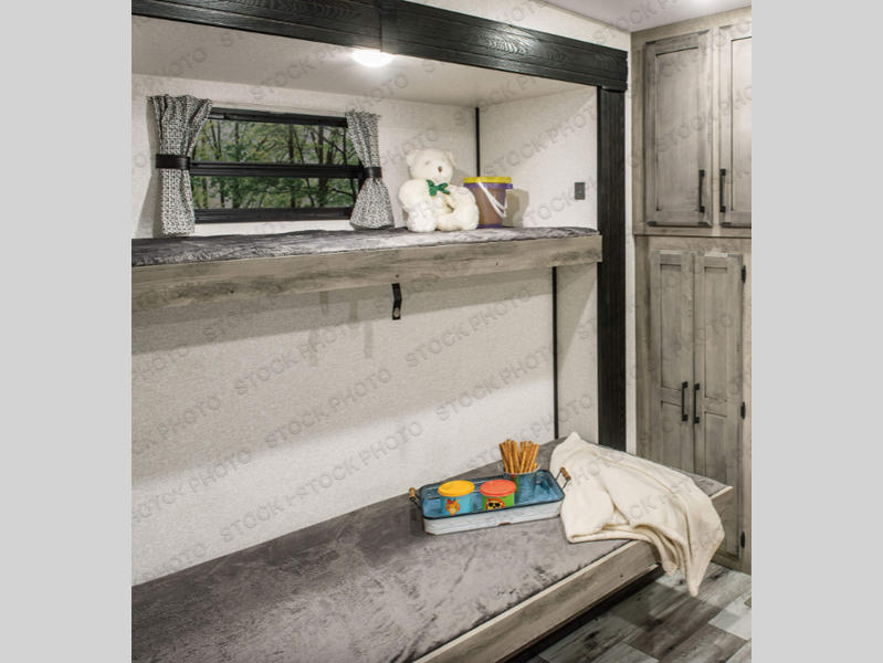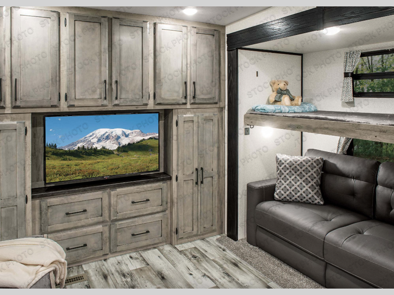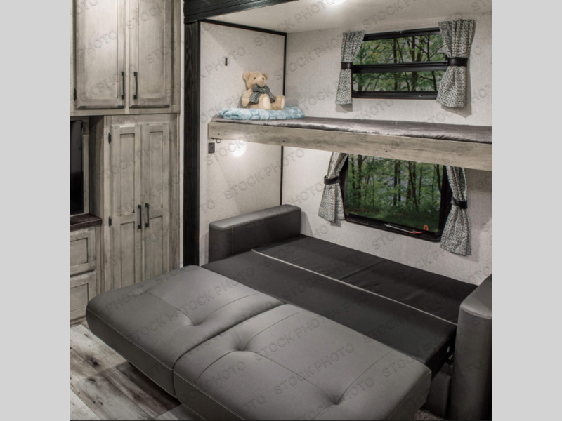 All of your friends and family can camp together in this fifth wheel! It features a rear private bunkhouse with a bunk above a hide-a-bed sofa, a full bathroom with a 30" x 36" shower, an entertainment center with wardrobes on either side, a folding bunk, and a bunk over the outside kitchen. Across from the hide-a-bed sofa is an entertainment center with a 40" fireplace and a 50" smart TV to watch your favorite movies at night. The kitchen island comes with two bar stools and you can prepare your best meals with the four burner range with a 24" oven. The second bathroom has a 48" x 30" residential shower with a seat and a linen closet to keep your towel close. Enjoy a good night's rest on the king bed slide in the front private bedroom which also has a dresser with a built-in hamper and a front wardrobe that is prepped to add an optional washer and dryer!