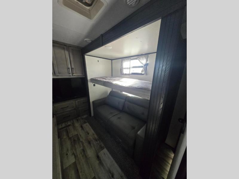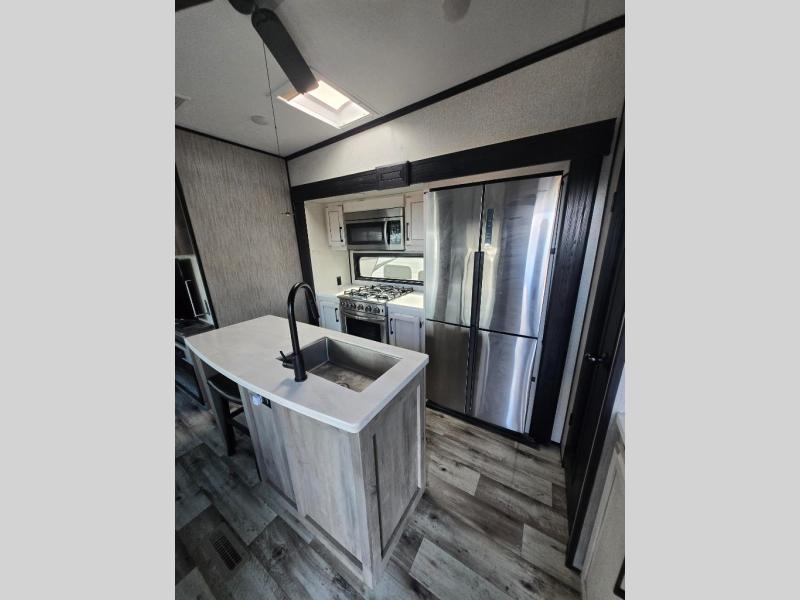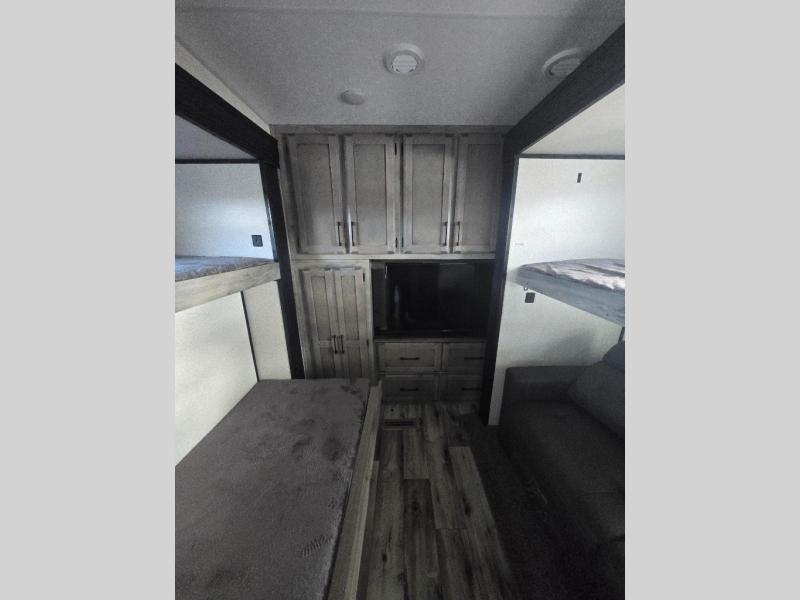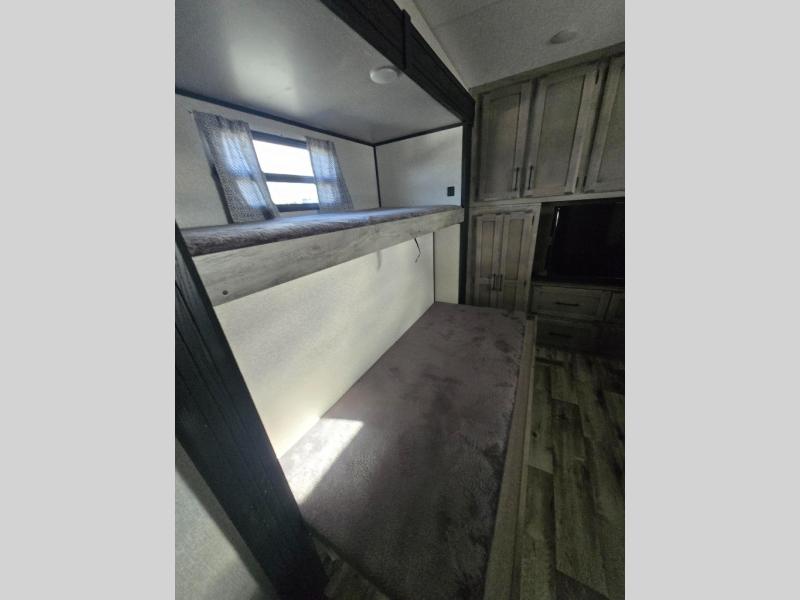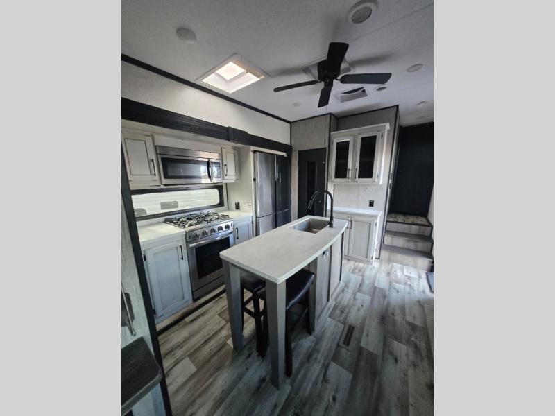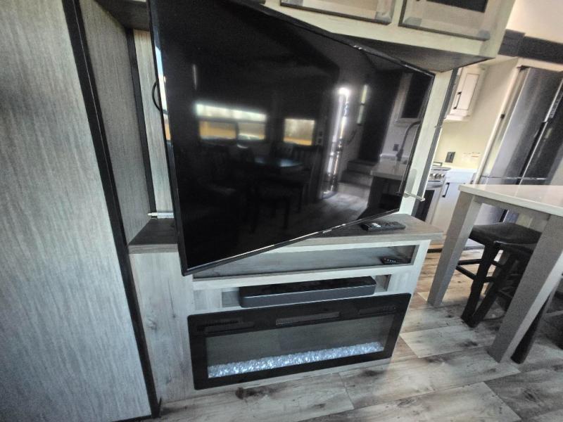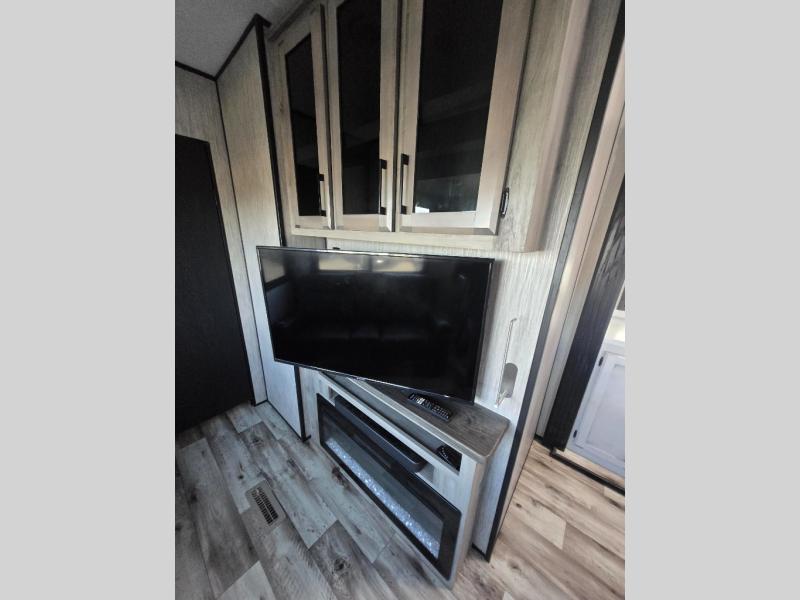 All of your friends and family can camp together in this fifth wheel! It features a rear private bunkhouse with a bunk above a hide-a-bed sofa, a full bathroom with a 30" x 36" shower, an entertainment center with wardrobes on either side, a folding bunk, and a bunk over the outside kitchen. Across from the hide-a-bed sofa is an entertainment center with a 40" fireplace and a 50" smart TV to watch your favorite movies at night. The kitchen island comes with two bar stools and you can prepare your best meals with the four burner range with a 24" oven. The second bathroom has a 48" x 30" residential shower with a seat and a linen closet to keep your towel close. Enjoy a good night's rest on the king bed slide in the front private bedroom which also has a dresser with a built-in hamper and a front wardrobe that is prepped to add an optional washer and dryer!
