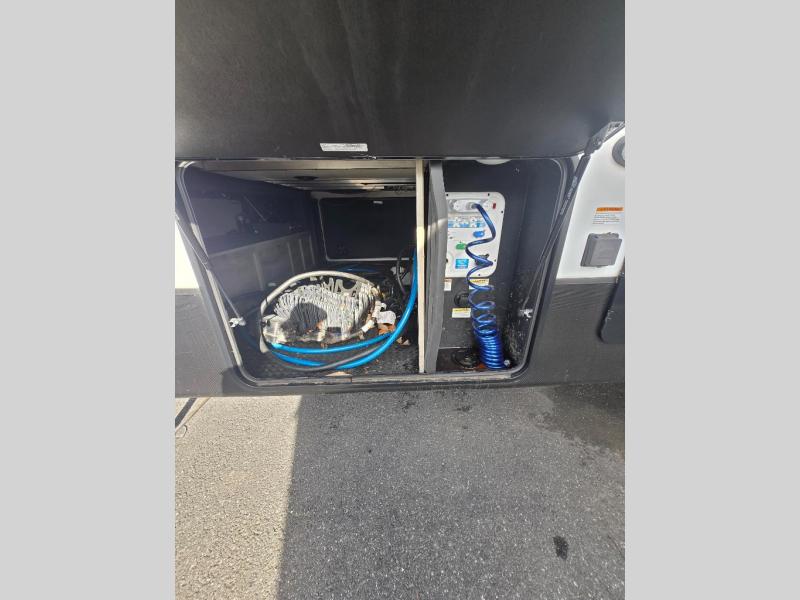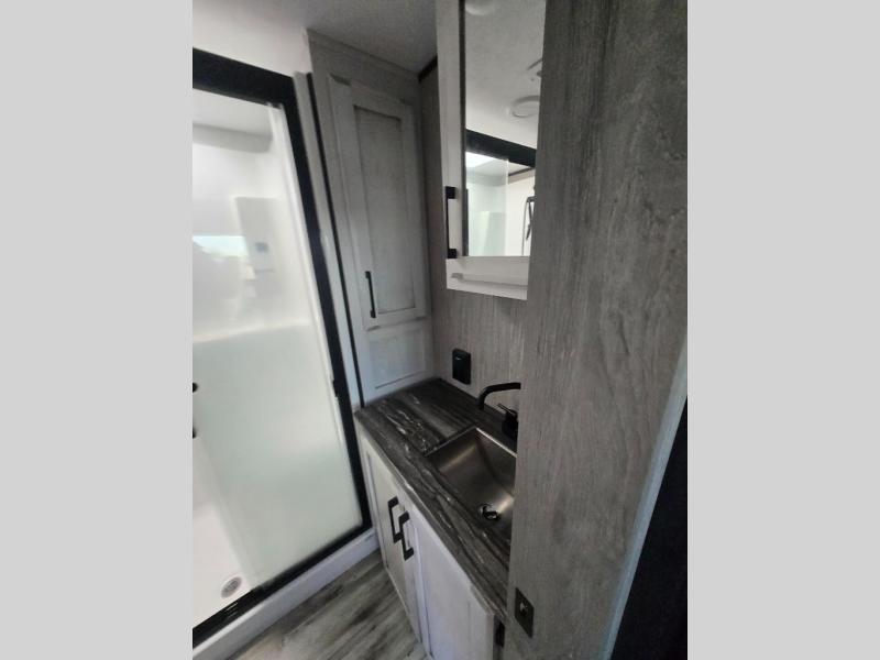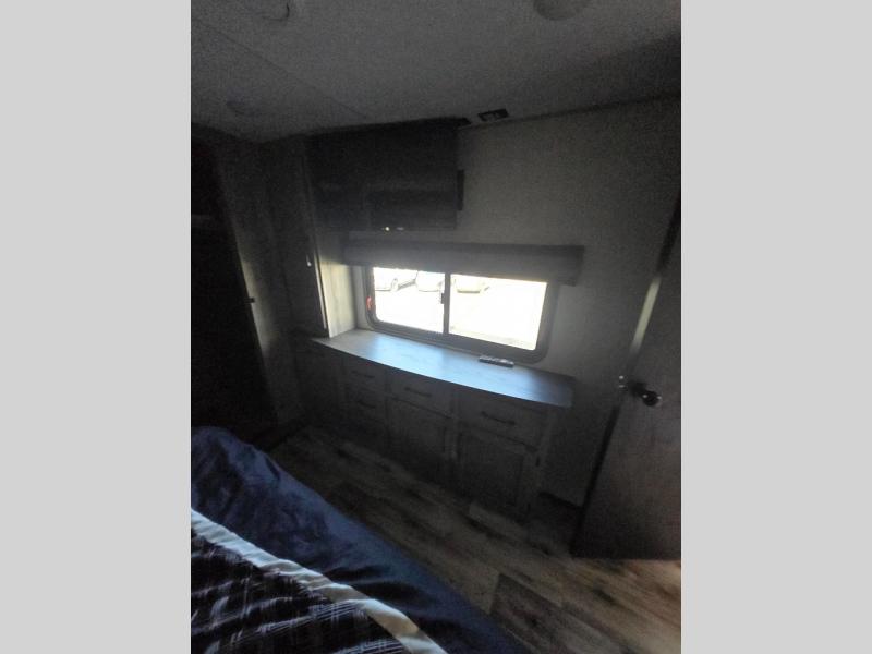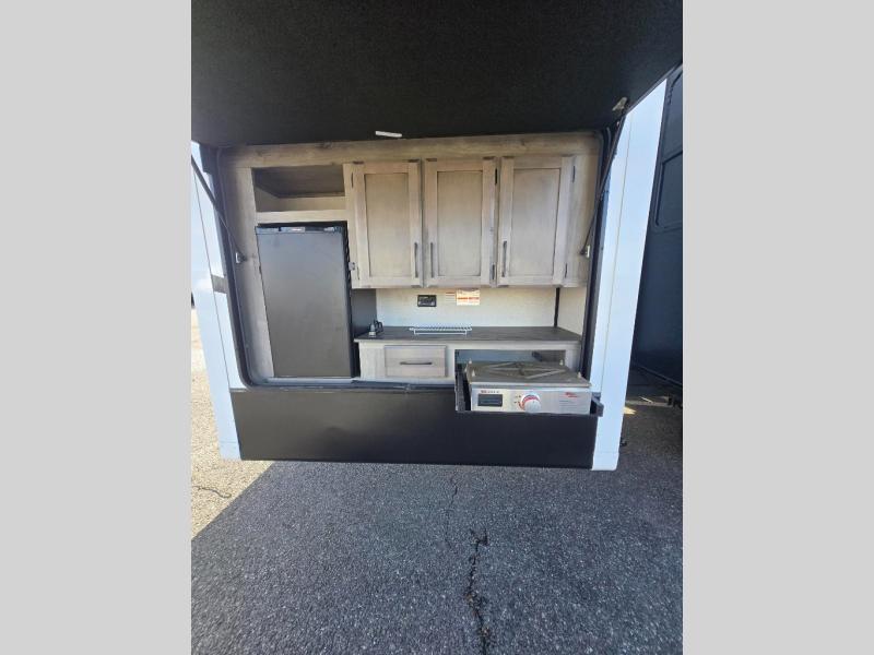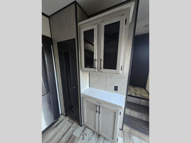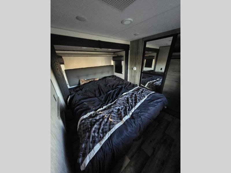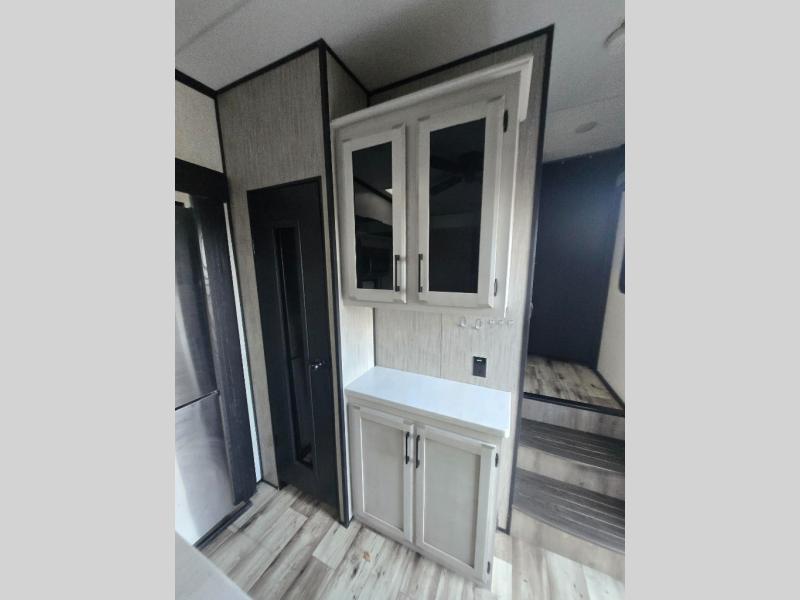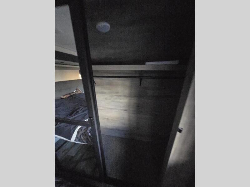 All of your friends and family can camp together in this fifth wheel! It features a rear private bunkhouse with a bunk above a hide-a-bed sofa, a full bathroom with a 30" x 36" shower, an entertainment center with wardrobes on either side, a folding bunk, and a bunk over the outside kitchen. Across from the hide-a-bed sofa is an entertainment center with a 40" fireplace and a 50" smart TV to watch your favorite movies at night. The kitchen island comes with two bar stools and you can prepare your best meals with the four burner range with a 24" oven. The second bathroom has a 48" x 30" residential shower with a seat and a linen closet to keep your towel close. Enjoy a good night's rest on the king bed slide in the front private bedroom which also has a dresser with a built-in hamper and a front wardrobe that is prepped to add an optional washer and dryer!