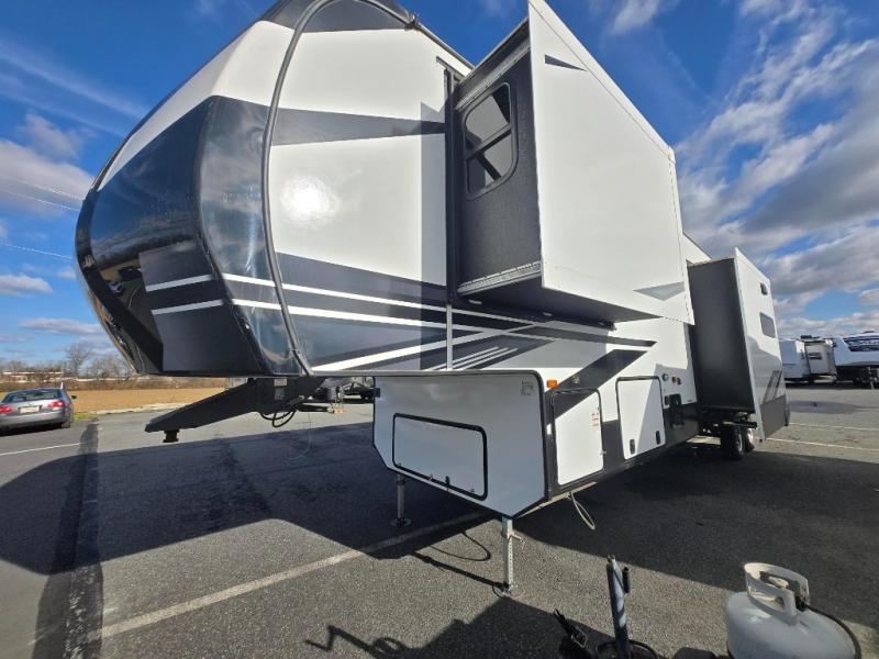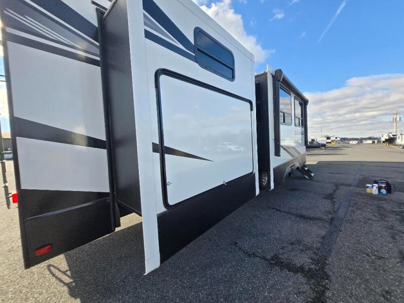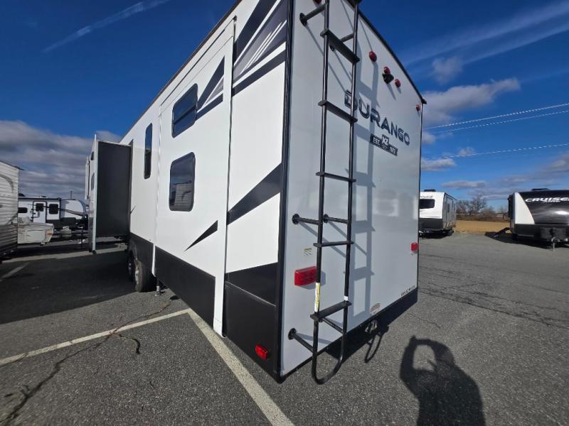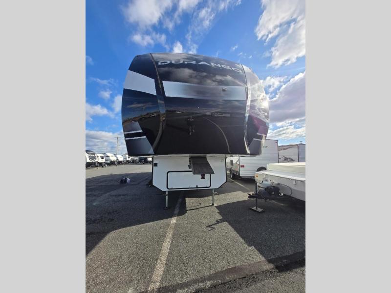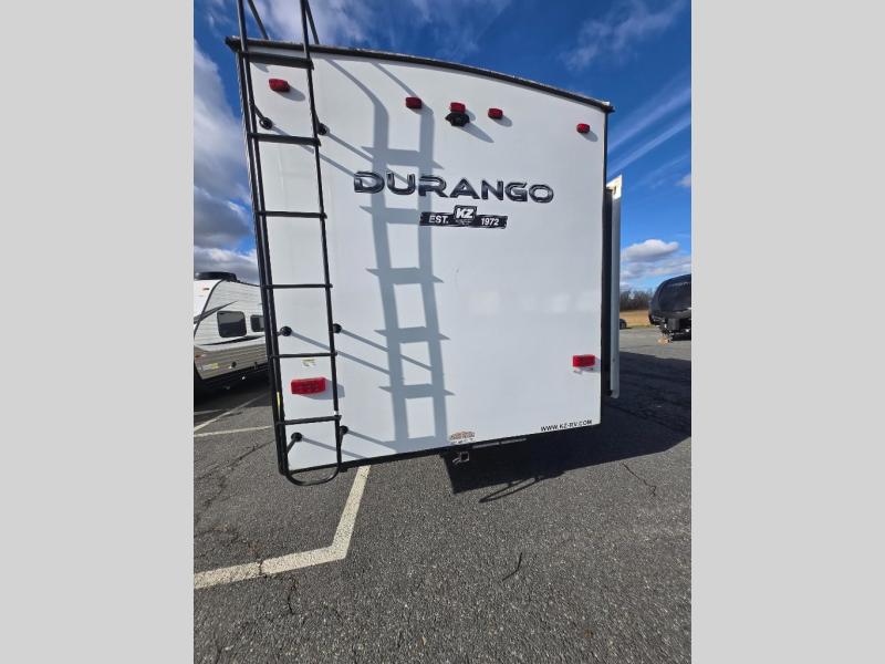 Enjoy full time living, an affordable price, and a wide body construction for more living space with every one of these KZ Durango light high-profile fifth wheels! These luxury units can be used all year round with the all-weather insulation package, the 3" x 14" foam-core in-floor straight-line heating system w/ a 35,000 BTU furnace, and the 15,000 BTU ducted roof A/C which optimizes the airflow by an average of 40% for better performance, cooling time, and reduction of noise. A few other construction features you will appreciate include a one piece, seamless walk-on Tufflex roofing material, Pex® in-floor heated waterlines, a Lamilux® gelcoat fiberglass exterior, and Dexter® axles with self adjusting brakes and height adjusting hangers. You can even head to the woods and go off-grid when you choose the optional off-the-grid solar package. Modern farmhouse cabinetry, a king size bed, and smart TVs will have you feeling like you never left home!
