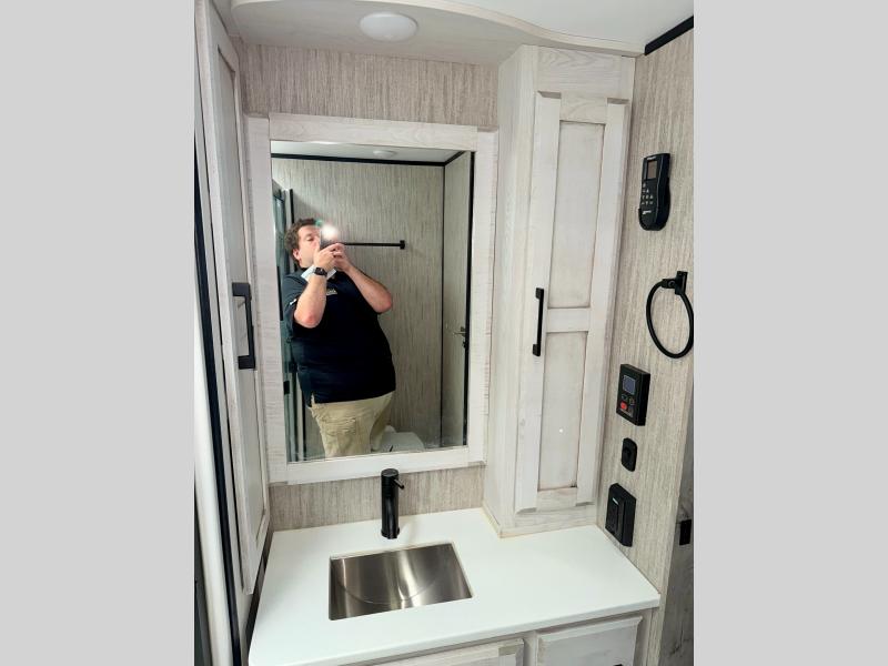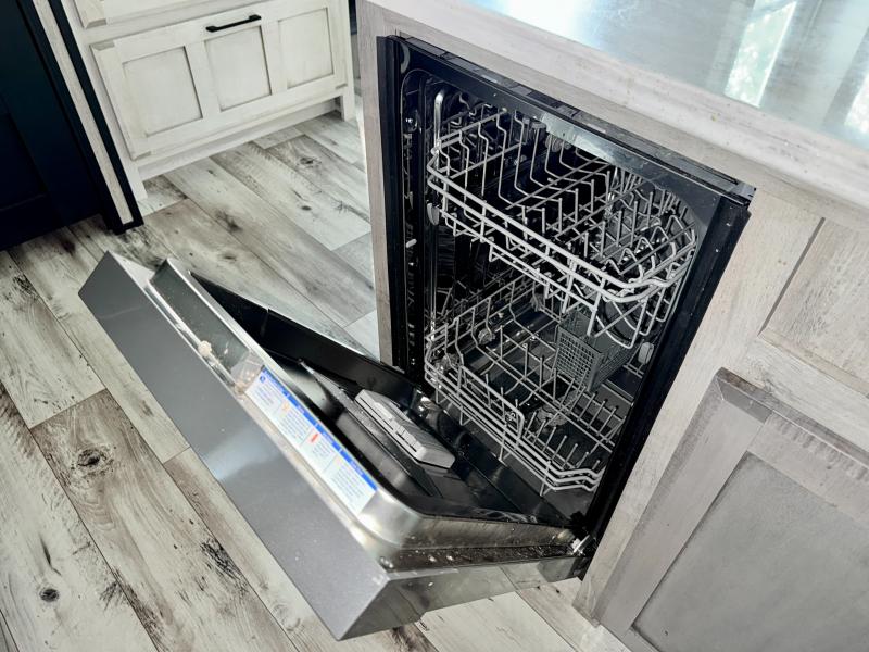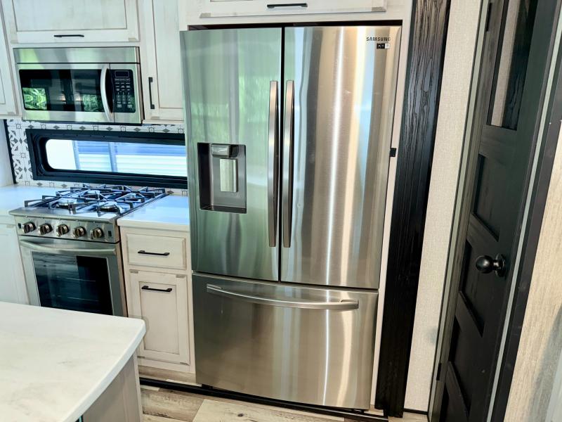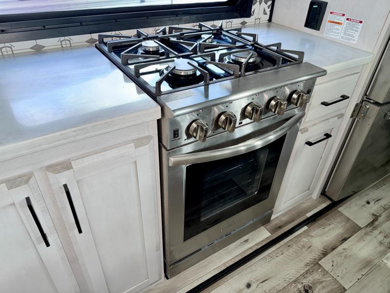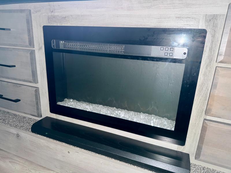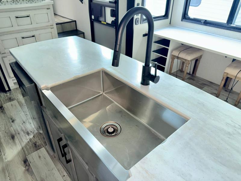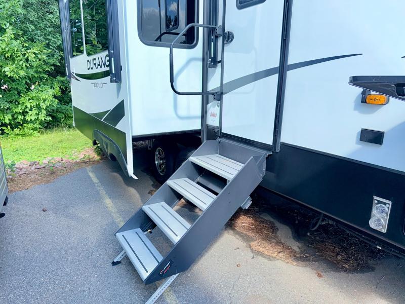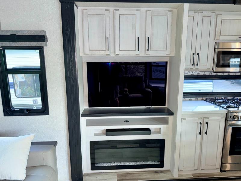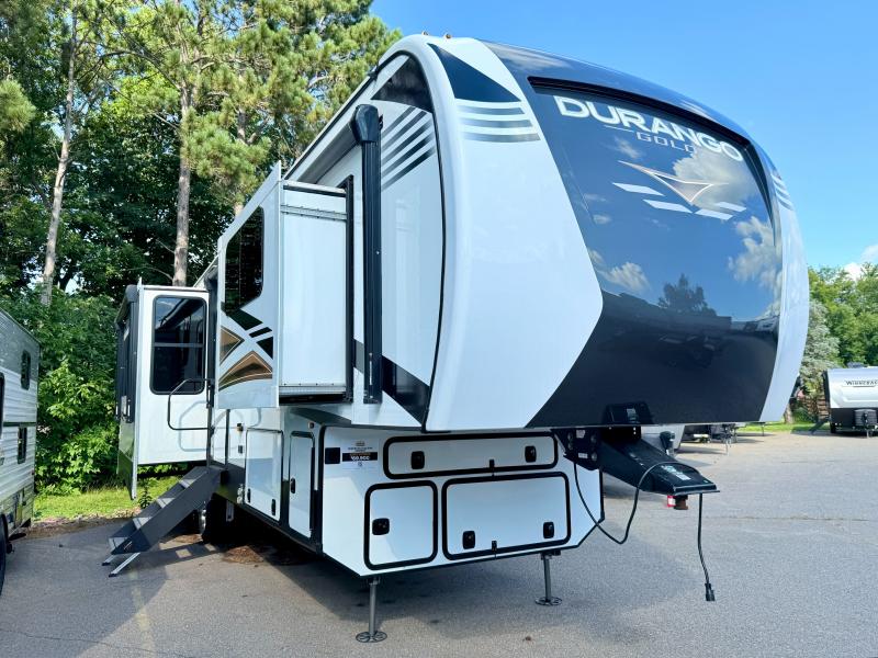 Camp wherever you want and stay as long as you desire with this full-time fifth wheel! You will love the spacious interior which includes a front bedroom with a slide out king electric tilt bed with drawers underneath, a front wardrobe including a washer/dryer prepped space for that option, and a closet with a built-in hamper, plus a slide out dresser with 32" Smart LED TV above. The full bathroom offers a residential shower with a seat plus linen storage, and the kitchen gives the cook a dream kitchen that includes a farmhouse stainless steel sink and dishwasher in the center island, an 18 cu. ft. refrigerator, solid surface countertops, and more. The 50" Smart LED TV with fireplace below can be seen from the legless table and chairs, the comfortable theater seats and the hide-a-bed sofa. Yet you might like to add the full-timer's desk option, and there are more options to customize your Durango Gold.