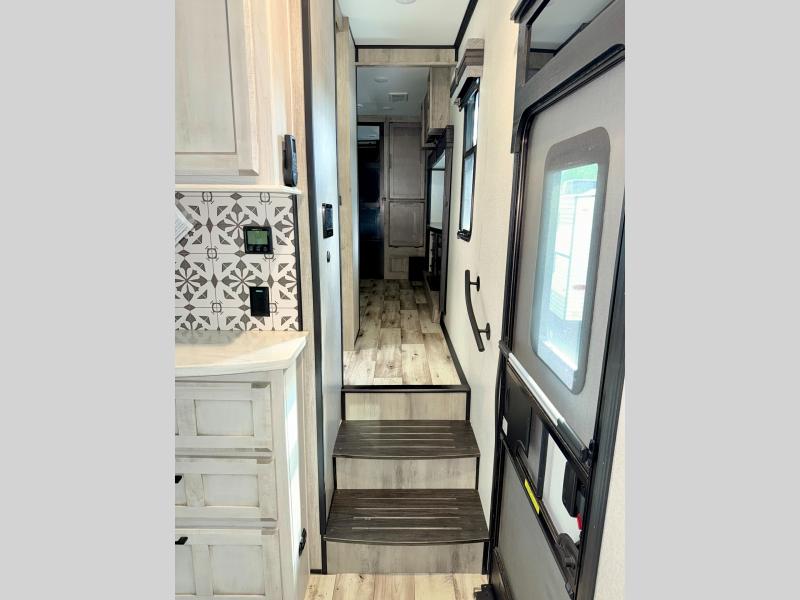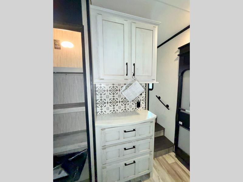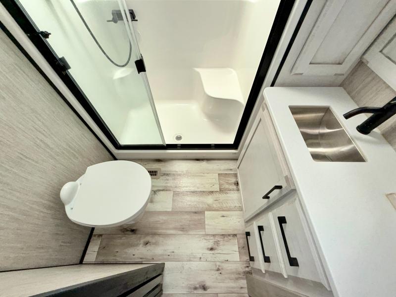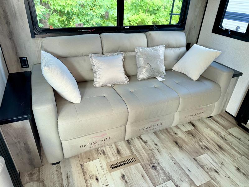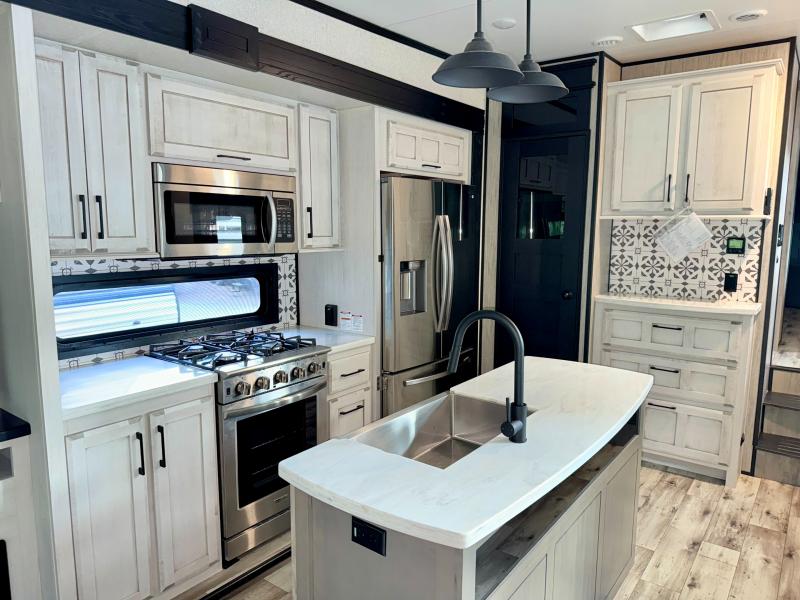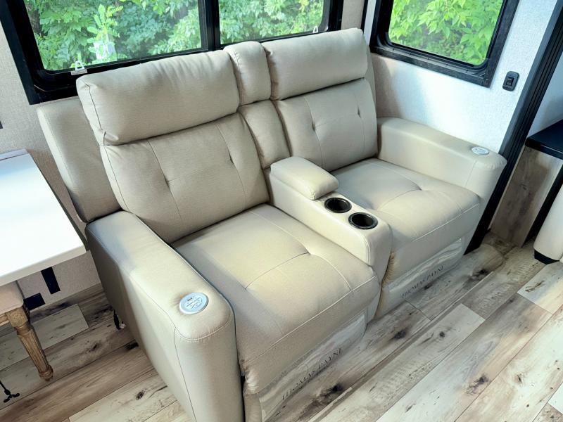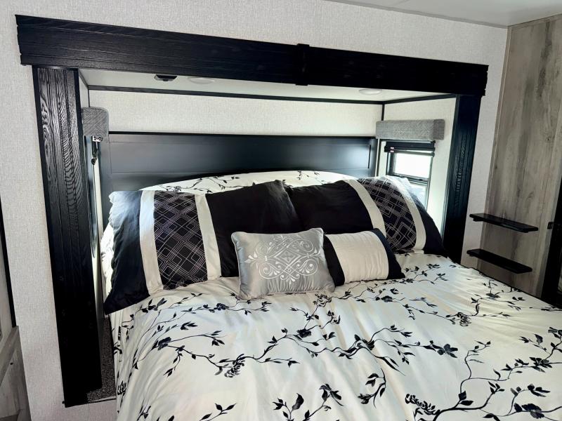 With any KZ Durango Gold full-time luxury fifth wheel, you will enjoy the look of modern farmhouse cabinetry, upgraded kitchen appliances such as a 30" convection microwave and 24" oven with four burner range, plus a stainless dishwasher. Other top features include an electric tilt bed with Serta Comfort foam king mattress, theater seating with cupholders and a USB plug, plus heat, massage, and power recline/decline features. You will also appreciate a handy central vacuum system with multiple attachments that stores out of sight. Each Durango Gold is constructed with six-sided aluminum framing, and has heated, insulated and an enclosed underbelly. It is also constructed with Tufflex roofing material which is flexible, puncture resistant, and reflective. Some additional standout features include a fully-vented attic system, and a Durango Towing package which includes a 2" towing receiver hitch with 4-pin wire harness connection. This will provide you with 3,000 lbs. of towing capacity. Come choose your favorite lightweight high-profile wide body luxury fifth wheel today!