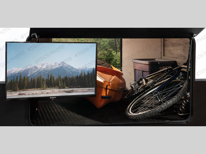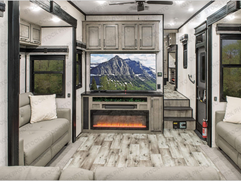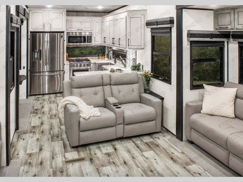 Any cook will love this fifth wheel's layout with a rear kitchen which includes residential appliances, a farmhouse stainless steel sink, a dishwasher, solid surface countertops, a pantry, and a view of the middle, separate living area. You can even see the 65" LED TV with fireplace below from the slide out which includes the legless table with chairs unless you choose the full-timer's desk option for that convenience. The theater seating with USB ports, and two hide-a-bed sofa slides widen this area so everyone can stretch out and relax. At night retire to your own front bedroom with a slide out king electric tilt bed with drawers underneath, a front wardrobe including a washer/dryer prepped space, and a closet with a built-in hamper, plus a slide out dresser with a 32" Smart LED TV above it. And the full bathroom provides a residential shower with a seat plus linen storage, and two sinks for more convenience.