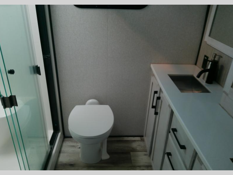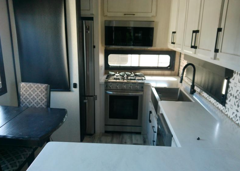 Any cook will love this fifth wheel's layout with a rear kitchen which includes residential appliances, a farmhouse stainless steel sink, a dishwasher, solid surface countertops, a pantry, and a view of the middle, separate living area. You can even see the 65" LED TV with fireplace below from the slide out which includes the legless table with chairs unless you choose the full-timer's desk option for that convenience. The theater seating with USB ports, and two hide-a-bed sofa slides widen this area so everyone can stretch out and relax. At night retire to your own front bedroom with a slide out king electric tilt bed with drawers underneath, a front wardrobe including a washer/dryer prepped space, and a closet with a built-in hamper, plus a slide out dresser with a 32" Smart LED TV above it. And the full bathroom provides a residential shower with a seat plus linen storage, and two sinks for more convenience.