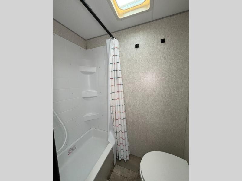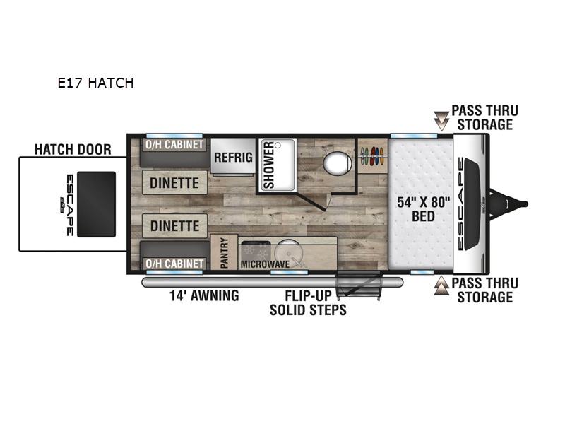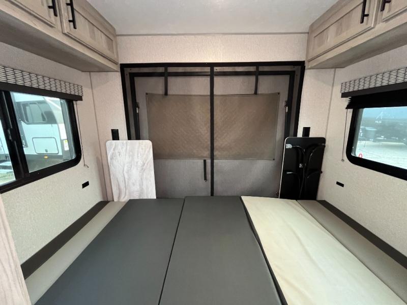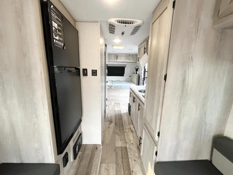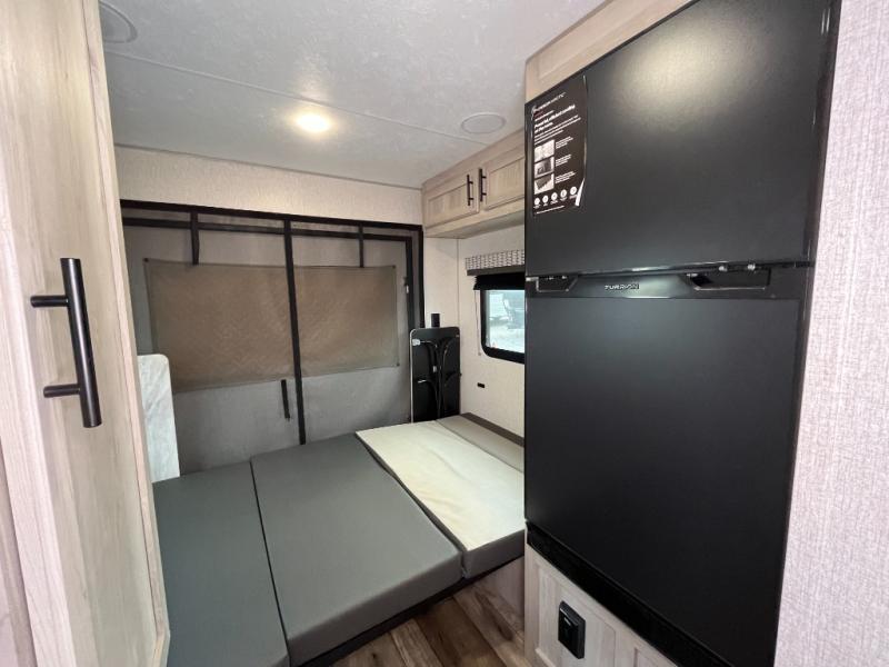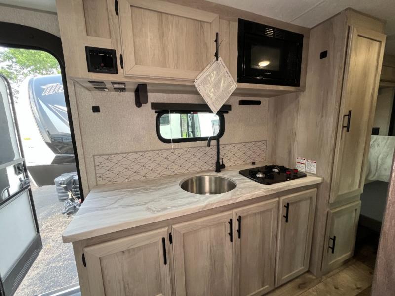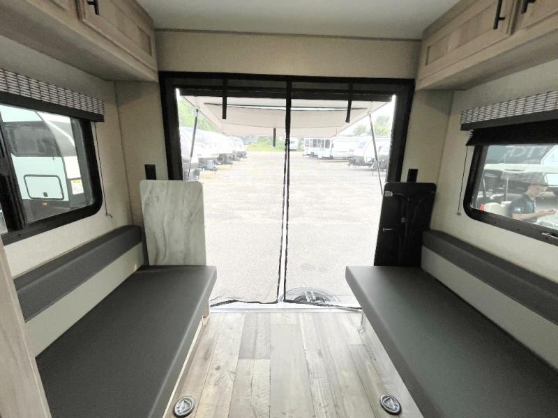 With a hatch door, you can bring the outdoors to the inside of this travel trailer! This model was awarded "Best New Model" of 2021 by RV Pro. The front 54" x 80" bed offers a comfortable place to lay your head at night with a wardrobe next to it to keep your clothes looking their best. Start your mornings feeling clean and fresh by showering in the private bathroom then head to the kitchen and fry up some bacon on the two burner cooktop. The kitchen also has seamless countertops which will be easy to clean, a stainless steel round sink for clean up, a pantry for snacks, and a 8 cu. ft. 12V refrigerator for your perishables. The opposing single booth with dinettes in between provide a comfortable dining area, as well as sleeping area once converted.