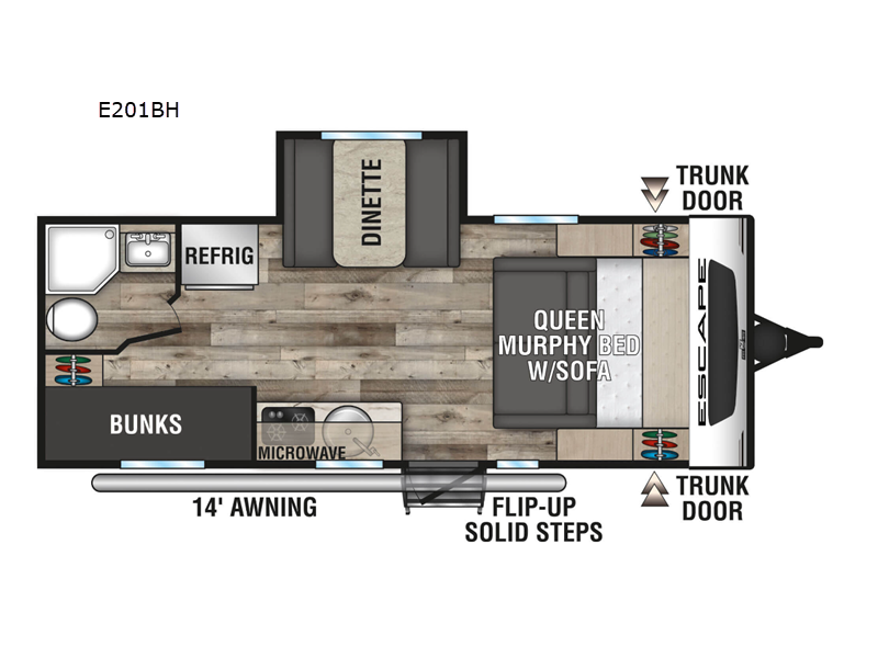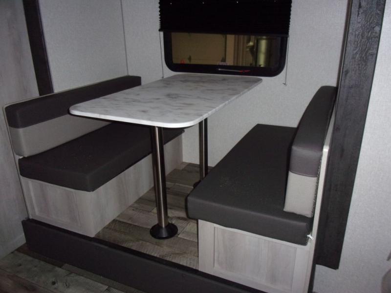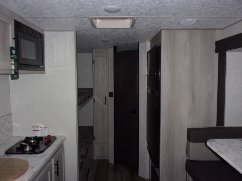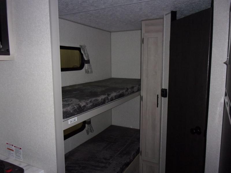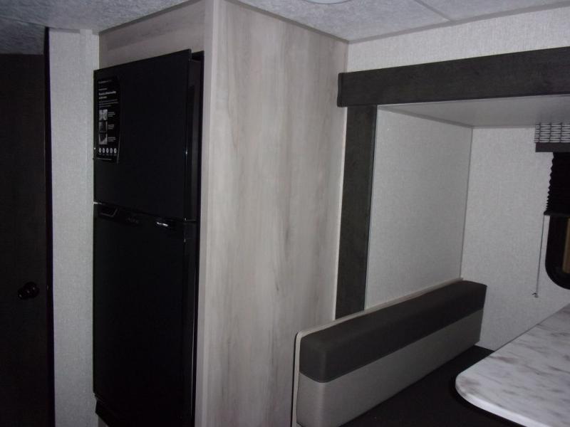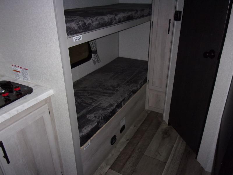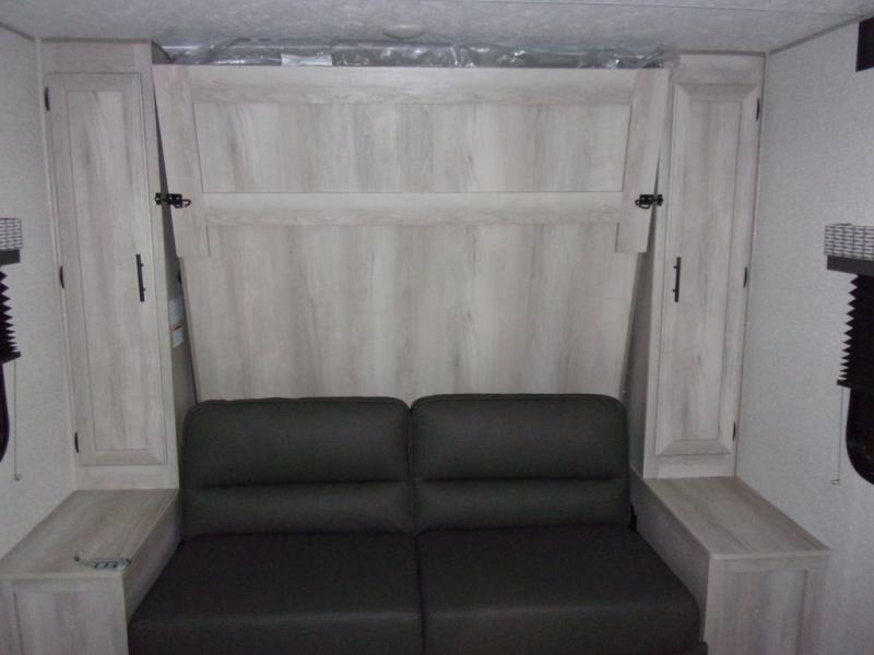 Pack your bags and head to the campsite for a comfortable camping trip with this travel trailer! Depending what time you enter the unit will determine whether you see the front queen Murphy bed or the sofa, and there are wardrobes on either side to hang your clothes. The set of bunk beds also have a wardrobe next to them and are conveniently next to the rear corner bathroom which has a neo-angled shower to freshen up. The chef can prepare their best meals with the two burner cooktop and 8 cu. ft. 12V refrigerator, and enjoy them at the booth dinette slide which can also transform into a sleeping space. The 14' power awning with LED light strip will protect you rain or shine.