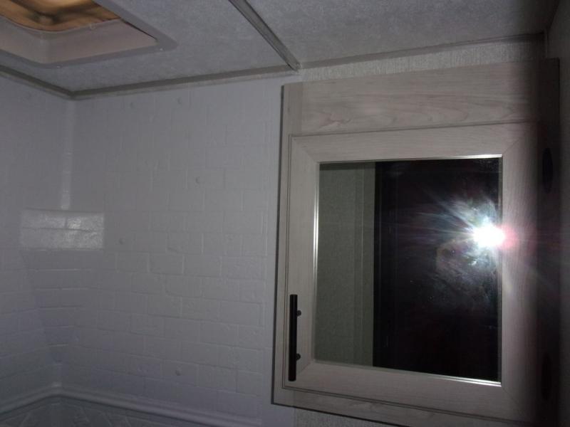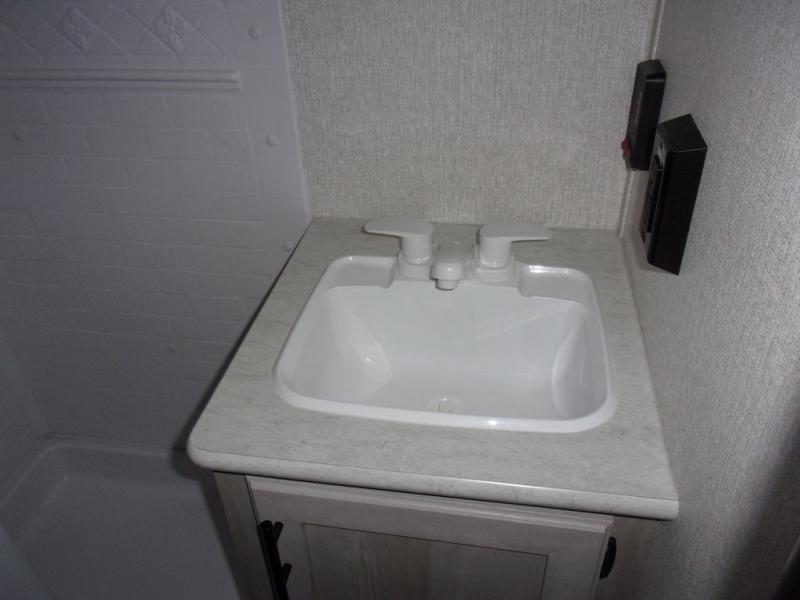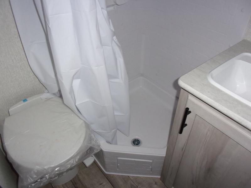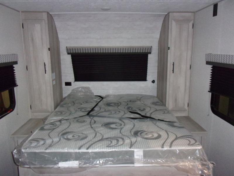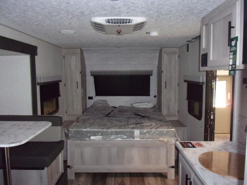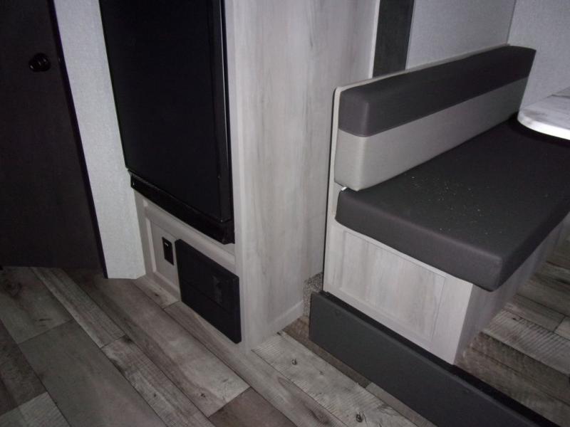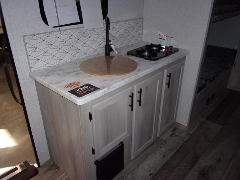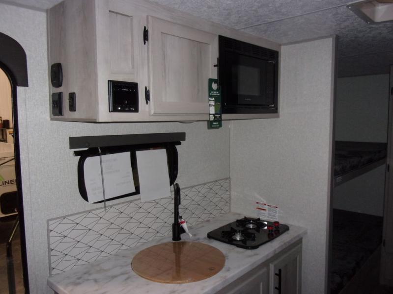 Pack your bags and head to the campsite for a comfortable camping trip with this travel trailer! Depending what time you enter the unit will determine whether you see the front queen Murphy bed or the sofa, and there are wardrobes on either side to hang your clothes. The set of bunk beds also have a wardrobe next to them and are conveniently next to the rear corner bathroom which has a neo-angled shower to freshen up. The chef can prepare their best meals with the two burner cooktop and 8 cu. ft. 12V refrigerator, and enjoy them at the booth dinette slide which can also transform into a sleeping space. The 14' power awning with LED light strip will protect you rain or shine.