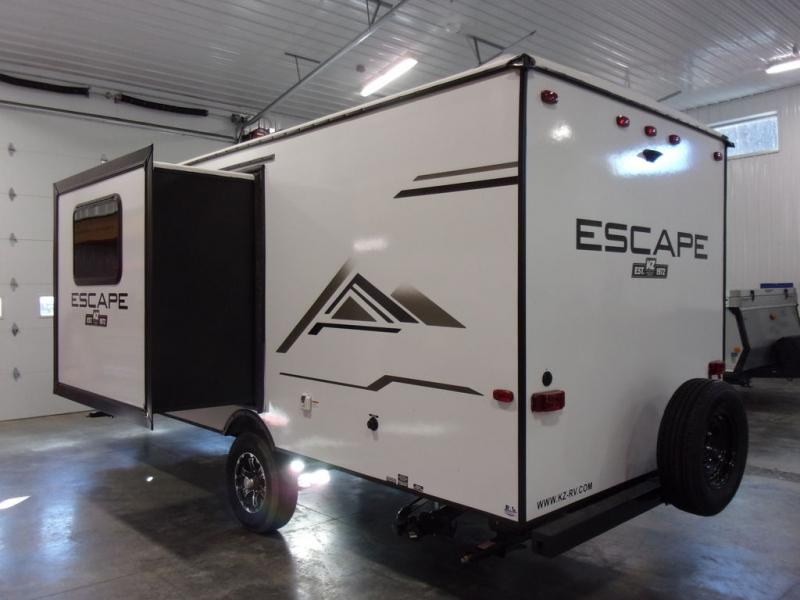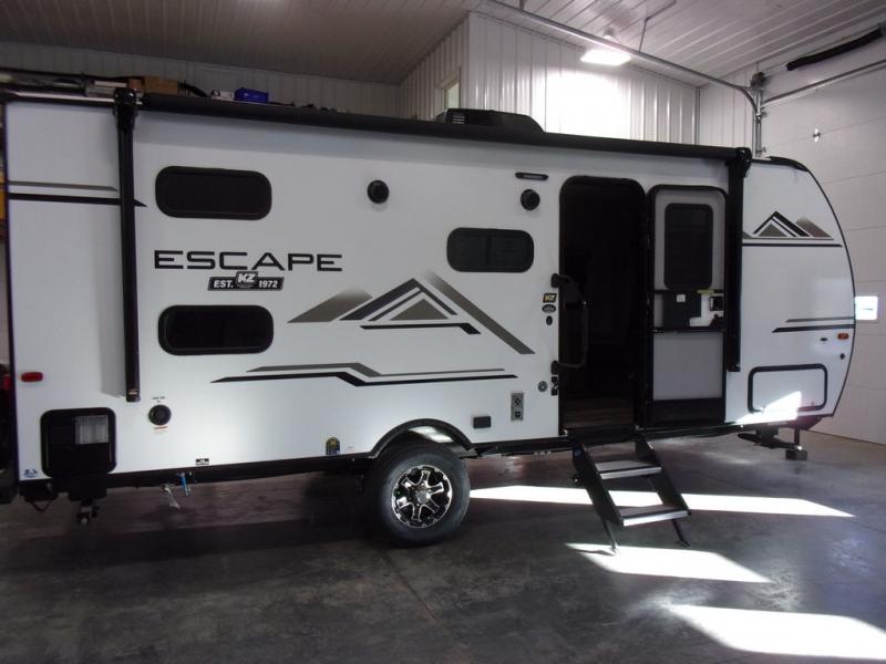 Each one of these KZ Escape ultra lightweight travel trailers were built for campers who want an ultimate adventure! An aerodynamic front profile with a front windshield makes them easier to tow, and the white exterior fiberglass with fender skirts will turn heads down the highway. A 3/8" fully walkable roof with Dicor Tufflex PVC roofing membrane and diamond plate rock guard will protect your unit. The interiors are decorated with beautiful rail style Amish-crafted cabinet doors with modern handles, seamless countertops, residential grade linoleum throughout, and pleated shades covering the tinted windows. The mandatory KZ Convenience package includes interior control switches on overhead end cabinets, a friction hinge entry door with shade prep, and an omnidirectional HDTV antenna with WiFi prep. Come find the right one for you today!