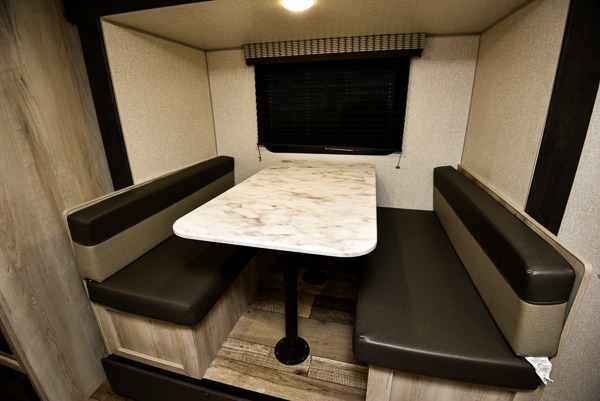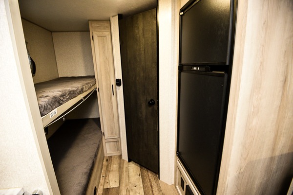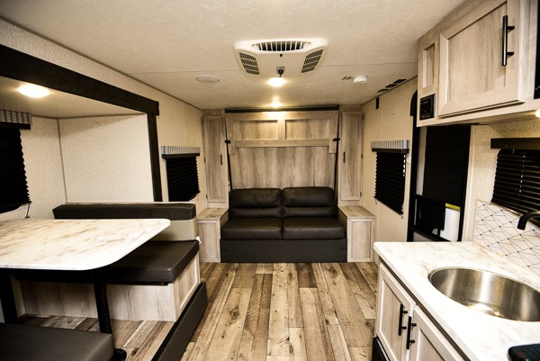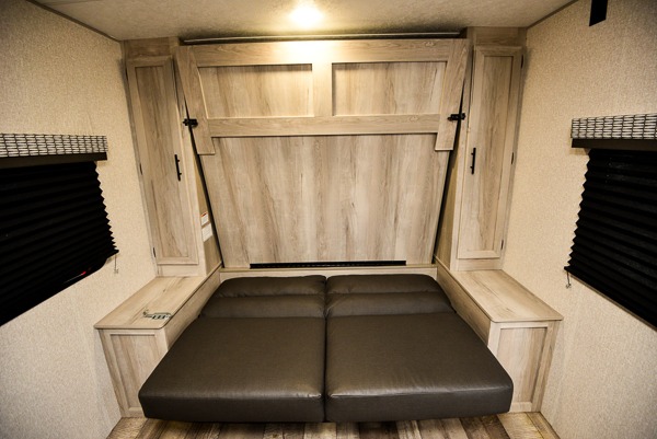 Pack your bags and head to the campsite for a comfortable camping trip with this travel trailer! Depending what time you enter the unit will determine whether you see the front queen Murphy bed or the sofa, and there are wardrobes on either side to hang your clothes. The set of bunk beds also have a wardrobe next to them and are conveniently next to the rear corner bathroom which has a neo-angled shower to freshen up. The chef can prepare their best meals with the two burner cooktop and 8 cu. ft. 12V refrigerator, and enjoy them at the booth dinette slide which can also transform into a sleeping space. The 14' power awning with LED light strip will protect you rain or shine.