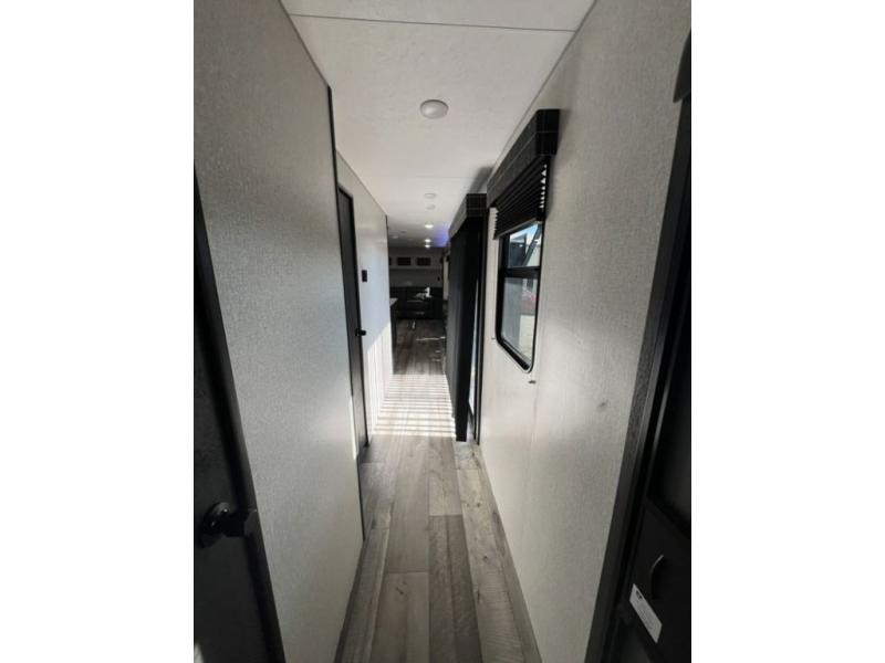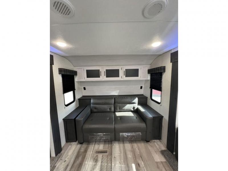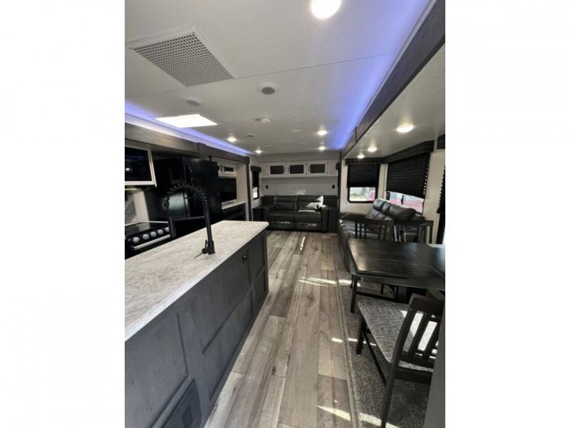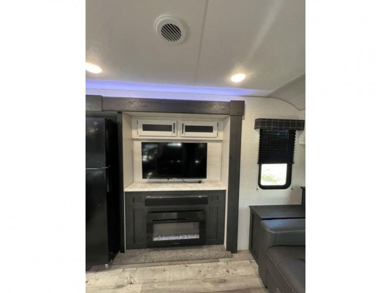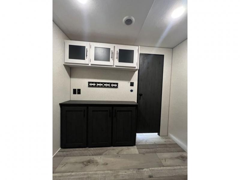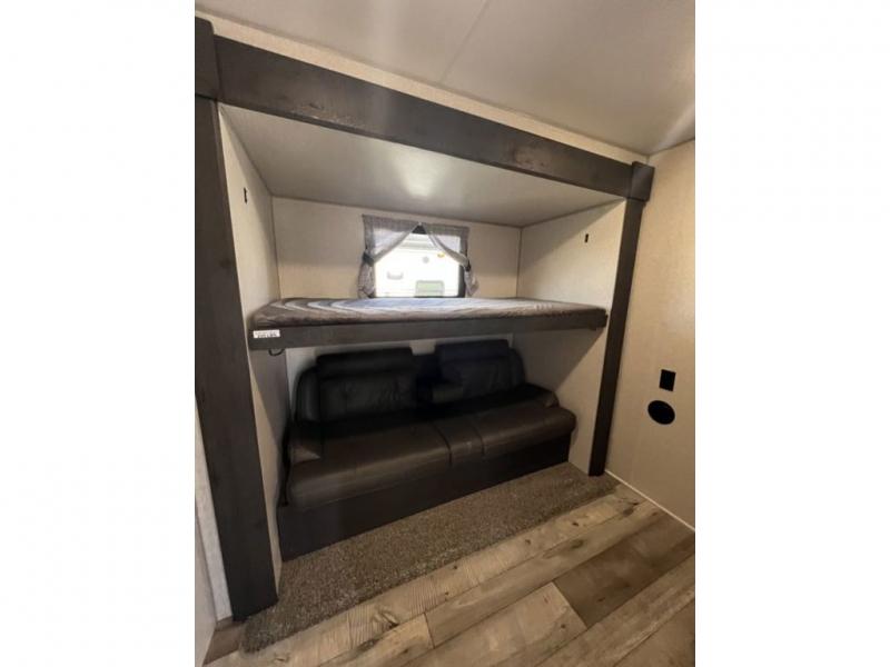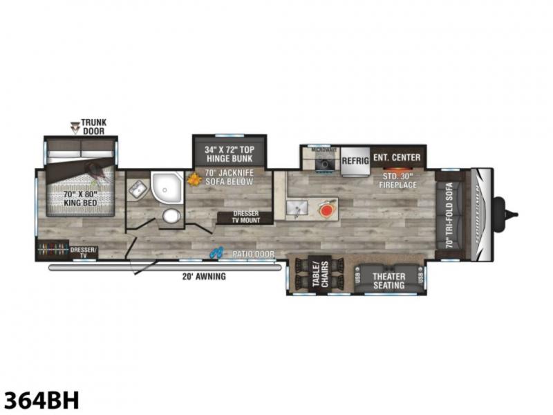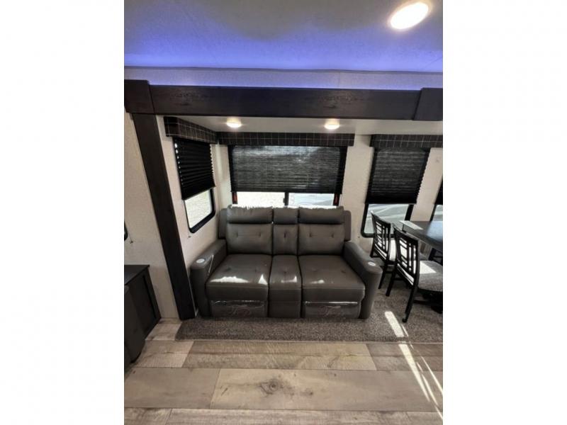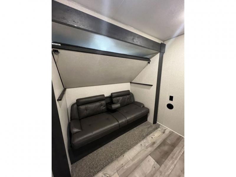 The whole gang will enjoy living in this destination trailer! You will have your own privacy with the rear private bedroom which has a king bed slide across from a dresser with an LED TV and a wardrobe. The kiddos or guests can sleep in the second bedroom with a 34" x 72" hinge bunk above a 70" jackknife sofa. Everyone can freshen up in the full bathroom with a radius shower and keep their bellies full with a three burner cooktop. The table and chairs offer a comfortable place to enjoy your meals and play card games. Your evenings will be quite relaxing when you sit on either the front 70" tri-fold sofa or theater seating across from the 30" electric fireplace and LED TV at the entertainment center!