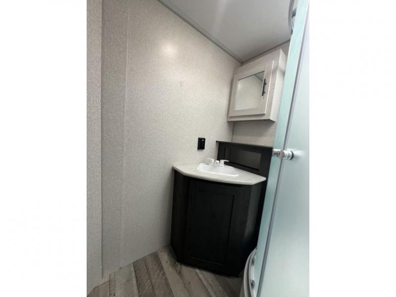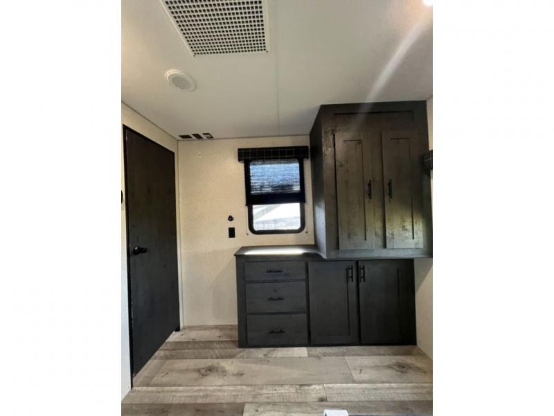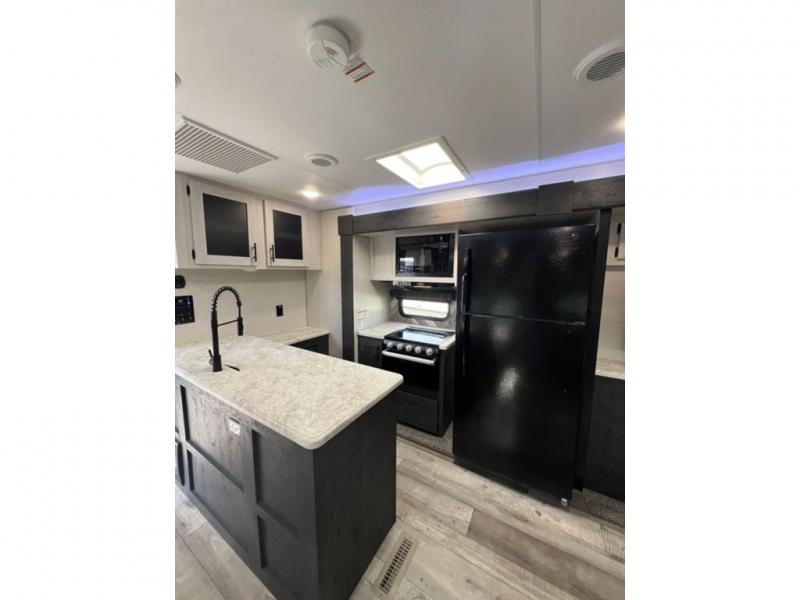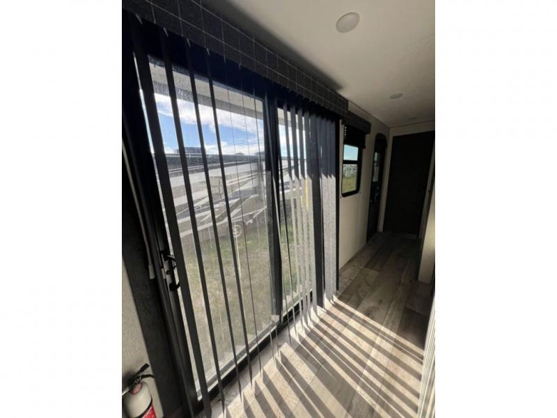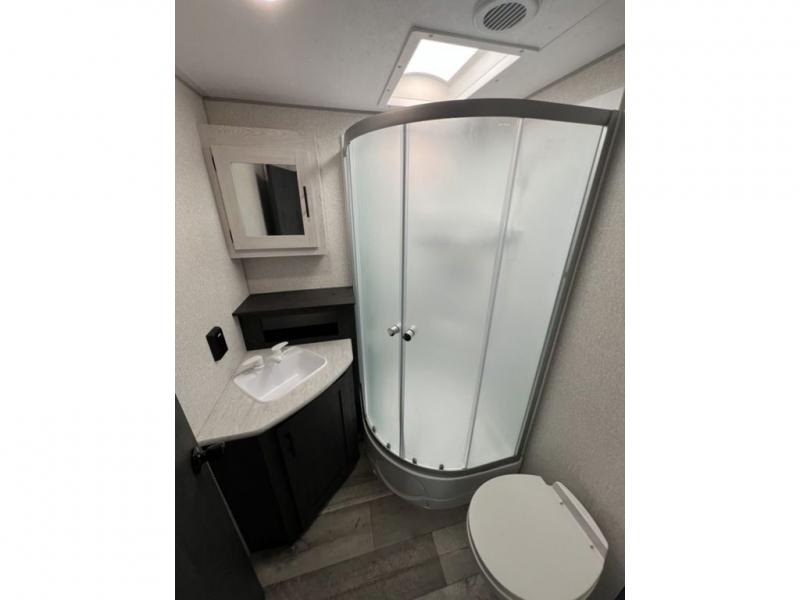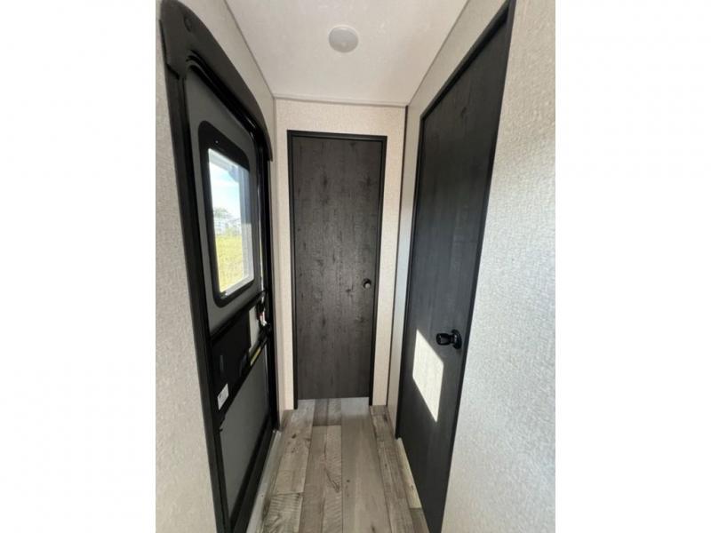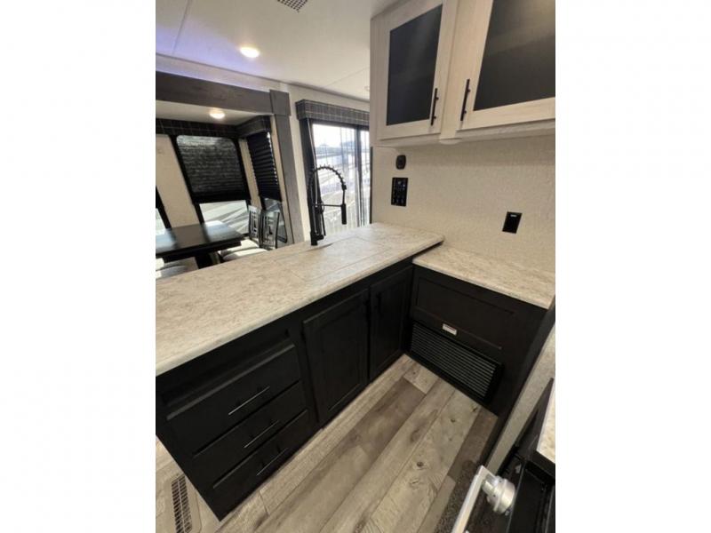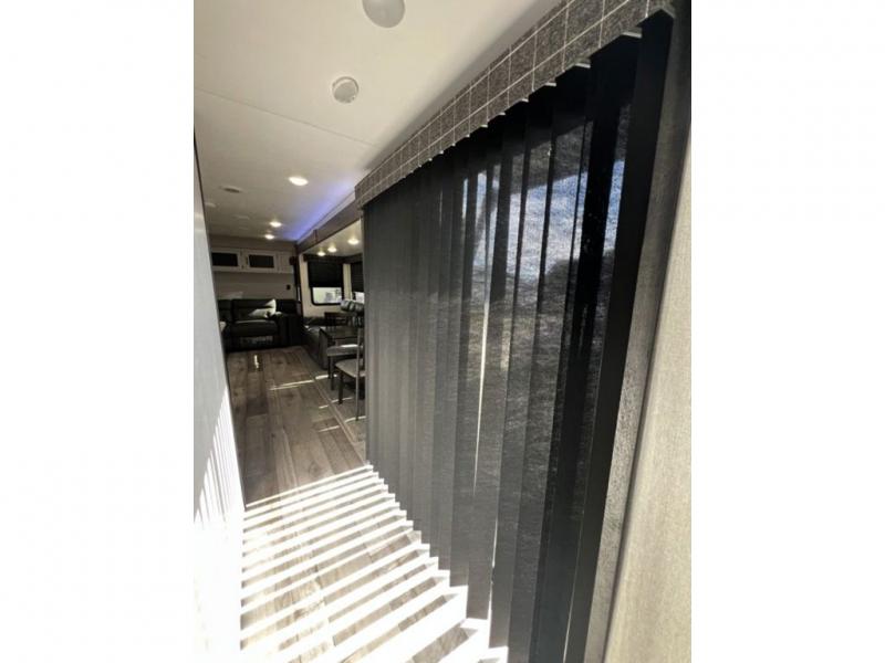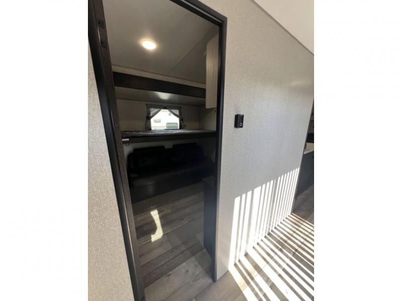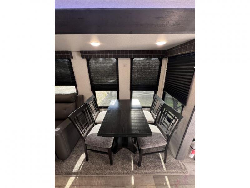 The whole gang will enjoy living in this destination trailer! You will have your own privacy with the rear private bedroom which has a king bed slide across from a dresser with an LED TV and a wardrobe. The kiddos or guests can sleep in the second bedroom with a 34" x 72" hinge bunk above a 70" jackknife sofa. Everyone can freshen up in the full bathroom with a radius shower and keep their bellies full with a three burner cooktop. The table and chairs offer a comfortable place to enjoy your meals and play card games. Your evenings will be quite relaxing when you sit on either the front 70" tri-fold sofa or theater seating across from the 30" electric fireplace and LED TV at the entertainment center!