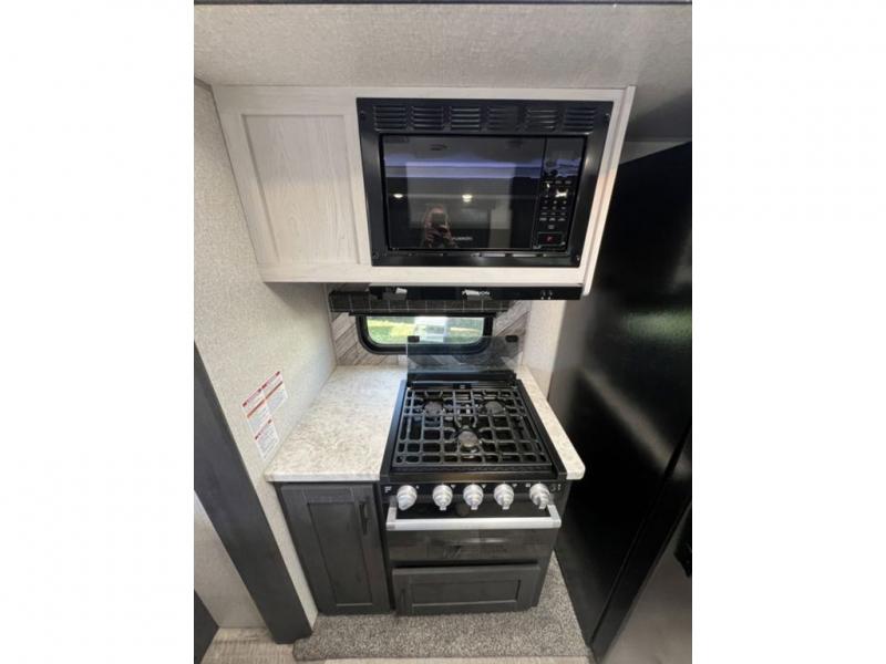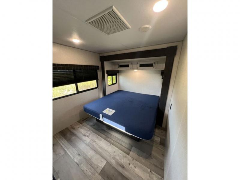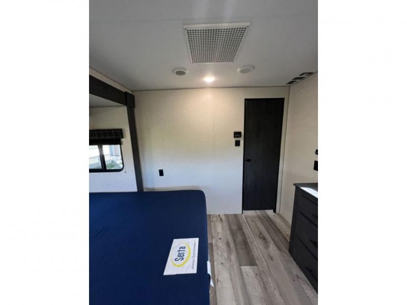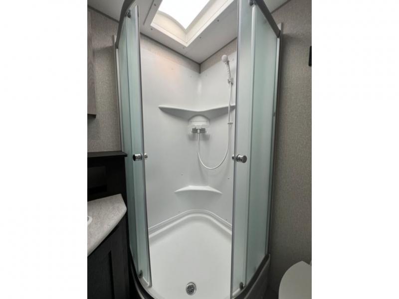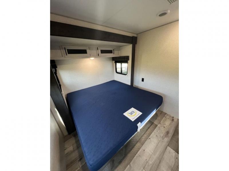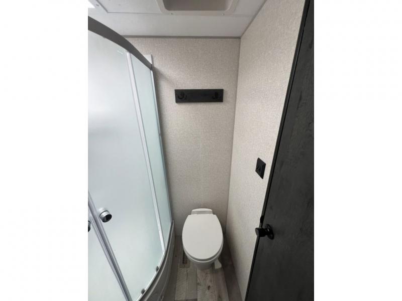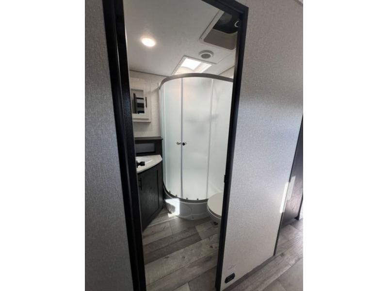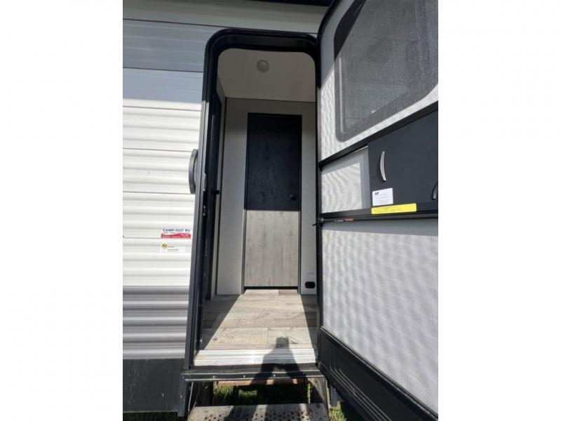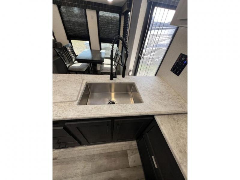 The whole gang will enjoy living in this destination trailer! You will have your own privacy with the rear private bedroom which has a king bed slide across from a dresser with an LED TV and a wardrobe. The kiddos or guests can sleep in the second bedroom with a 34" x 72" hinge bunk above a 70" jackknife sofa. Everyone can freshen up in the full bathroom with a radius shower and keep their bellies full with a three burner cooktop. The table and chairs offer a comfortable place to enjoy your meals and play card games. Your evenings will be quite relaxing when you sit on either the front 70" tri-fold sofa or theater seating across from the 30" electric fireplace and LED TV at the entertainment center!