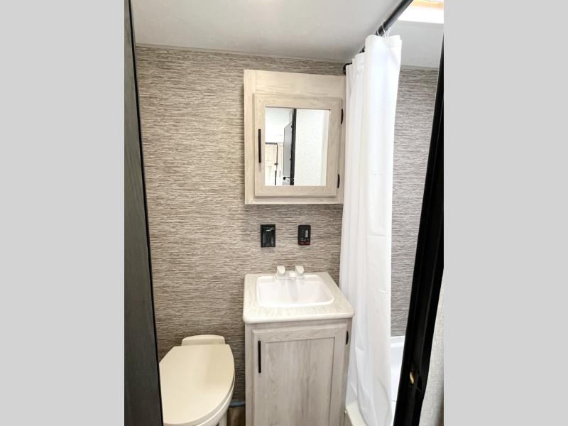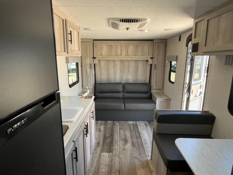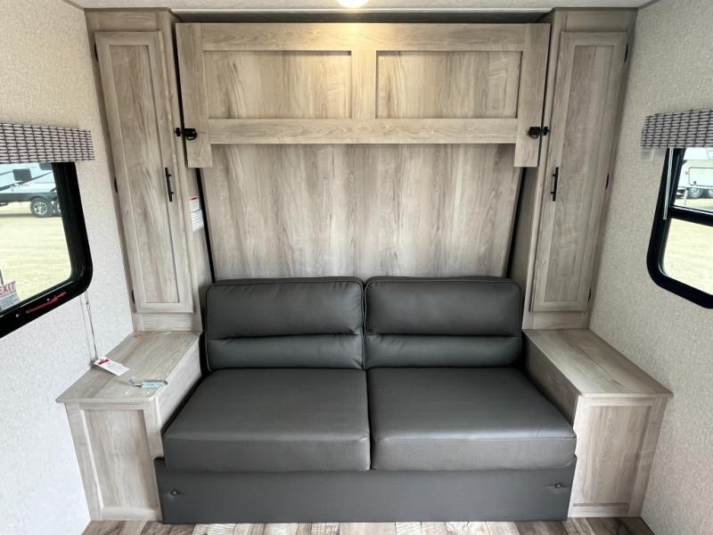 This versatile travel trailer is perfect for weekend trips to the lake. You can enjoy relaxing on the front sofa during the day, and at night you can fold down the queen Murphy bed for comfortable sleeping space. This model also includes a booth dinette that can be used for dining and sleeping space. The chef of your group can prepare meals on the two burner cooktop, and leftovers can go in the 8 cu. ft. 12V refrigerator. This model also includes a 12' power awning that will provide shade while you're outdoors as well.