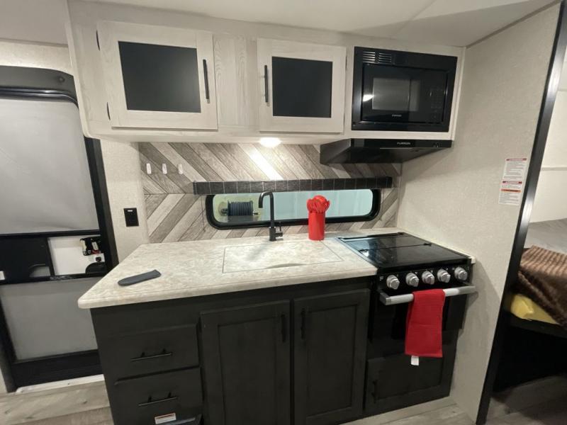 This travel trailer with double-size bunks will be perfect for camping with family or a large group of friends. There is an outside kitchen with a refrigerator and an outside griddle, plus an 18' power awning with LED lights. The chef of your group can prepare lunch on the three burner cooktop or in the microwave oven, and the little ones can take a rest on the double-size bunks. There is a 42" dinette within the slide out that will be perfect for meal times, game night, and sleeping space, plus there is a front queen bed with dual shirt closets.
