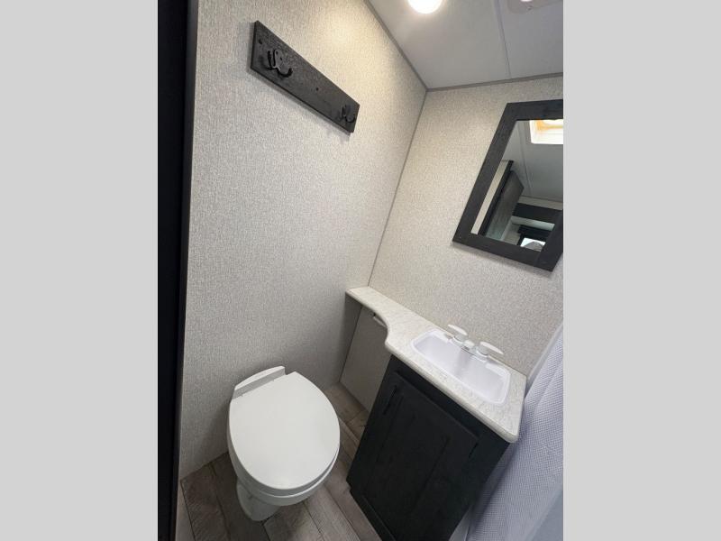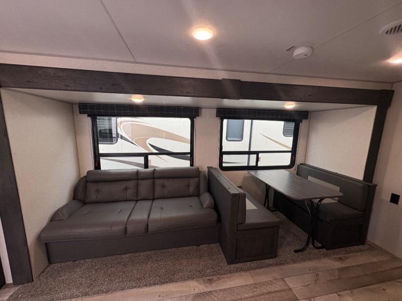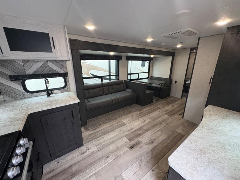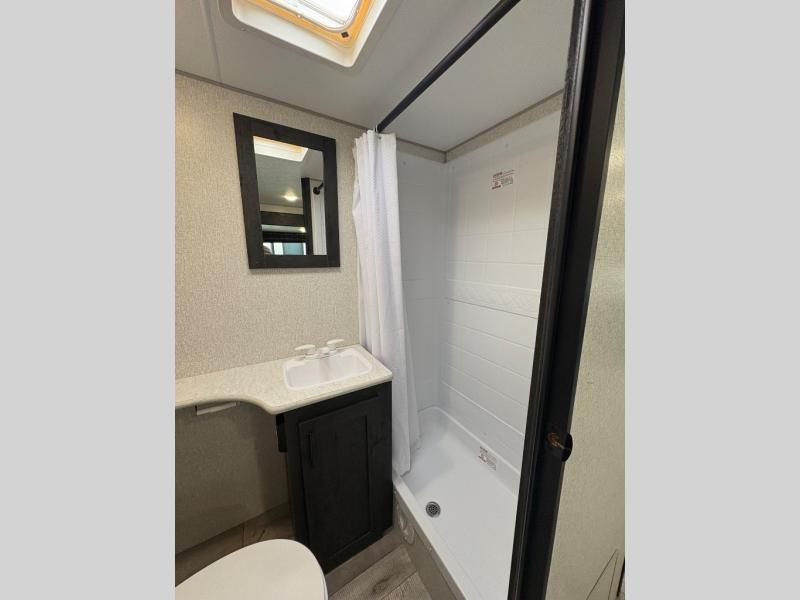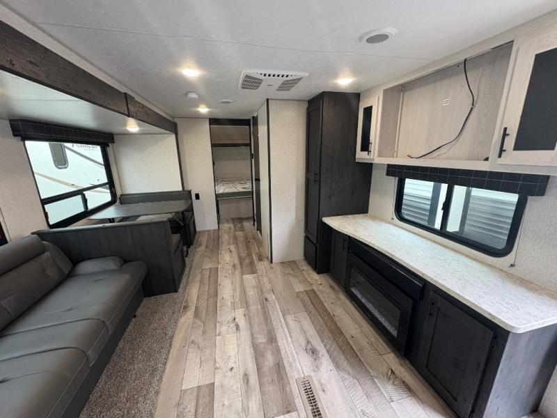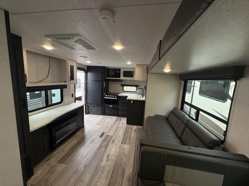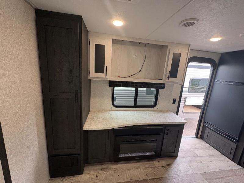 You will love the amount of interior space you have in this travel trailer thanks to the large slide out and rear kitchen with plenty of counter space. There is a 70" sofa and 42" booth dinette within the slide out across from the entertainment center, and you can add the optional 30" fireplace here for more comfort. The full bath includes a bath shelf with towel hooks, plus a foot-flush toilet for convenience. You will feel right at home in the front private bedroom that includes a queen bed, dual shirt closets, plus a TV mount if you choose to bring along a television.