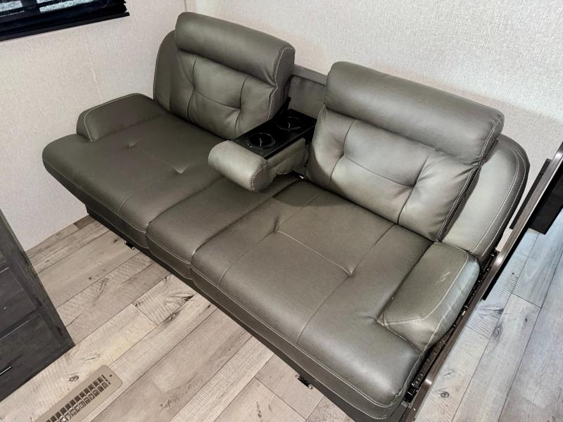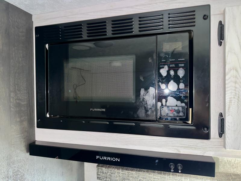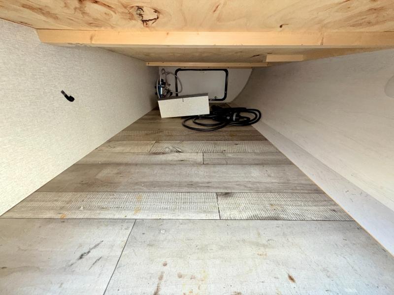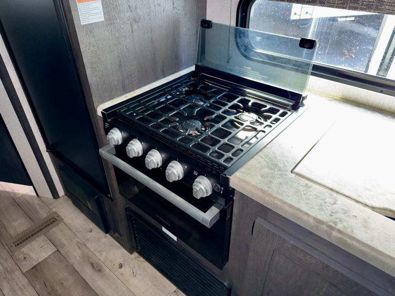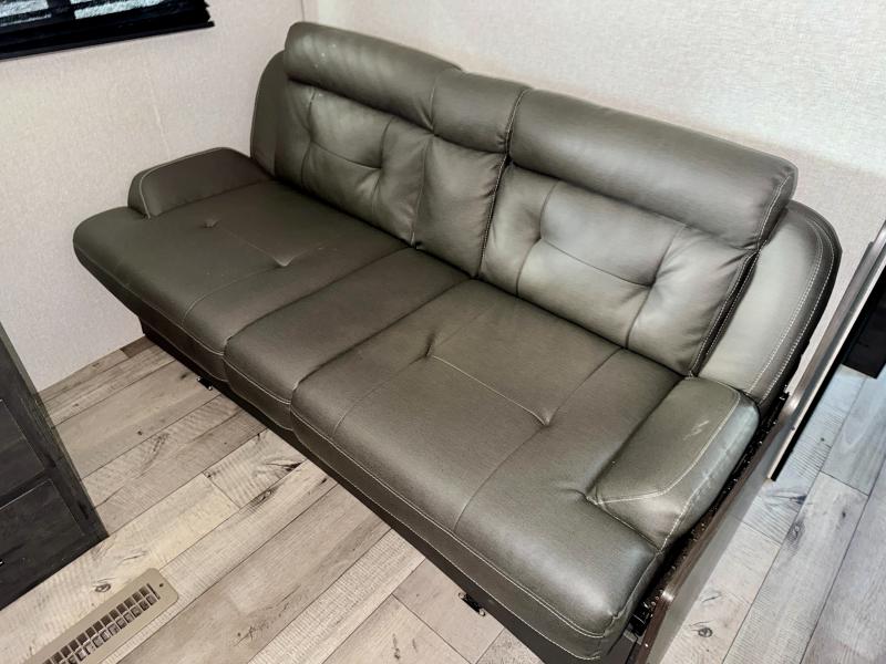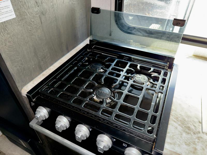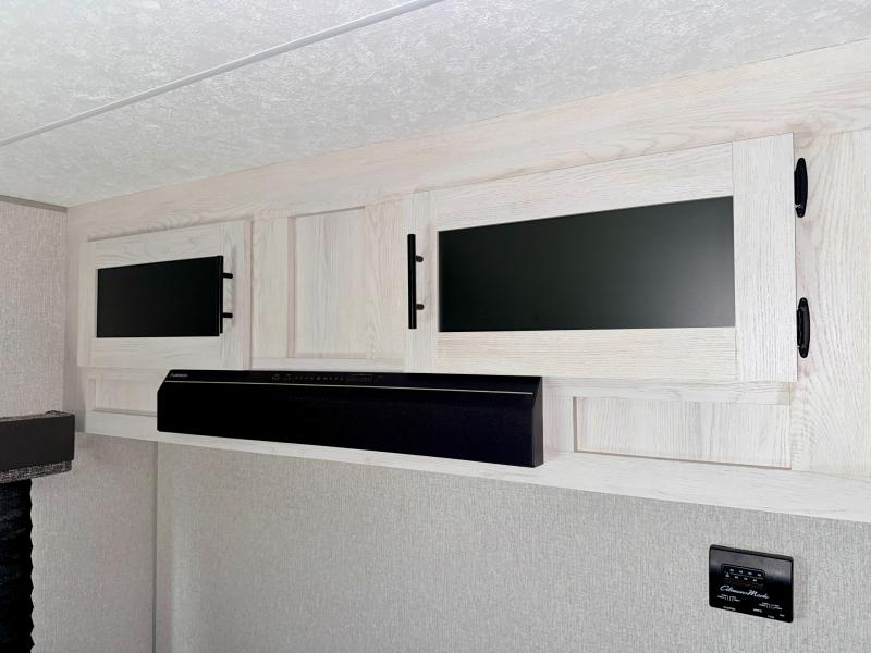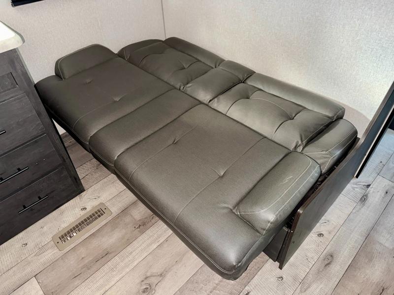 You can comfortably sleep eight people each night in this travel trailer, so invite your whole crew along! The little ones will love the double-size bunks, and the full bath is close by for convenience. You and your spouse can take the front private bedroom that includes a queen bed and dual shirt closets, and any other guests can sleep on the sofa or booth dinette. Prepare a hearty breakfast on the three burner cooktop each morning, and the sink covers will provide you with more counter space to cut up fresh fruit! This model includes plenty of storage space, including an exterior storage door plus a pass-through storage for fishing poles and tackle boxes!