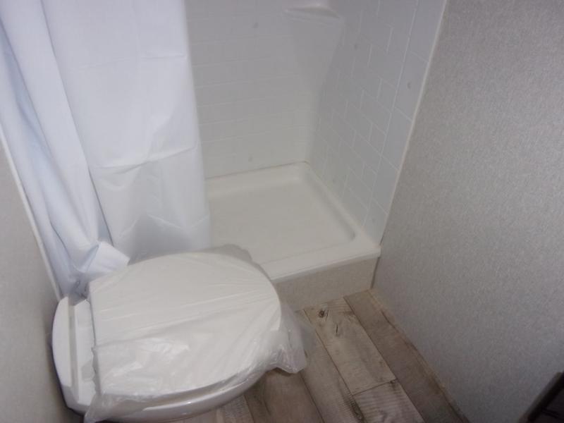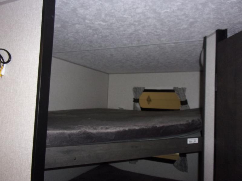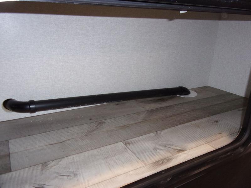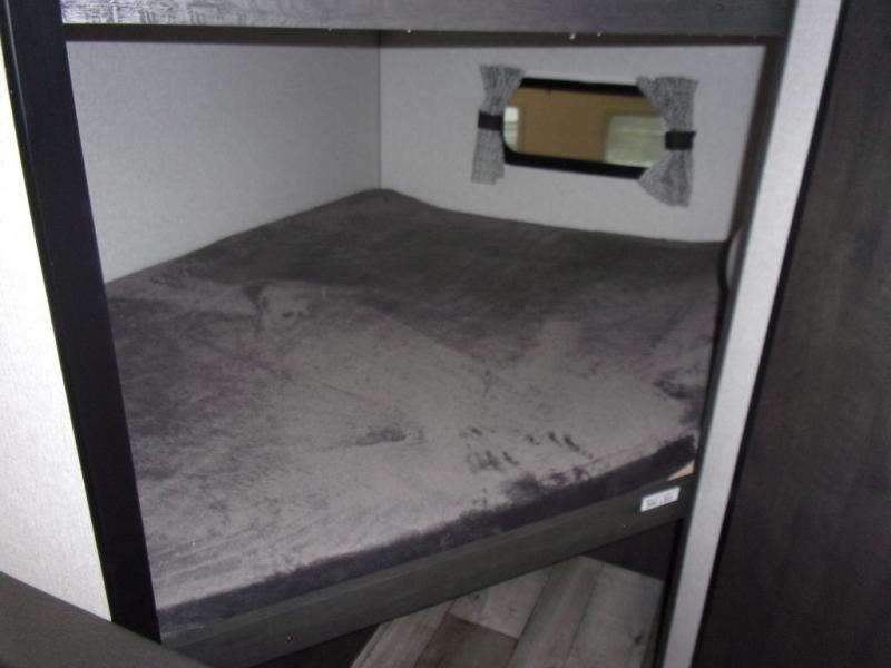 You can comfortably sleep eight people each night in this travel trailer, so invite your whole crew along! The little ones will love the double-size bunks, and the full bath is close by for convenience. You and your spouse can take the front private bedroom that includes a queen bed and dual shirt closets, and any other guests can sleep on the sofa or booth dinette. Prepare a hearty breakfast on the three burner cooktop each morning, and the sink covers will provide you with more counter space to cut up fresh fruit! This model includes plenty of storage space, including an exterior storage door plus a pass-through storage for fishing poles and tackle boxes!