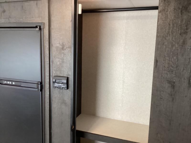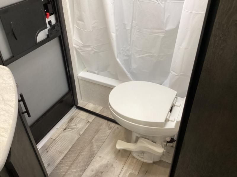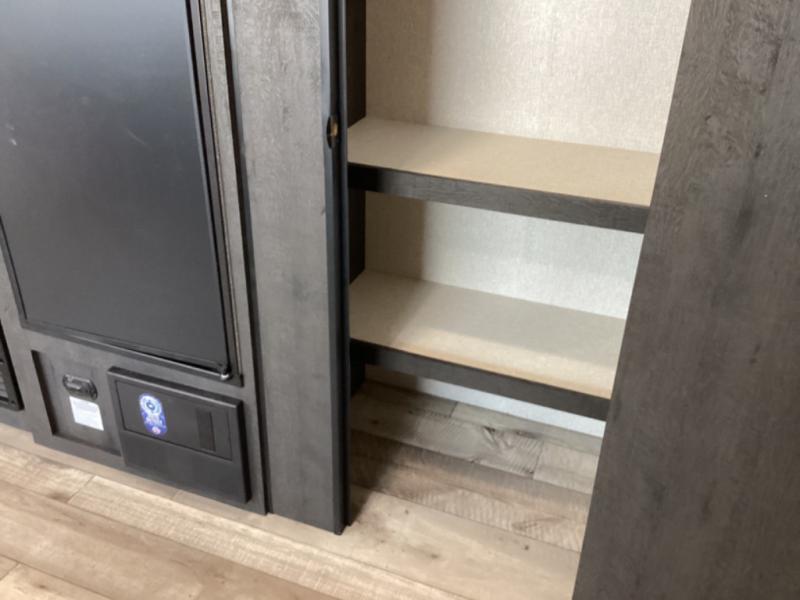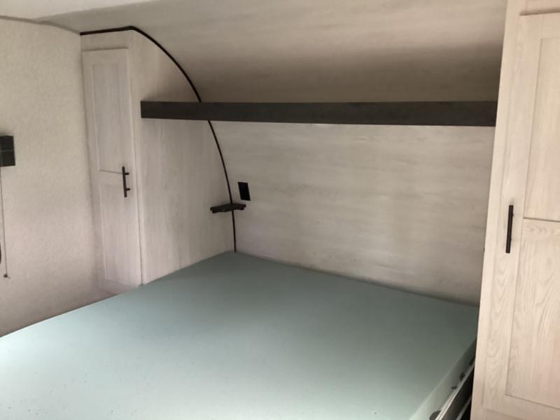 This is a great travel trailer to sleep all your friends or family! Once you arrive at the campground, the chef of your group can prepare lunch on the outside kitchen that includes a griddle and a refrigerator. The 18' power awning here will provide shade from the hot sun, and you can grab the lawn chairs from the pass-through storage to relax. You will find plenty of seating space inside on the 70" sofa and booth dinette within the large slide out, plus there is an entertainment center here. The interior kitchen includes everything you need to prepare meals each day, including a three burner cooktop, a microwave oven, plus a wardrobe/pantry for jackets or dry goods!