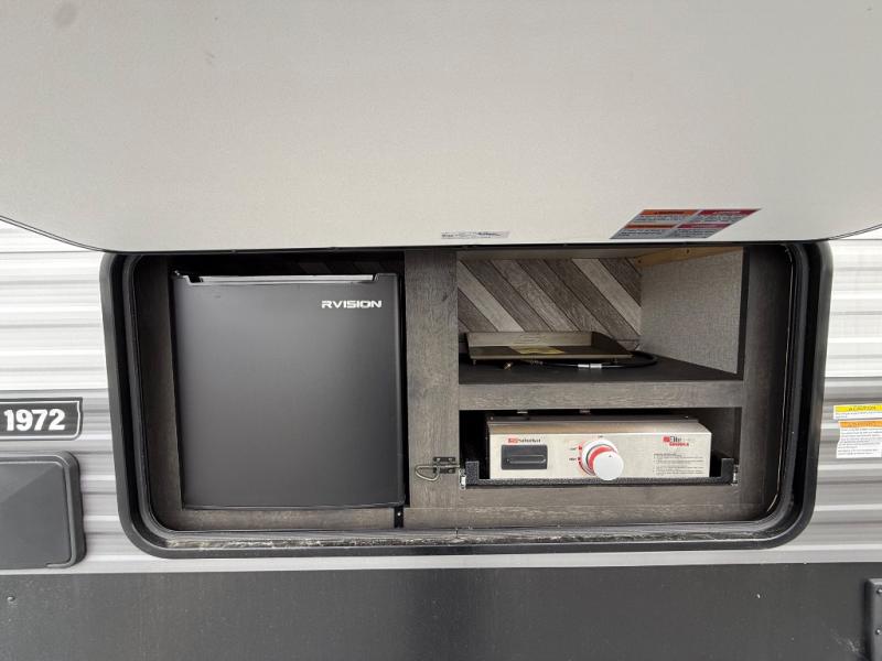 This dual entry, dual slide out travel trailer is perfect for the group of ten for all-around fun! There is a private bunkhouse with four bunks, and the full bath is right outside of the bunkhouse for convenience. Everyone can relax in the main living area on the 64" sofa and around the U-shaped dinette, or head outdoors under the 19' power awning with LED lights. You'll find an outside kitchen with an outside griddle for pancakes and an outdoor refrigerator for cold drinks! Start camping today!