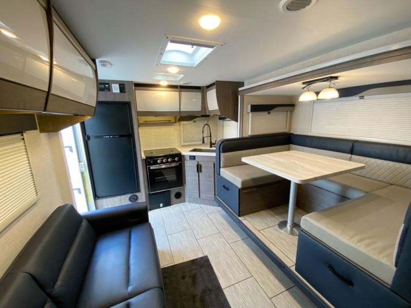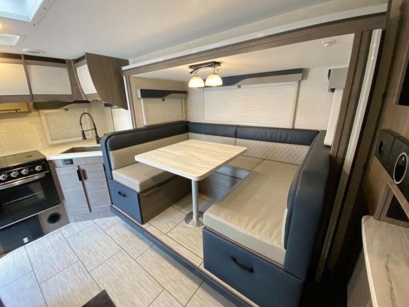 The 2285 floorplan is built around convenience and comfort. A single slide-out expands your living area, creating an open atmosphere for dining, entertaining, or relaxing. The large corner galley kitchen boasts generous counter space and storage, making meal prep a breeze. The U-shaped dinette and full-size sofa bed give you flexible seating and sleeping options for family and friends. Forward, the private bedroom features a walk-around queen bed for restful nights and added personal space. Dual entry doors make coming and going effortless and promote easy traffic flow inside the trailer.