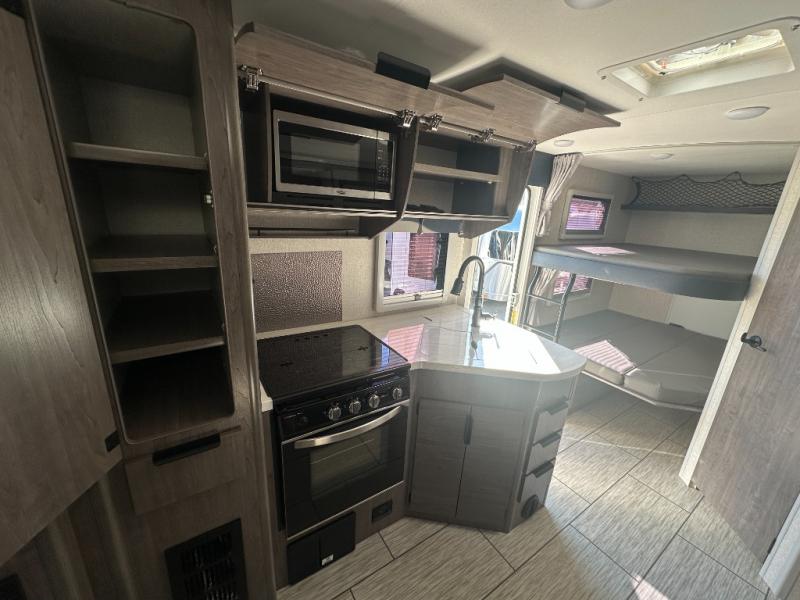 You can take the whole family to a new location with this Lance travel trailer! This trailer has space to sleep eight people with the help of the front queen bed, the U-shaped dinette, and the set of double-size bunks. You'll also have an easy time feeding everyone when you add the optional exterior kitchen because it will give you two kitchens to use. Now you can grill chicken outside and make quick meals inside in the stainless steel microwave. A large slide keeps the interior comfortable with enough space to walk from the front to the back, and the full bathroom is right next to the bunks for late-night bathroom breaks.