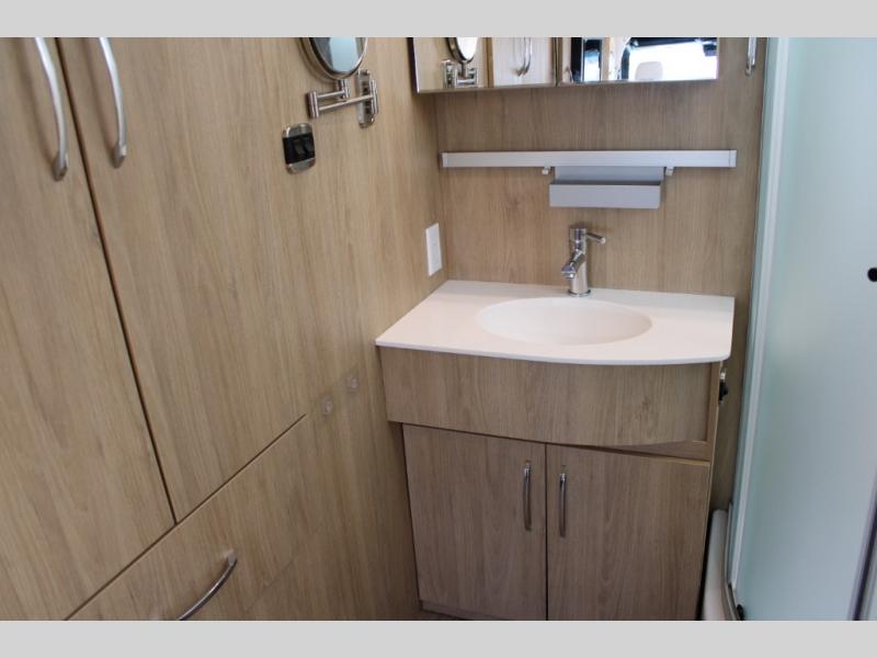 With a large residential-style bathroom in this Unity Class B+ diesel motorhome, you will enjoy every moment you spend cleaning up in the radius shower, and the skylight above will deliver more height and extra sunshine to illuminate the entire space. During the day you can host friends and family with the swivel cab chairs and standard Leisure Lounge, or you can choose to add the optional Leisure Lounge Plus. Once the party has ended, you can rest peacefully for the evening after you've turned down the Murphy bed. The next morning you might decide to make breakfast on the cooktop or in the convection microwave and serve from the countertop extension or on the Corian solid-surface countertops.