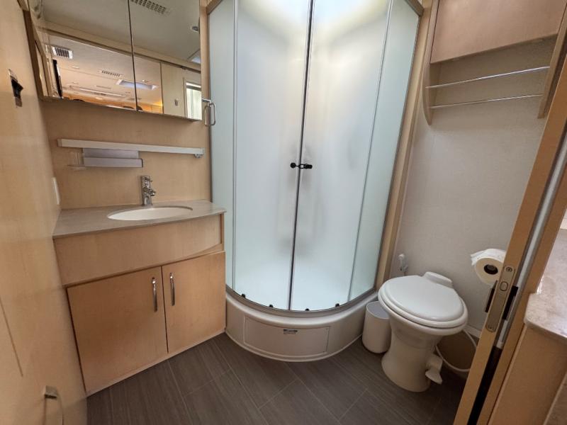 With a large residential-style bathroom in this Unity Class B+ diesel motorhome, you will enjoy every moment you spend cleaning up in the radius shower, and the skylight above will deliver more height and extra sunshine to illuminate the entire space. During the day you can host friends and family with the swivel cab chairs and standard Leisure Lounge, or you can choose to add the optional Leisure Lounge Plus. Once the party has ended, you can rest peacefully for the evening after you've turned down the Murphy bed. The next morning you might decide to make breakfast on the cooktop or in the convection microwave and serve from the countertop extension or on the Corian solid-surface countertops.