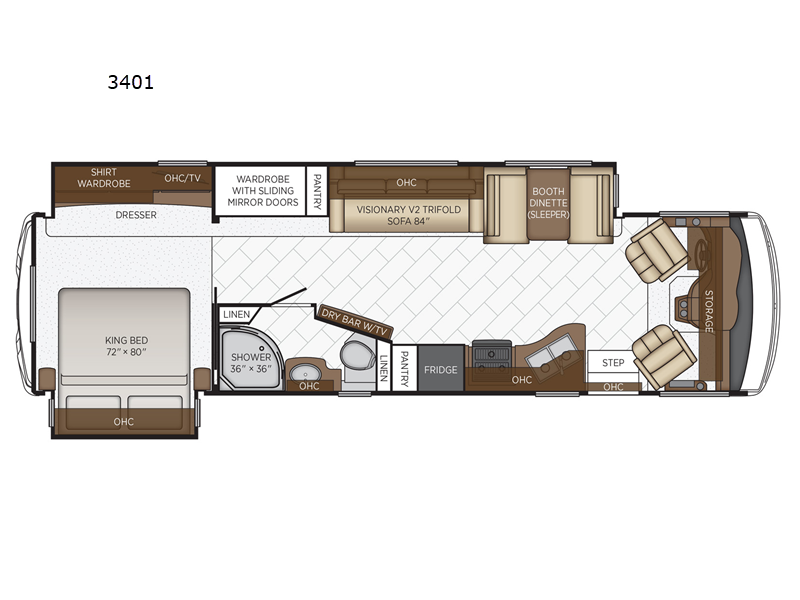 You will love the amount of space you have in this motorhome thanks to the full-wall slide out and the king bed slide in the rear bedroom. The wardrobe with sliding mirror doors allows you to bring along your favorite outfits and keep them wrinkle-free, and there are plenty of overhead compartments for your valuables. While the chef of your group is preparing lunch on the recessed three burner cooktop, your guests can relax on the tri-fold sofa or booth dinette. This model also includes a dry bar with an LED TV to keep you entertained on those rainy days!