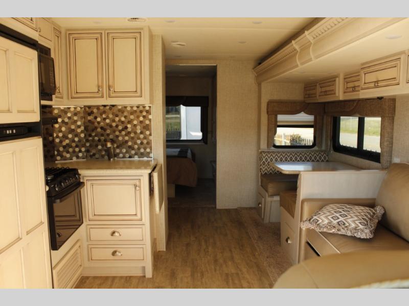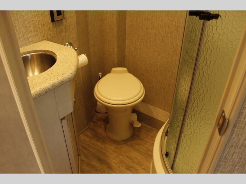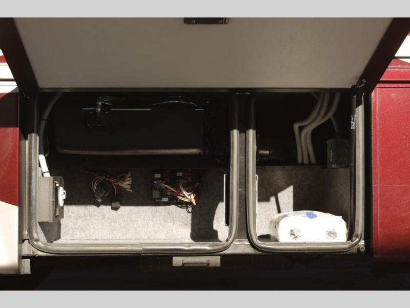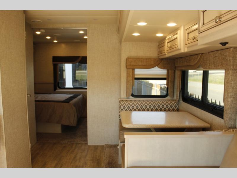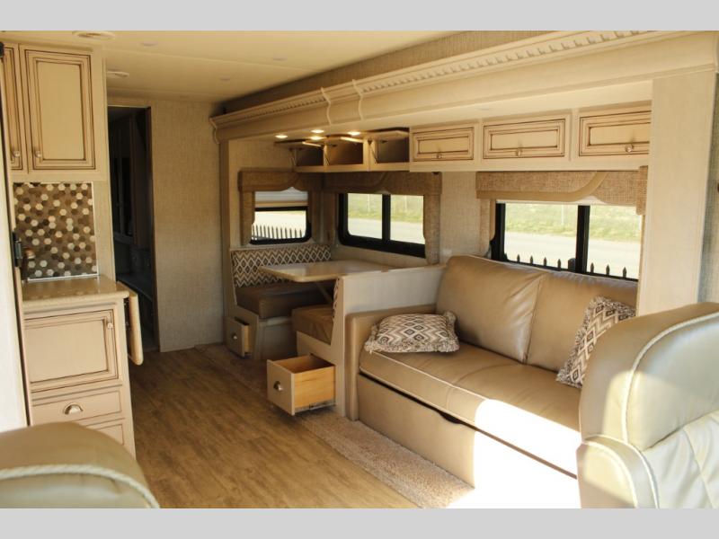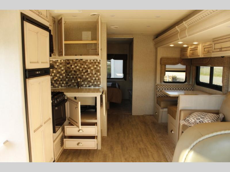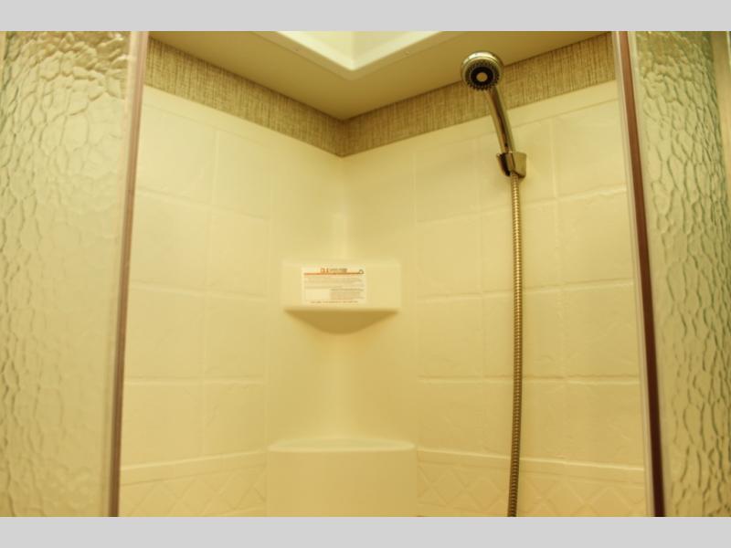 This cozy motorhome can sleep five people each night, so invite your friends along for a weekend by the lake. They can sleep on the comfort lounge sofa and booth dinette, while you take the slide out queen bed in the rear private bedroom. If you're needing more sleeping space, just add the optional drop-down overhead bunk! The full bath includes a shower skylight for added light and space and ABS shower surround, and the bedroom includes a shirt wardrobe, plus a 32" bedroom TV to watch a show in bed!