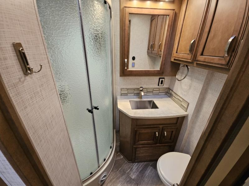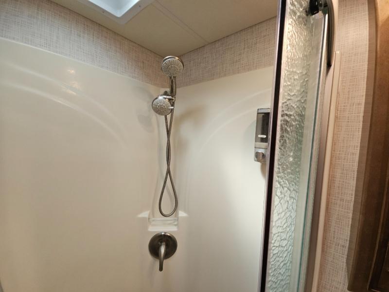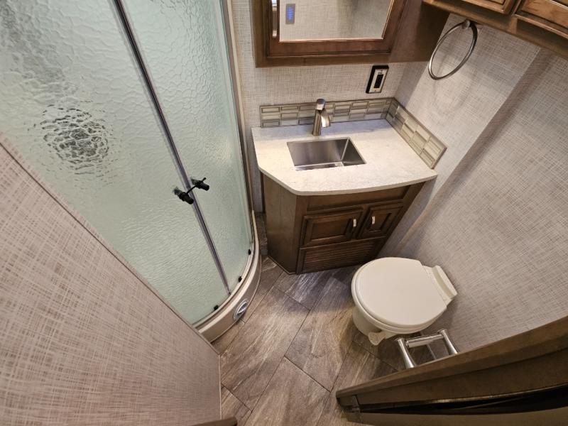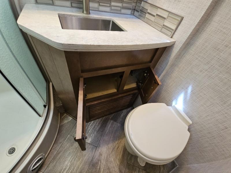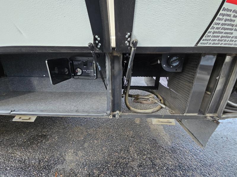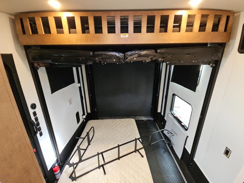 Travel to your favorite destinations with your favorite off-road toys in this toy hauler! It has a 95.5" x 120" garage area that leads directly into the private bedroom which has a queen bed slide to lay your head at night and a dresser with a shirt wardrobe to store your clothes. The chef can prepare their best meals in the kitchen with the three burner cooktop and you can enjoy them at the booth dinette sleeper. After a fun day on the trails, you can rinse off in the 35" x 35" radius shower, grab a snack from the kitchen pantry, and relax on the 74" comfort lounge sofa while you watch a movie on the LED TV!