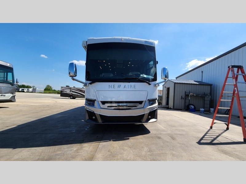 With any Newmar New Aire Class A diesel motorhome, you can enjoy luxury, functionality, style, and modern amenities wrapped up in a small package! And these coaches standout on the road with the redesigned front and rear end caps, the lighted Newmar badge on the front grill, and other sleek LED trim lighting on the front cap. Each is built on a Freightliner chassis with 450HP Cummins diesel engine giving you the power you want, and includes V-Ride drive axle suspension. More standout features include the back-up alarm, recessed fuel fills with crossover to fill from either side, the Comfort Drive steering, the tire pressure display on the dash, and Mobile Eye lane tracking. The all-electric stainless steel appliance suite includes an induction cooktop, a three-door Samsung residential refrigerator, and a Samsung microwave, plus the kitchen offers a redesigned backsplash and countertop edging. There is so much more to enjoy, make your selection today!