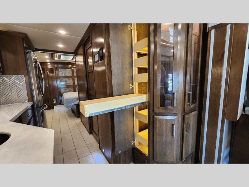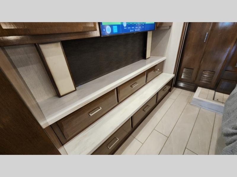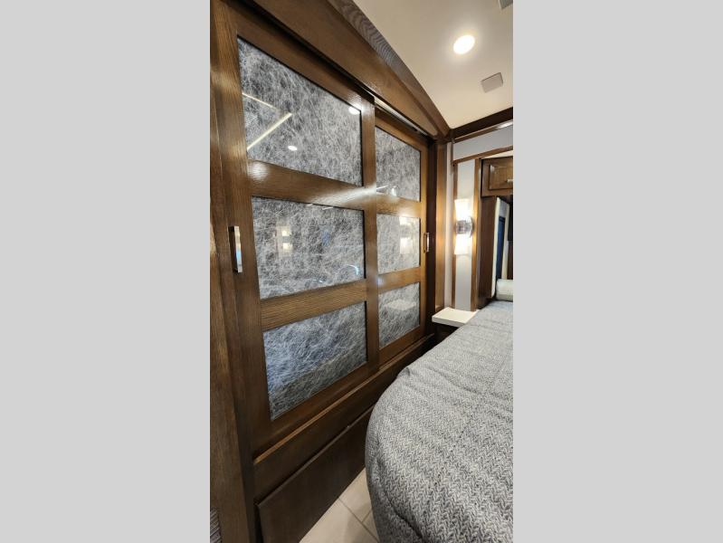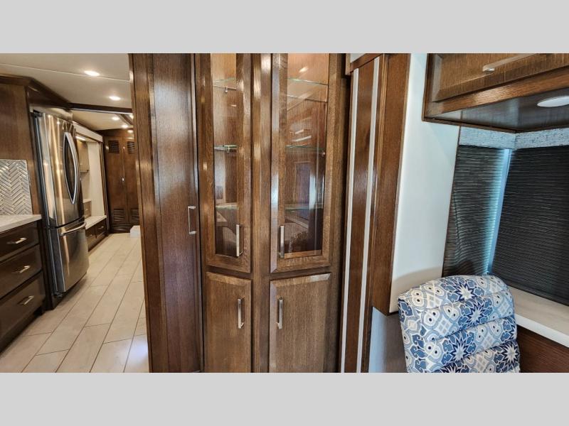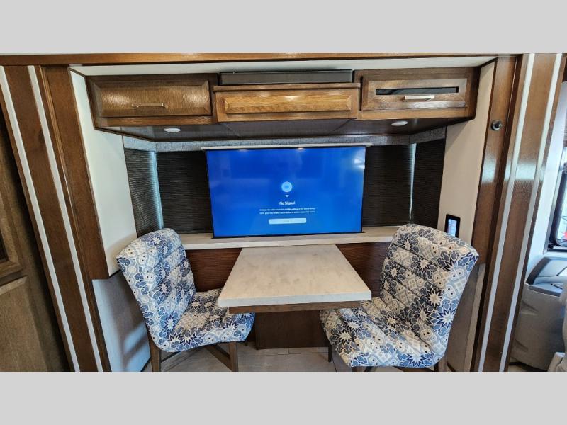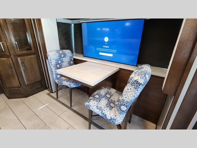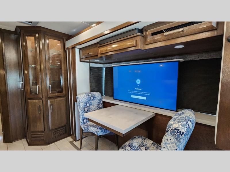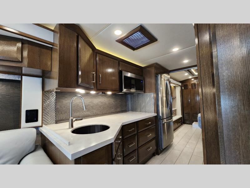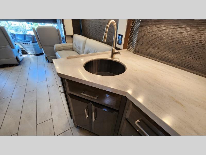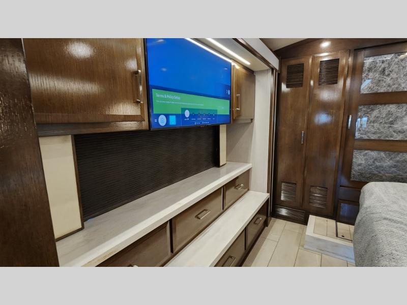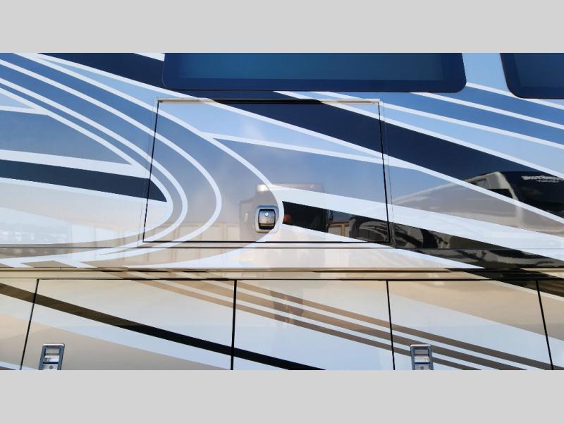 You and your favorite person will love traveling and sleeping in this coach thanks to the all the comfortable features, plus all the luxury, style and convenience throughout! Beginning with the rear bedroom with a king bed with a headboard and window above, the wardrobe with sliding mirror doors to be able to look at your full outfit before heading out, plus there is a space for a washer/dryer option that makes traveling convenient. The mid-coach full bathroom even has a seated shower, and the full-wall slide along with the two additional slide outs provide more space in each room. The main living area offers a visionary sofa, and a buffet dinette with four chairs. You will also have a 50" TV to watch. The kitchen suite provides stainless steel appliances that are stylish and allow you to make meals for two, three or more. The redesigned fascias and feature ceiling, the flooring, the drawers with dove tail self closing full extension ball bearing guides, and the super polished solid surface countertop in the kitchen, bathroom and bedroom are more reasons you want to buy this coach!