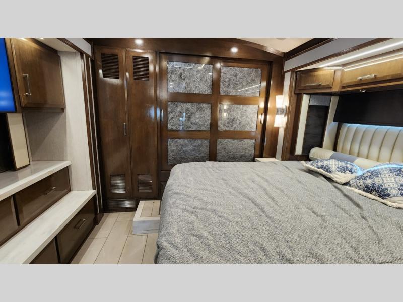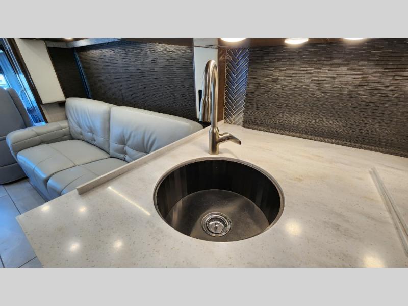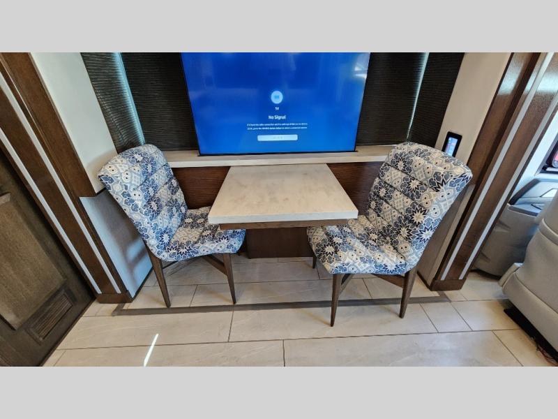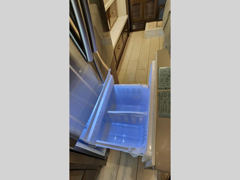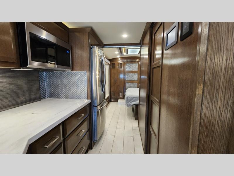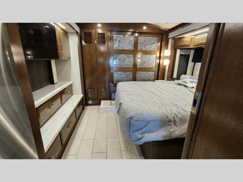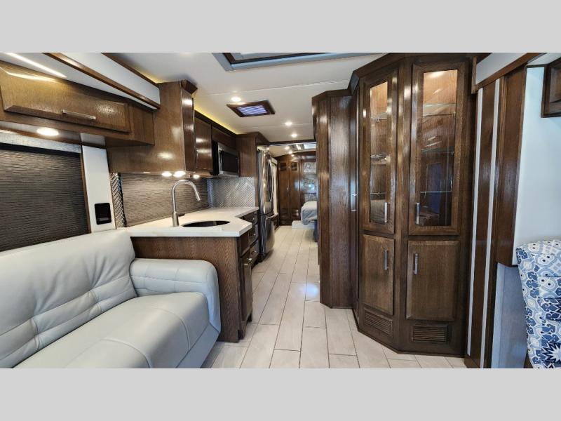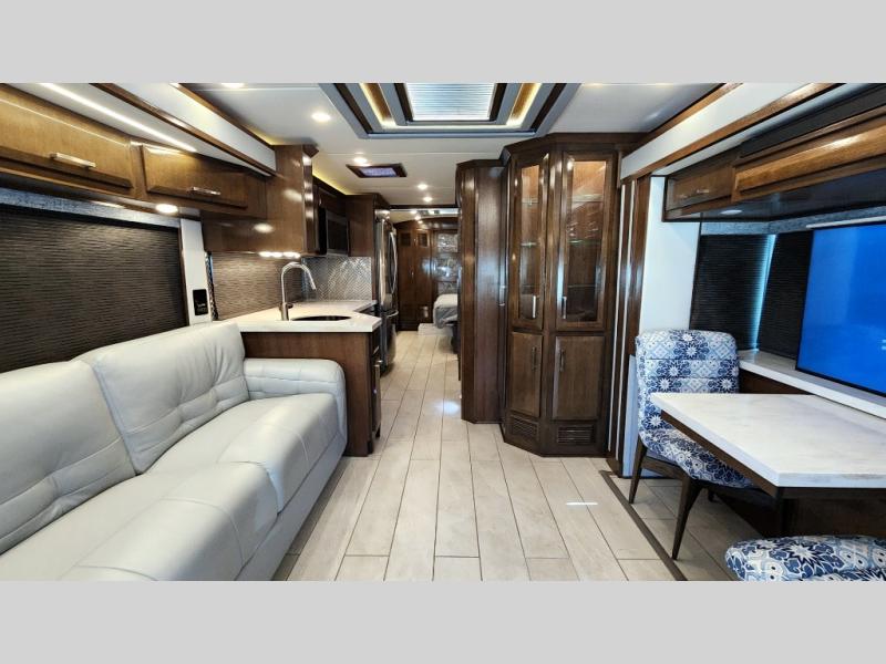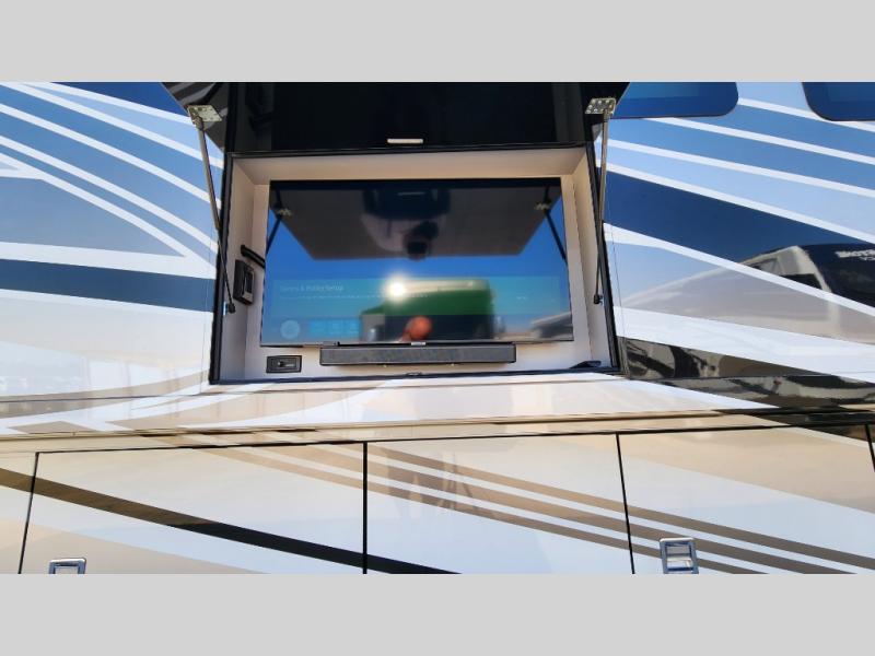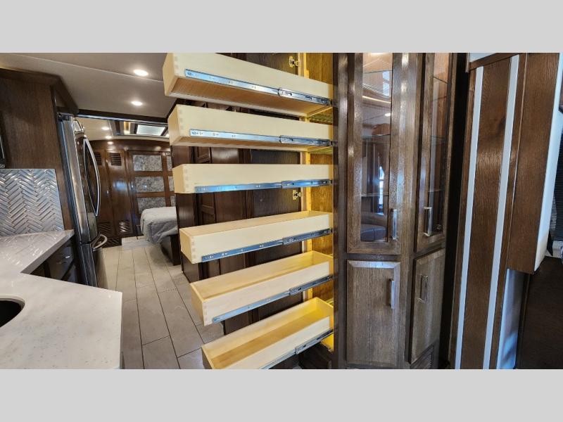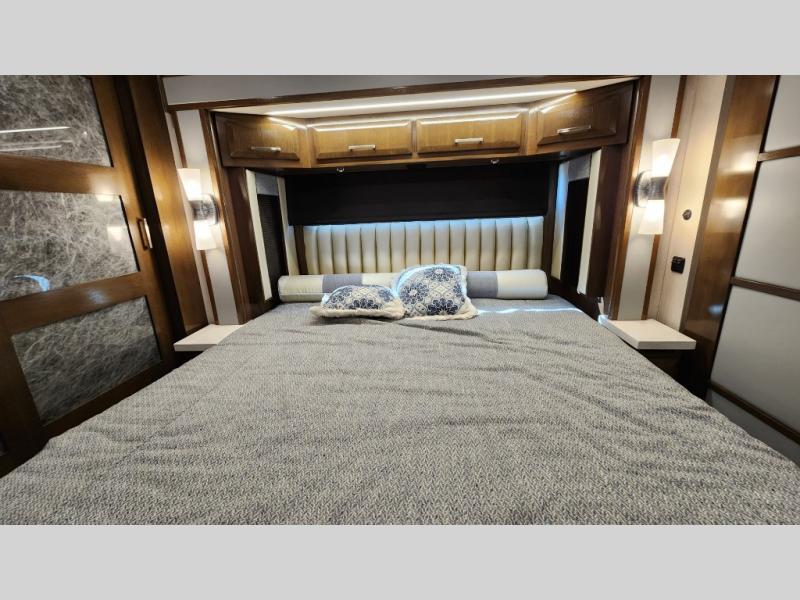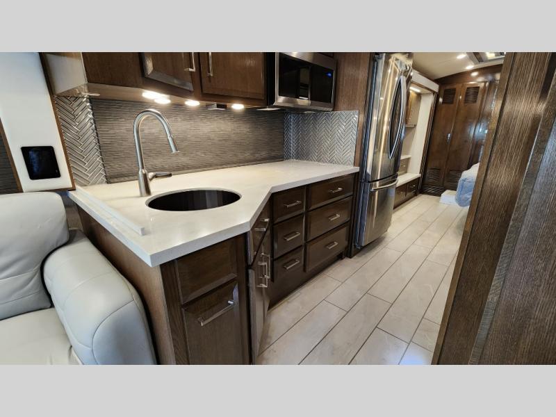 You and your favorite person will love traveling and sleeping in this coach thanks to the all the comfortable features, plus all the luxury, style and convenience throughout! Beginning with the rear bedroom with a king bed with a headboard and window above, the wardrobe with sliding mirror doors to be able to look at your full outfit before heading out, plus there is a space for a washer/dryer option that makes traveling convenient. The mid-coach full bathroom even has a seated shower, and the full-wall slide along with the two additional slide outs provide more space in each room. The main living area offers a visionary sofa, and a buffet dinette with four chairs. You will also have a 50" TV to watch. The kitchen suite provides stainless steel appliances that are stylish and allow you to make meals for two, three or more. The redesigned fascias and feature ceiling, the flooring, the drawers with dove tail self closing full extension ball bearing guides, and the super polished solid surface countertop in the kitchen, bathroom and bedroom are more reasons you want to buy this coach!
