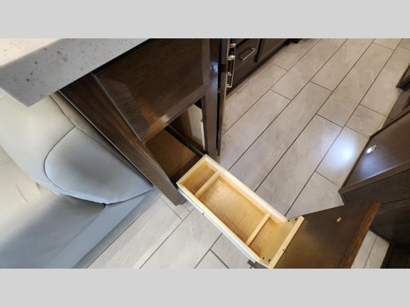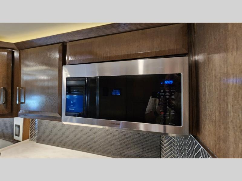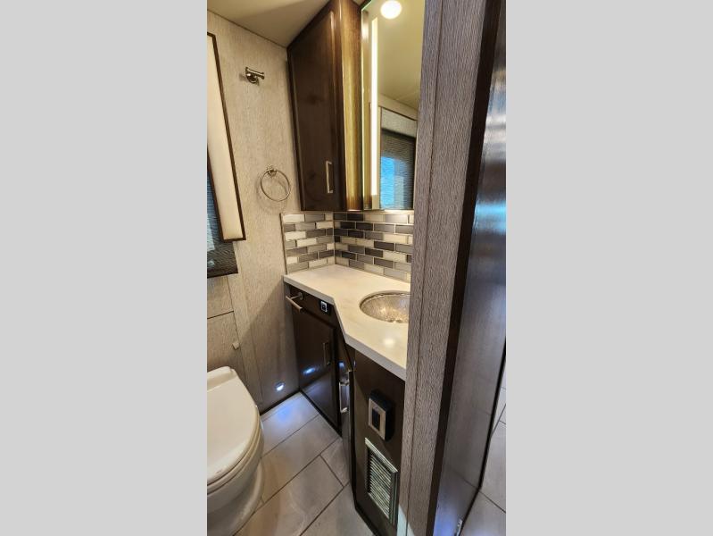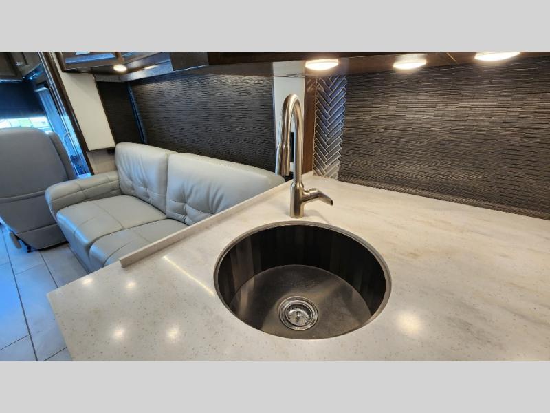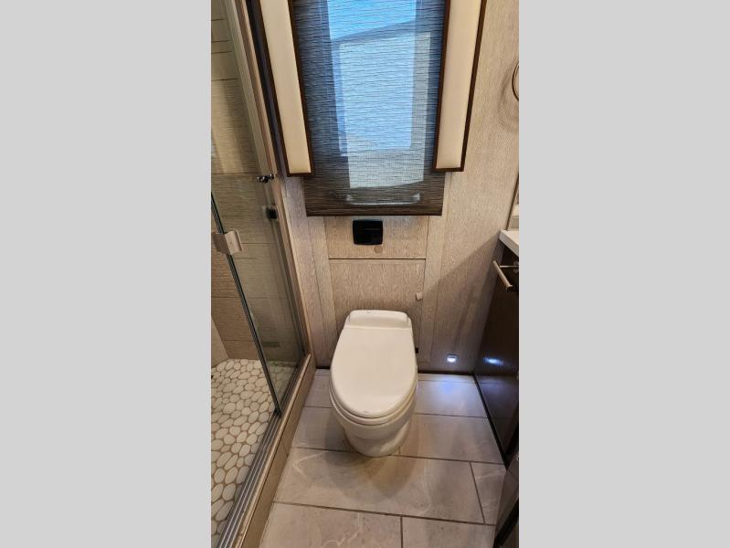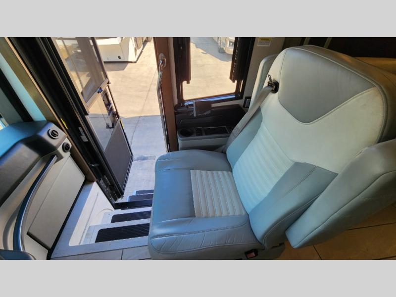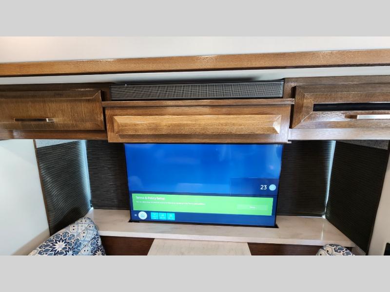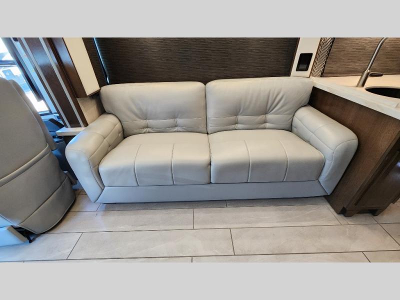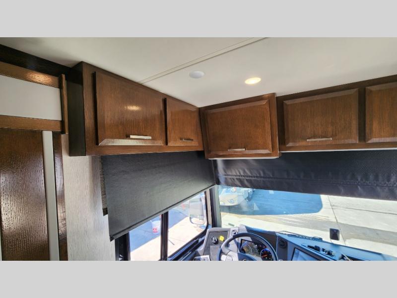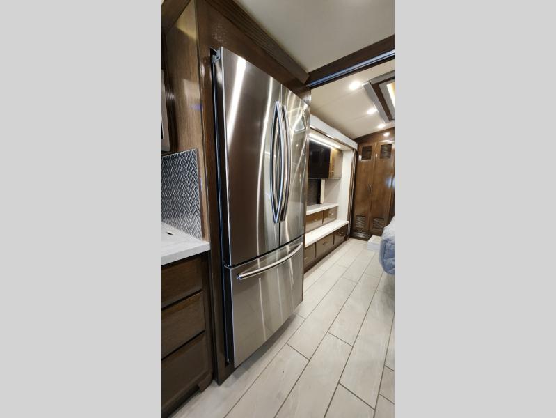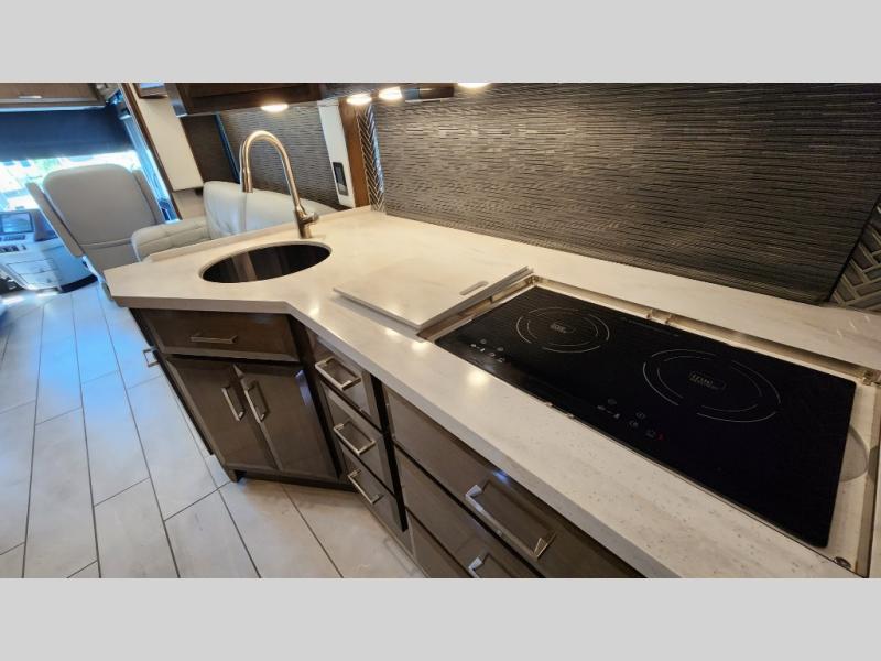 You and your favorite person will love traveling and sleeping in this coach thanks to the all the comfortable features, plus all the luxury, style and convenience throughout! Beginning with the rear bedroom with a king bed with a headboard and window above, the wardrobe with sliding mirror doors to be able to look at your full outfit before heading out, plus there is a space for a washer/dryer option that makes traveling convenient. The mid-coach full bathroom even has a seated shower, and the full-wall slide along with the two additional slide outs provide more space in each room. The main living area offers a visionary sofa, and a buffet dinette with four chairs. You will also have a 50" TV to watch. The kitchen suite provides stainless steel appliances that are stylish and allow you to make meals for two, three or more. The redesigned fascias and feature ceiling, the flooring, the drawers with dove tail self closing full extension ball bearing guides, and the super polished solid surface countertop in the kitchen, bathroom and bedroom are more reasons you want to buy this coach!