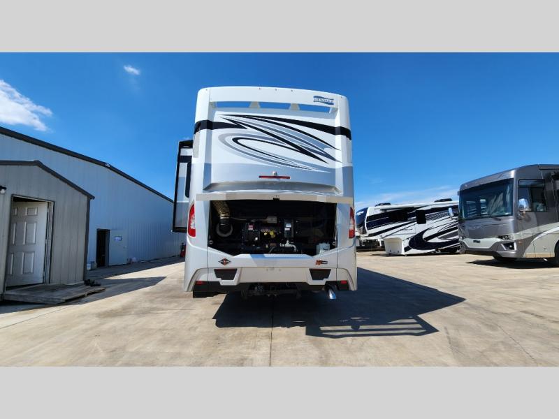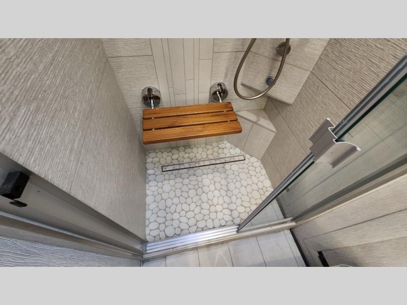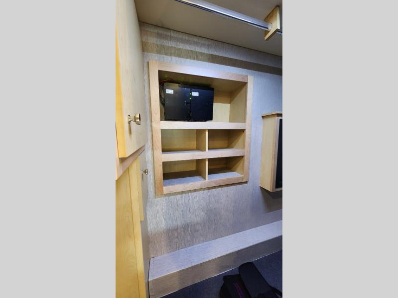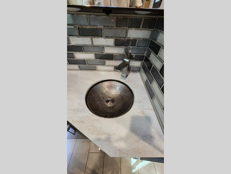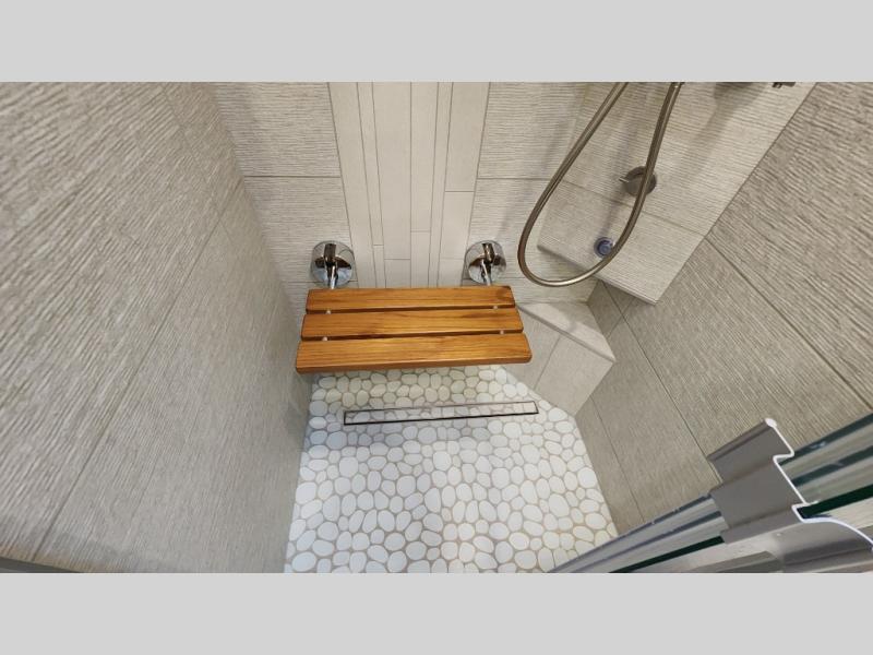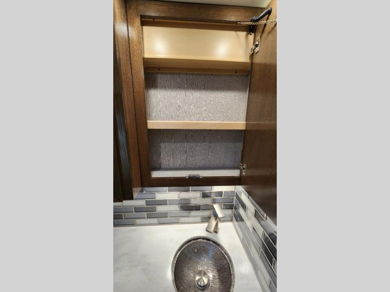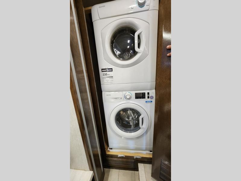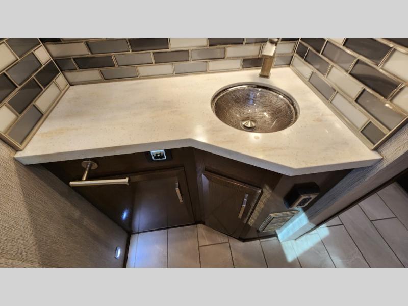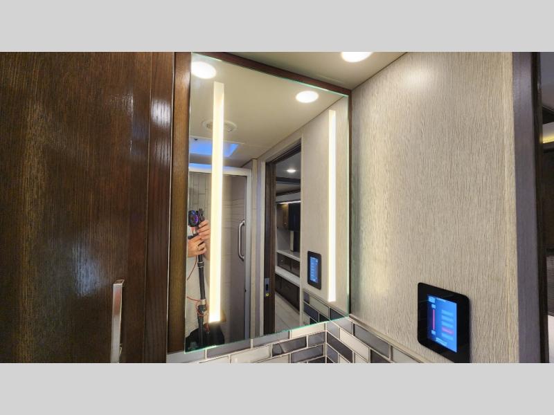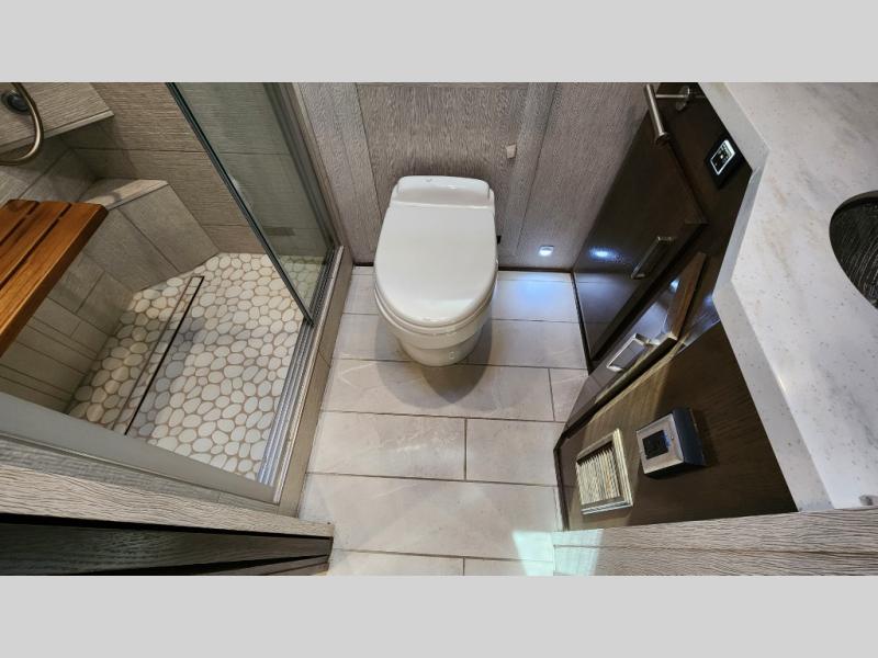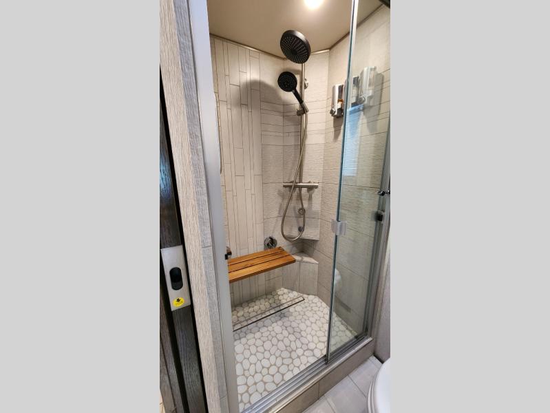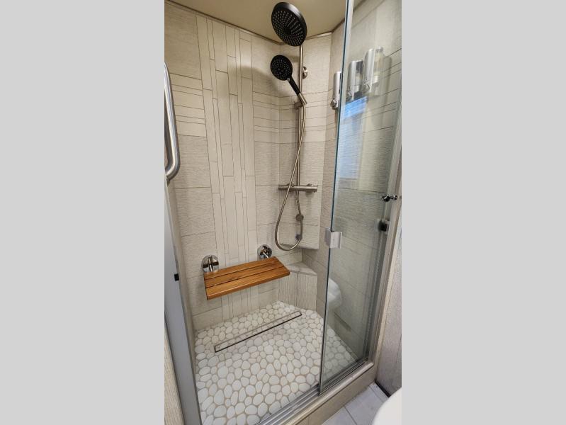 You and your favorite person will love traveling and sleeping in this coach thanks to the all the comfortable features, plus all the luxury, style and convenience throughout! Beginning with the rear bedroom with a king bed with a headboard and window above, the wardrobe with sliding mirror doors to be able to look at your full outfit before heading out, plus there is a space for a washer/dryer option that makes traveling convenient. The mid-coach full bathroom even has a seated shower, and the full-wall slide along with the two additional slide outs provide more space in each room. The main living area offers a visionary sofa, and a buffet dinette with four chairs. You will also have a 50" TV to watch. The kitchen suite provides stainless steel appliances that are stylish and allow you to make meals for two, three or more. The redesigned fascias and feature ceiling, the flooring, the drawers with dove tail self closing full extension ball bearing guides, and the super polished solid surface countertop in the kitchen, bathroom and bedroom are more reasons you want to buy this coach!