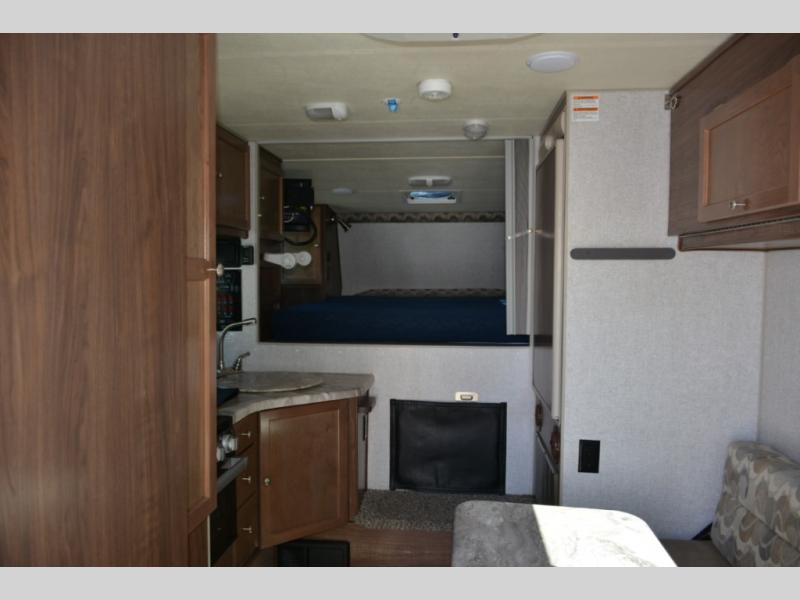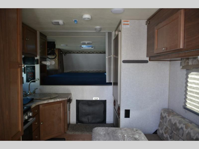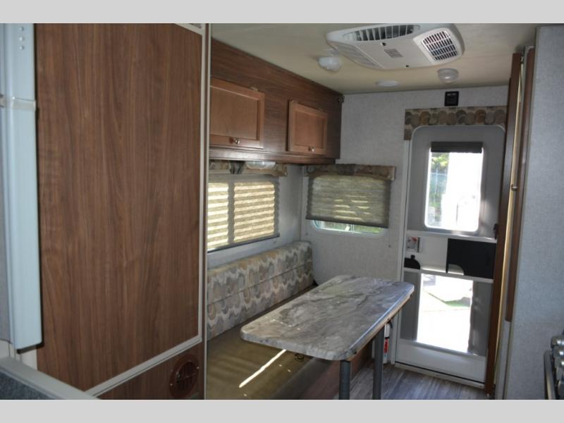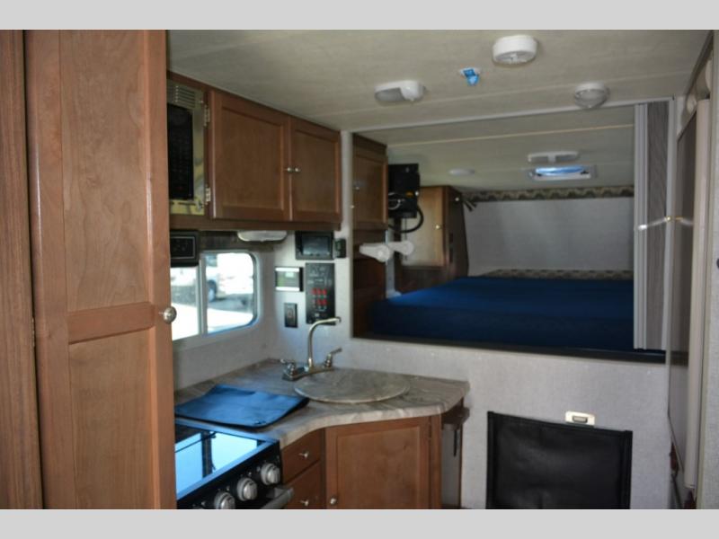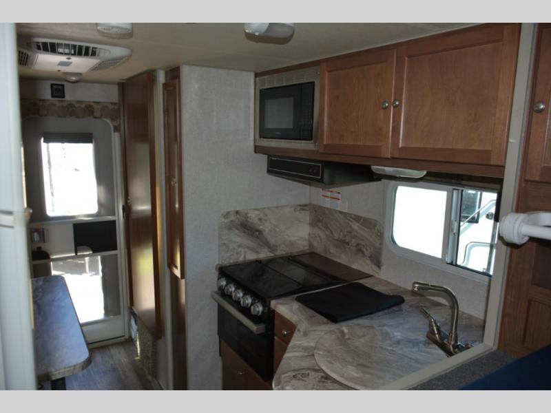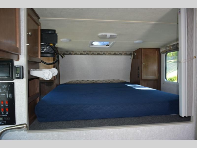 Head across the states in this comfortable truck camper for four. Once you find a campground to park for the night, start lunch on the three burner cooktop, or use the microwave for a quick meal. The U-shaped dinette will be the perfect place to dine at, or you can choose the optional roll-over sofa here. The dinette converts to a 38" x 77" sleeping area, plus there is an overhead bunk. You will enjoy the front 58" x 80" queen bed that includes three wardrobes and a nightstand for your things, and don't forget to add the optional 19" 12V LED TV for movies in bed.