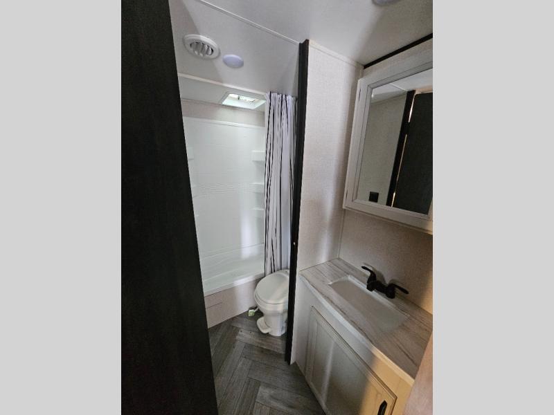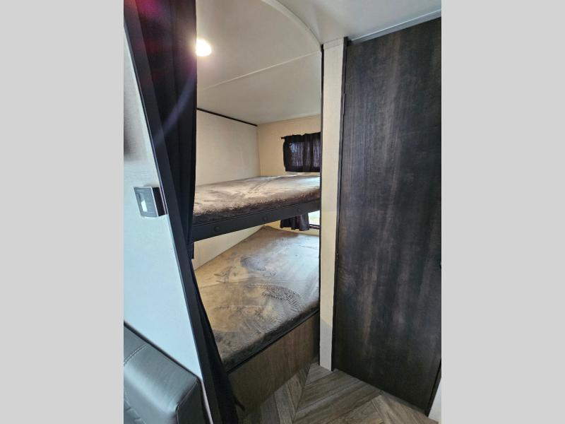The whole gang will love camping in this travel trailer! Everyone will have a comfortable place to lay their head at night from the double over double bunk beds to the bed inside the front private bedroom, plus the jackknife sofa and booth dinette can transform into extra sleeping spaces. Start your mornings off by freshening up the tub/shower in the rear corner bathroom then fry up some eggs on the three burner cooktop and enjoy a cold glass of orange juice stored in the 6 cu. ft. gas/electric refrigerator. Don't leave behind your outdoor gear, simply store it in the exterior storage areas. The exterior sprayer hose lets you rinse off your feet before entering, and the exterior docking station is handy, plus there is a grill hookup area!