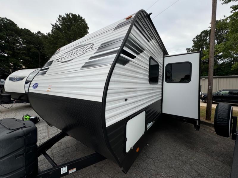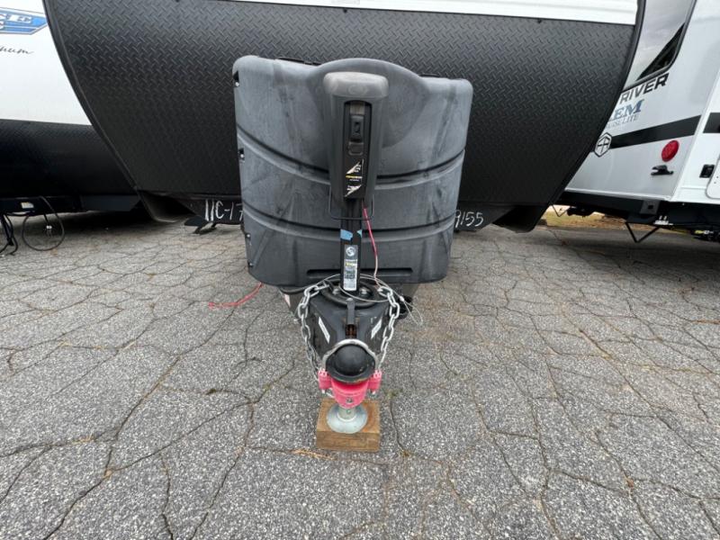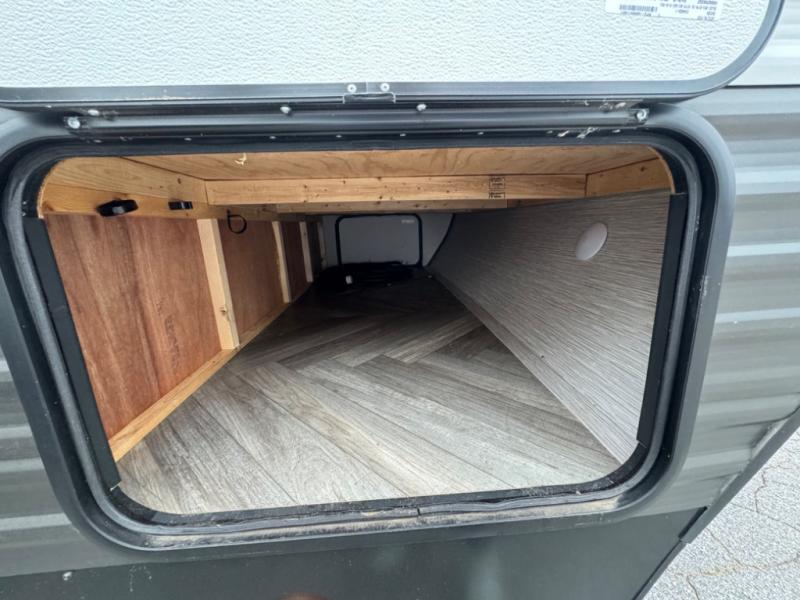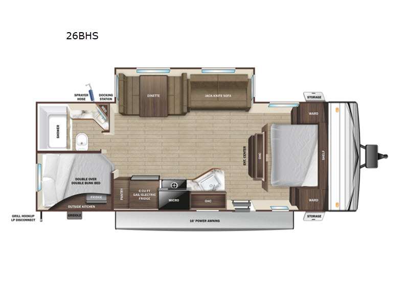 Pack your bags and load up this travel trailer for a fun weekend camping trip! It features a front private bedroom with a bed that has wardrobes on either side to keep your clothes looking nice, and a set of double over double bunk beds for the kids or guests to sleep. You can even bring a couple more guests to sleep on the booth dinette and jackknife sofa slide once they are converted. The chef will be able to prepare their best meals with the three burner cooktop inside, but love cooking at the outside kitchen more. Everyone will stay clean and fresh with the shower in the rear corner bathroom, and the exterior sprayer hose helps to keep the dirt outside where it belongs!