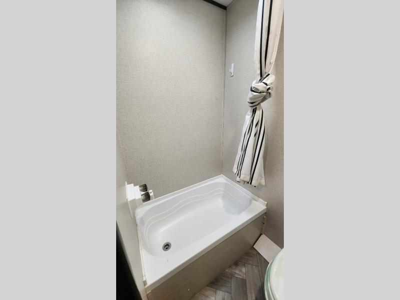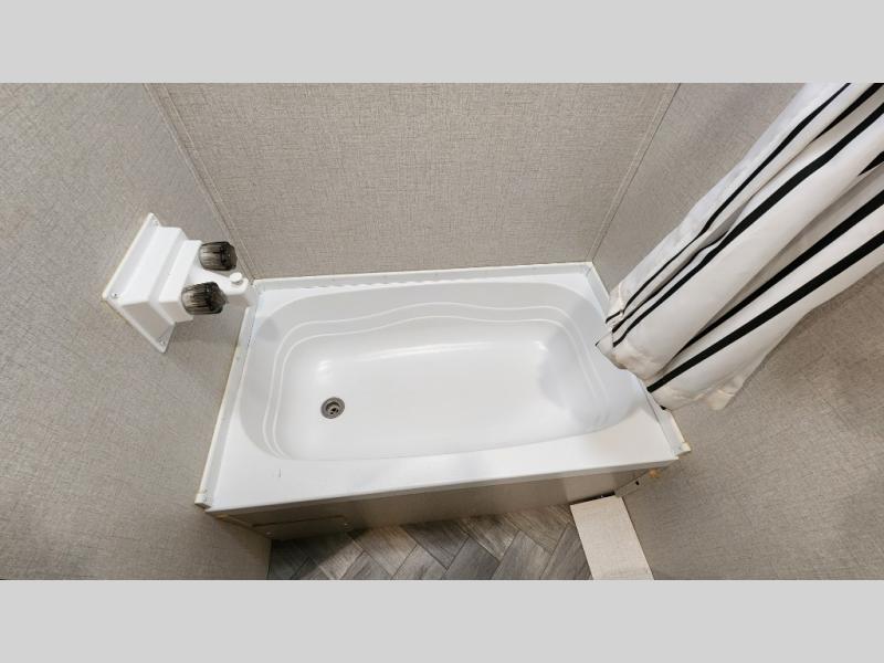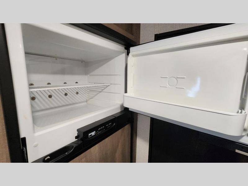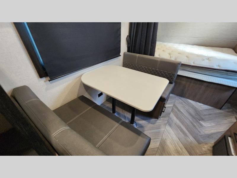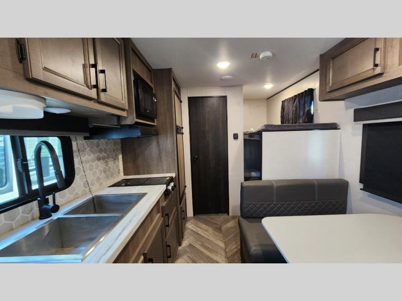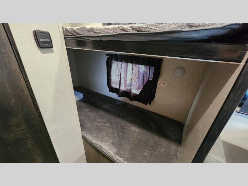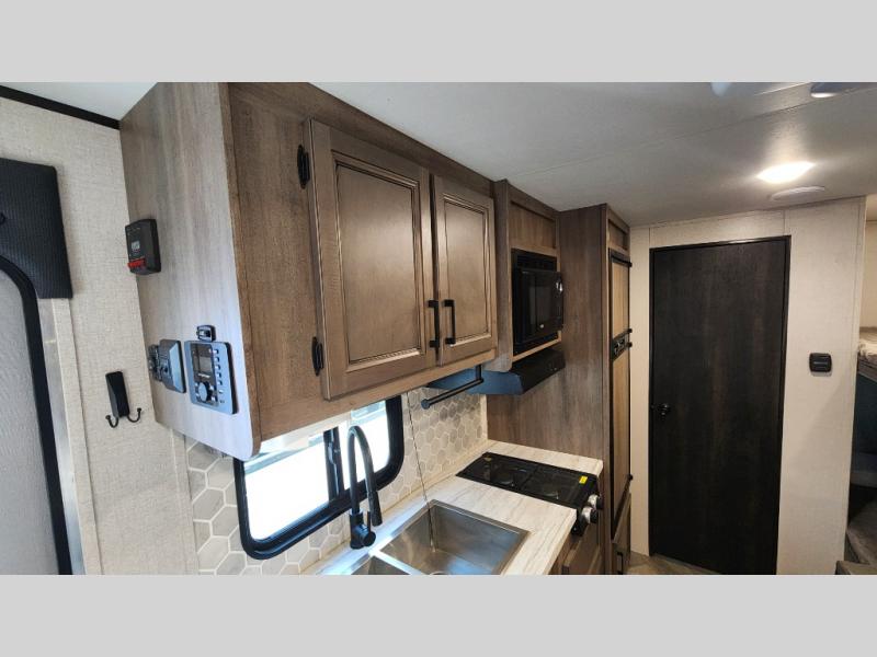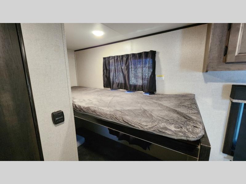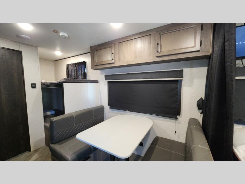 This Olympia Sport travel trailer will be your family's new favorite friend! This trailer can sleep five people because of the bunk beds, booth dinette, and front bed. It also provides you with a bathroom so that you stay clean, and there is a kitchen with all of the amenities needed to create dinner. You have a microwave for easy meals or fast snacks, a 6-cubic foot refrigerator for storing your milk and eggs, and a two-burner range for sautéing some veggies. As you sit outside underneath the 13' power awning, you'll be able to use the marine-grade exterior speakers to listen to the AM/FM/Bluetooth radio, and there is an exterior storage compartment for your gear.
