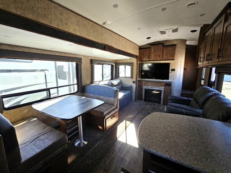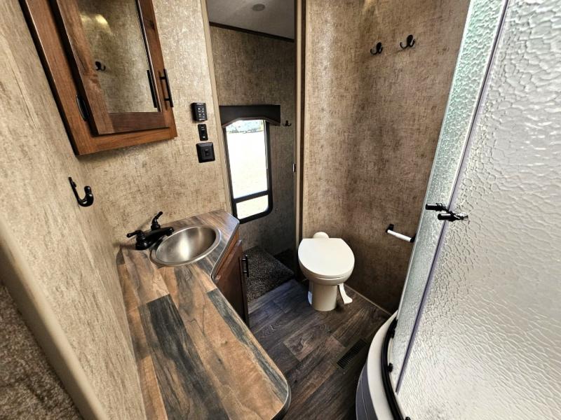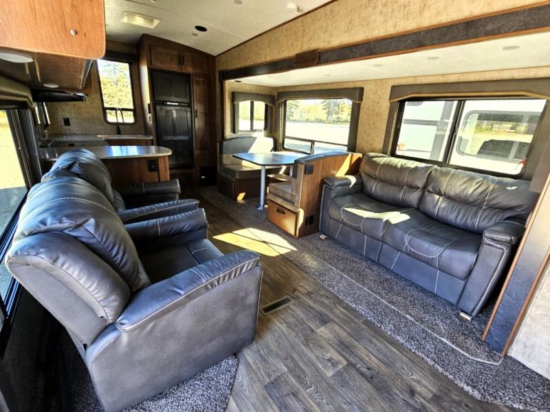 The chef will love all of the countertop space provided in the rear kitchen of this fifth wheel! The 45" x 84" mountain dinette is not only great for enjoying a meal or playing a card game, but also for transforming into an extra sleeping space. The sleeper sofa can also transform into an extra sleeping space. The two lounge recliners are the perfect spot to watch your favorite movie at night on the 50" swing out TV or you can head to the dual entry bathroom and get cleaned up in the radius shower with a skylight above it. You even have access into the front private bedroom from the bathroom!