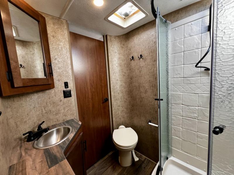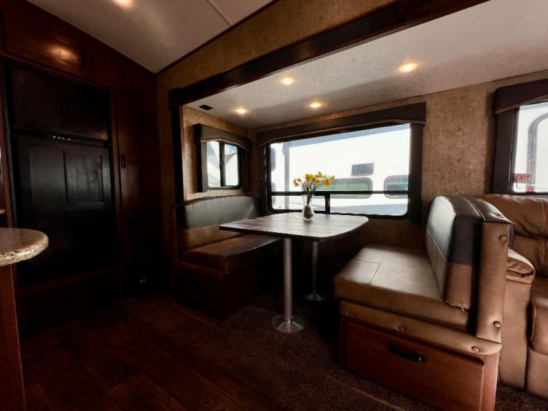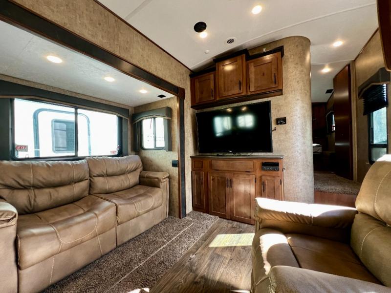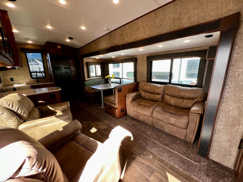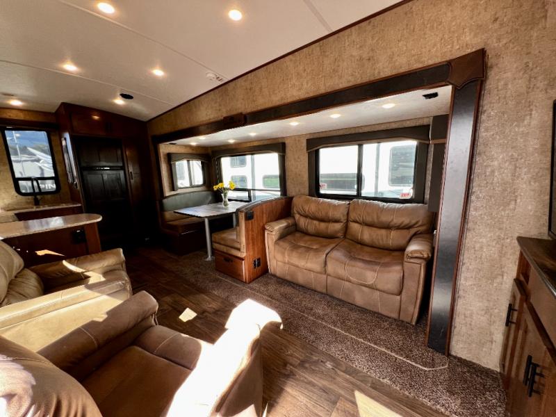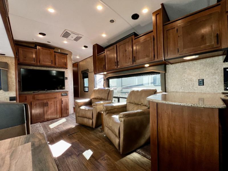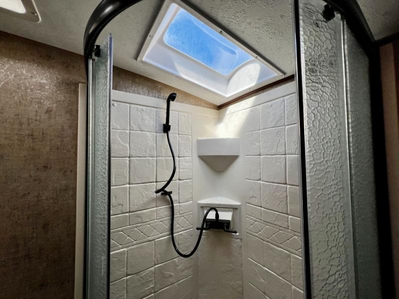 The chef will love all of the countertop space provided in the rear kitchen of this fifth wheel! The 45" x 84" mountain dinette is not only great for enjoying a meal or playing a card game, but also for transforming into an extra sleeping space. The sleeper sofa can also transform into an extra sleeping space. The two lounge recliners are the perfect spot to watch your favorite movie at night on the 50" swing out TV or you can head to the dual entry bathroom and get cleaned up in the radius shower with a skylight above it. You even have access into the front private bedroom from the bathroom!