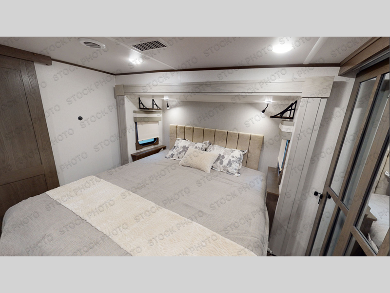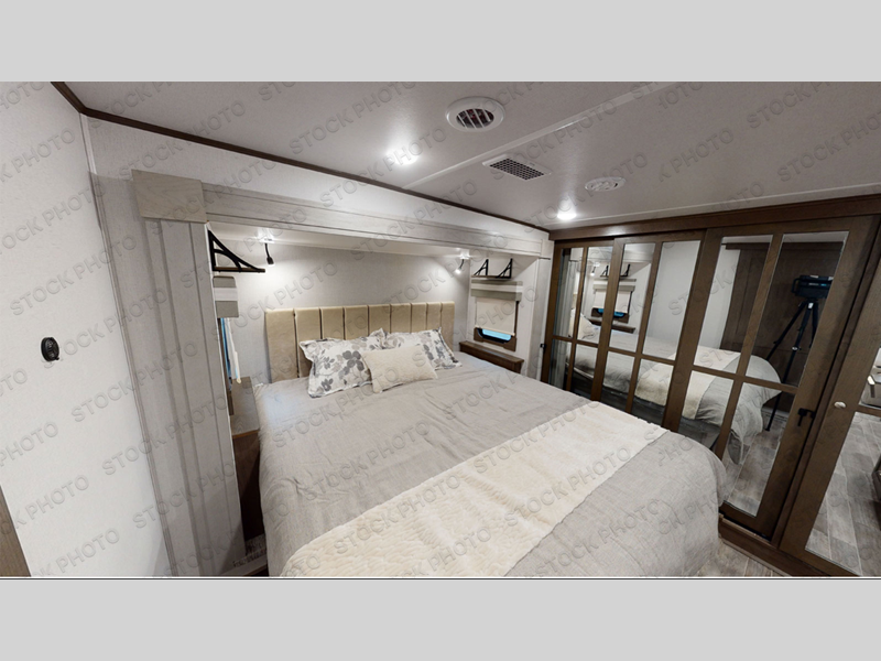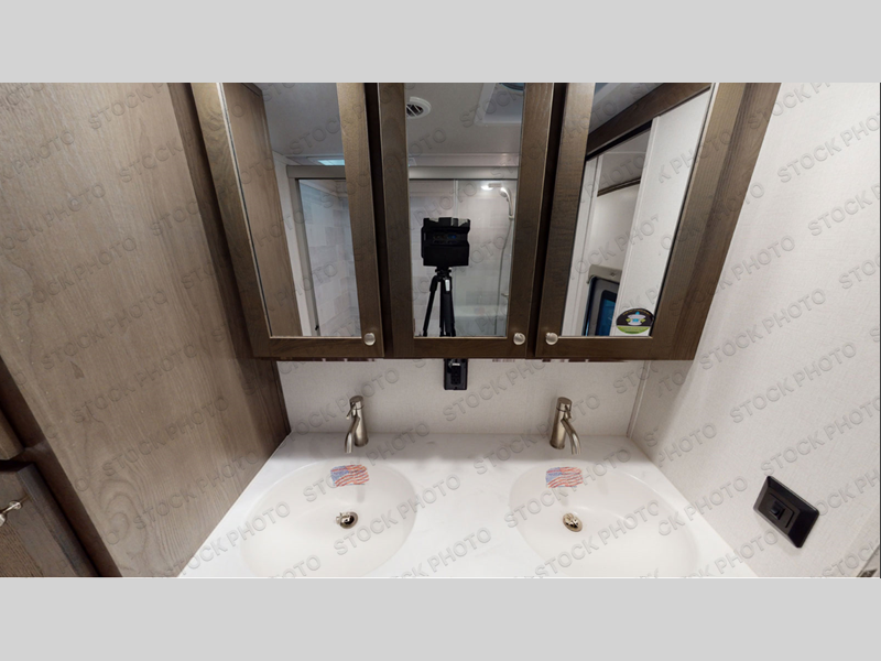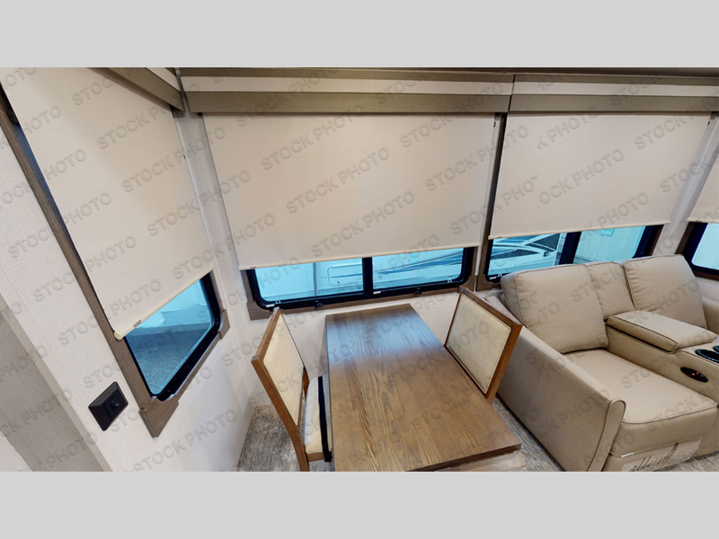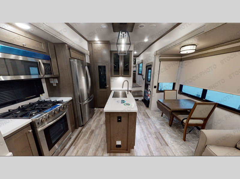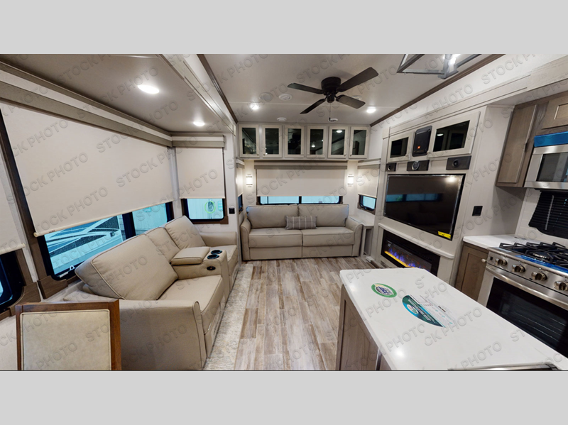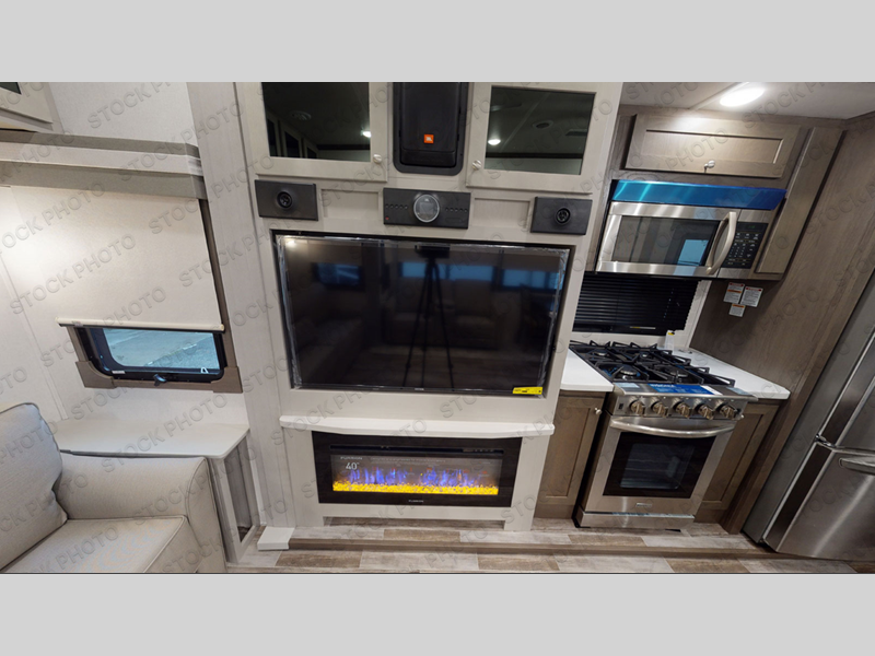 Experience a true home away from home in this fifth wheel! With a rear living area featuring an entertainment center with a fireplace and 50" TV with JBL sound system, a 88" split tri-fold sofa, and a 65" power theater seating, you can be sure to have a relaxing evening. The kitchen island makes meal prepping easier and the four burner Insignia cooktop lets you cook more at one time. Once your meal is ready, head to the table and chairs to enjoy it there then maybe play a card game or two. The full bathroom not only has a large signature spa shower with a a teak flip up seat, a linen area, and a closet, but also a dual sink vanity for two to get ready at once. You will feel right at home in the front private bedroom with the king bed slide across from the dresser with a 32" TV, and a front wardrobe with mirrored sliding doors which is also prepped to add an optional washer and dryer!