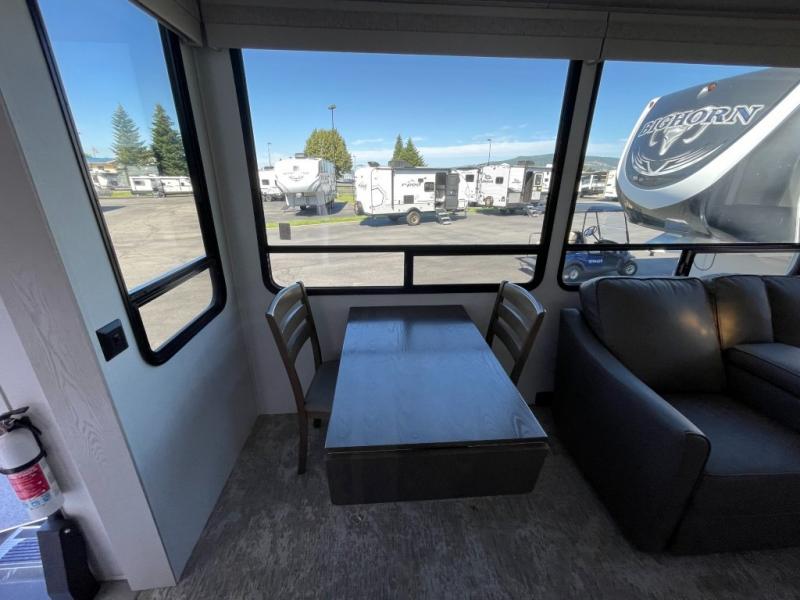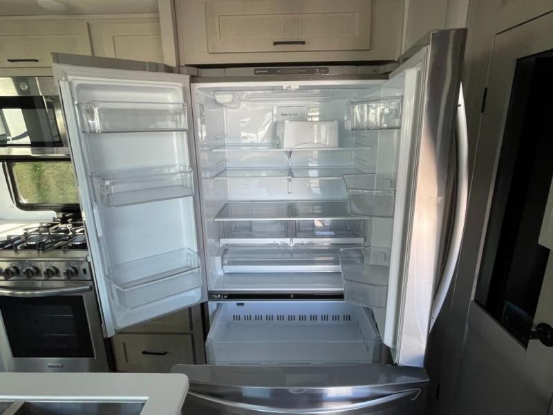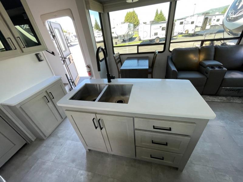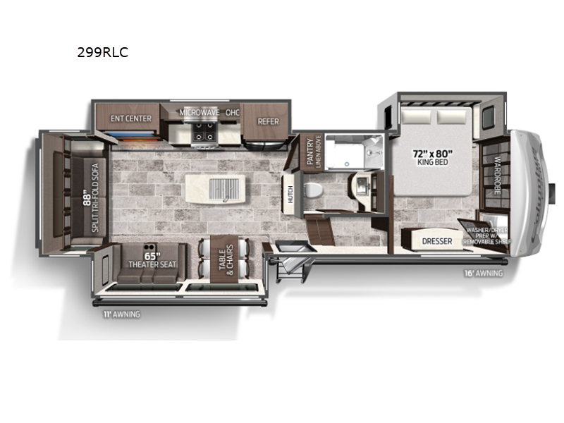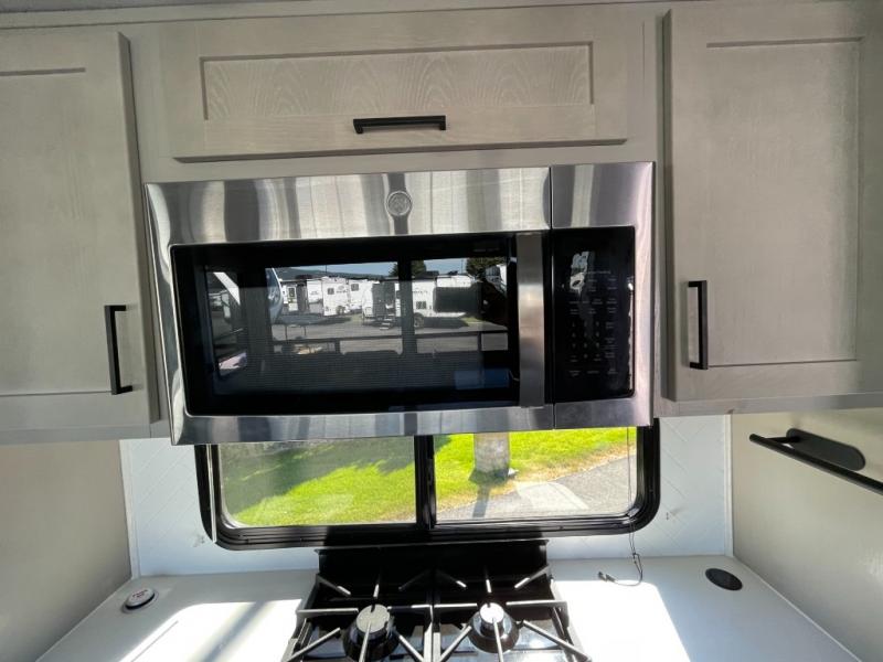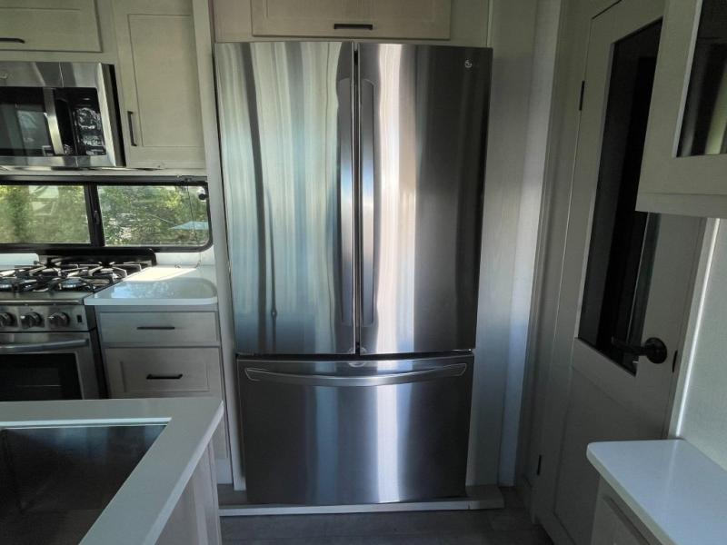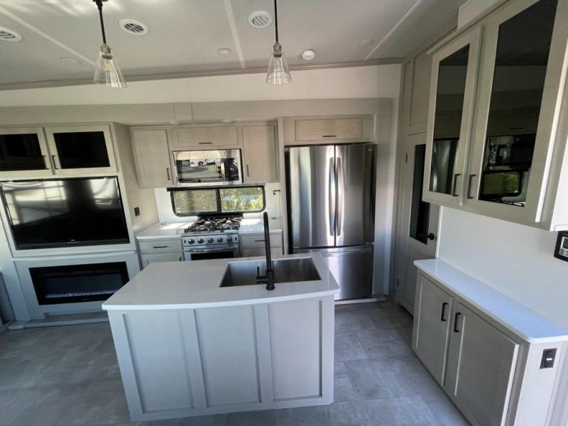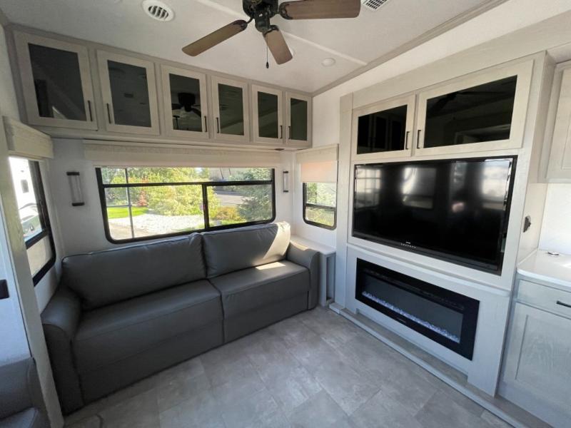Whether you're camping with family or friends, you'll love every minute spent in this fifth wheel! There are residential size appliances, including a four burner Insignia cooktop and a 20 cu. ft. residential refrigerator. The chef of your group will love the kitchen island to prep meals on, and a hutch to store nice dishes. After dinner is cleaned up, relax on the power theater seat that sits directly across from the entertainment center with a 50" TV. You will also find a split tri-fold sofa and a table with four chairs for extra sleeping space and dining space. The full bath includes a large shower with surround and a seat, plus built in shelves for all your necessities. And don't overlook the front bedroom with its king bed slide out, large wardrobe with sliding mirror doors, plus a space to add an optional washer and dryer that will make being away from home easier than ever!