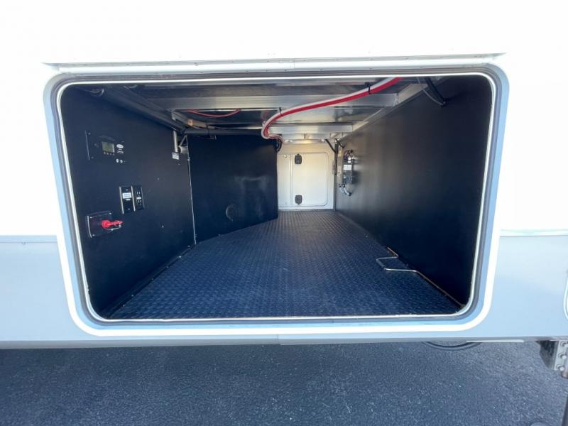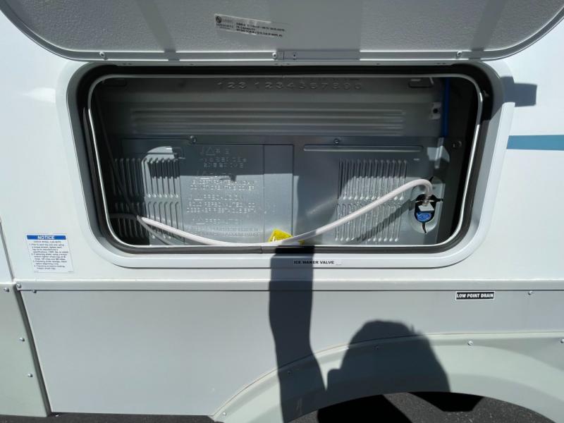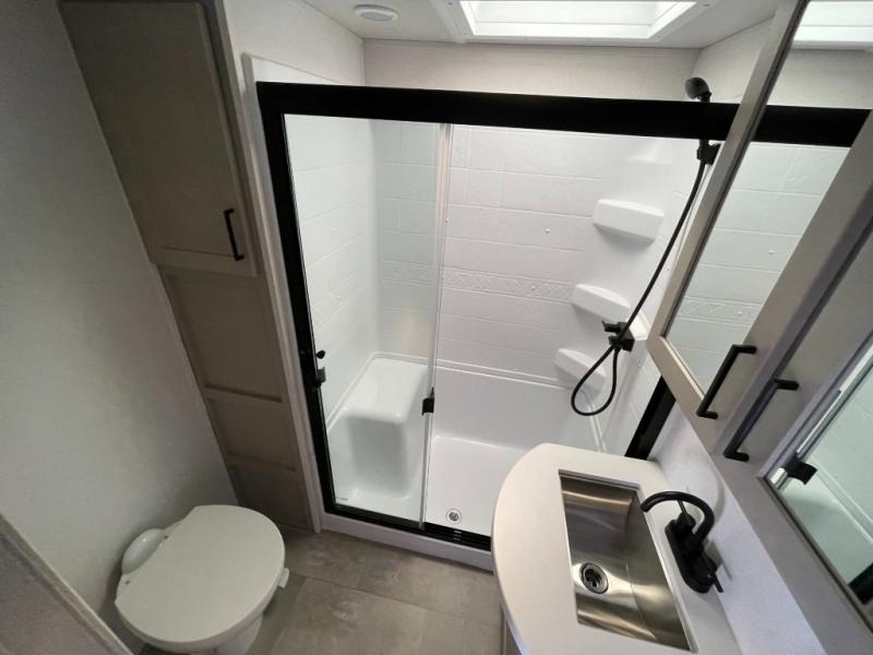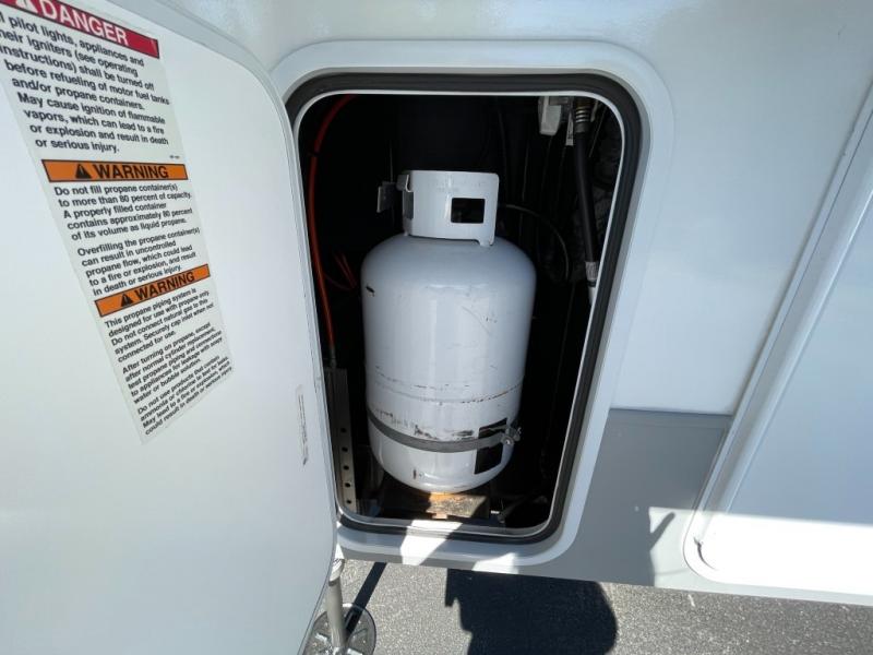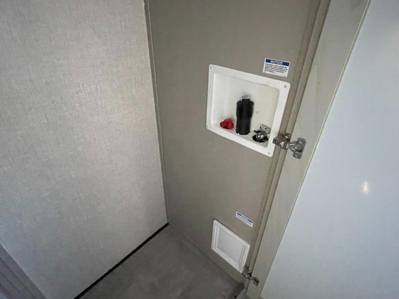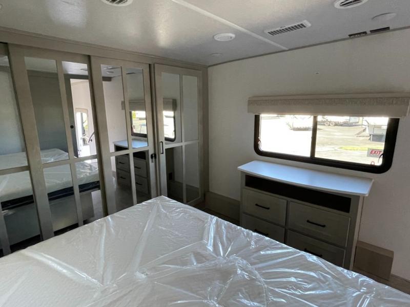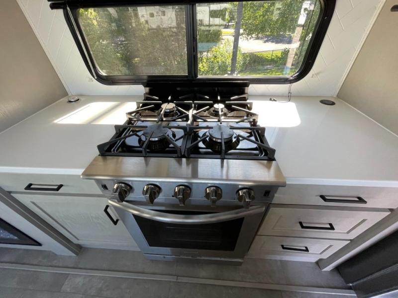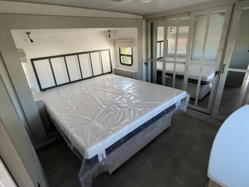 Whether you're camping with family or friends, you'll love every minute spent in this fifth wheel! There are residential size appliances, including a four burner Insignia cooktop and a 20 cu. ft. residential refrigerator. The chef of your group will love the kitchen island to prep meals on, and a hutch to store nice dishes. After dinner is cleaned up, relax on the power theater seat that sits directly across from the entertainment center with a 50" TV. You will also find a split tri-fold sofa and a table with four chairs for extra sleeping space and dining space. The full bath includes a large shower with surround and a seat, plus built in shelves for all your necessities. And don't overlook the front bedroom with its king bed slide out, large wardrobe with sliding mirror doors, plus a space to add an optional washer and dryer that will make being away from home easier than ever!